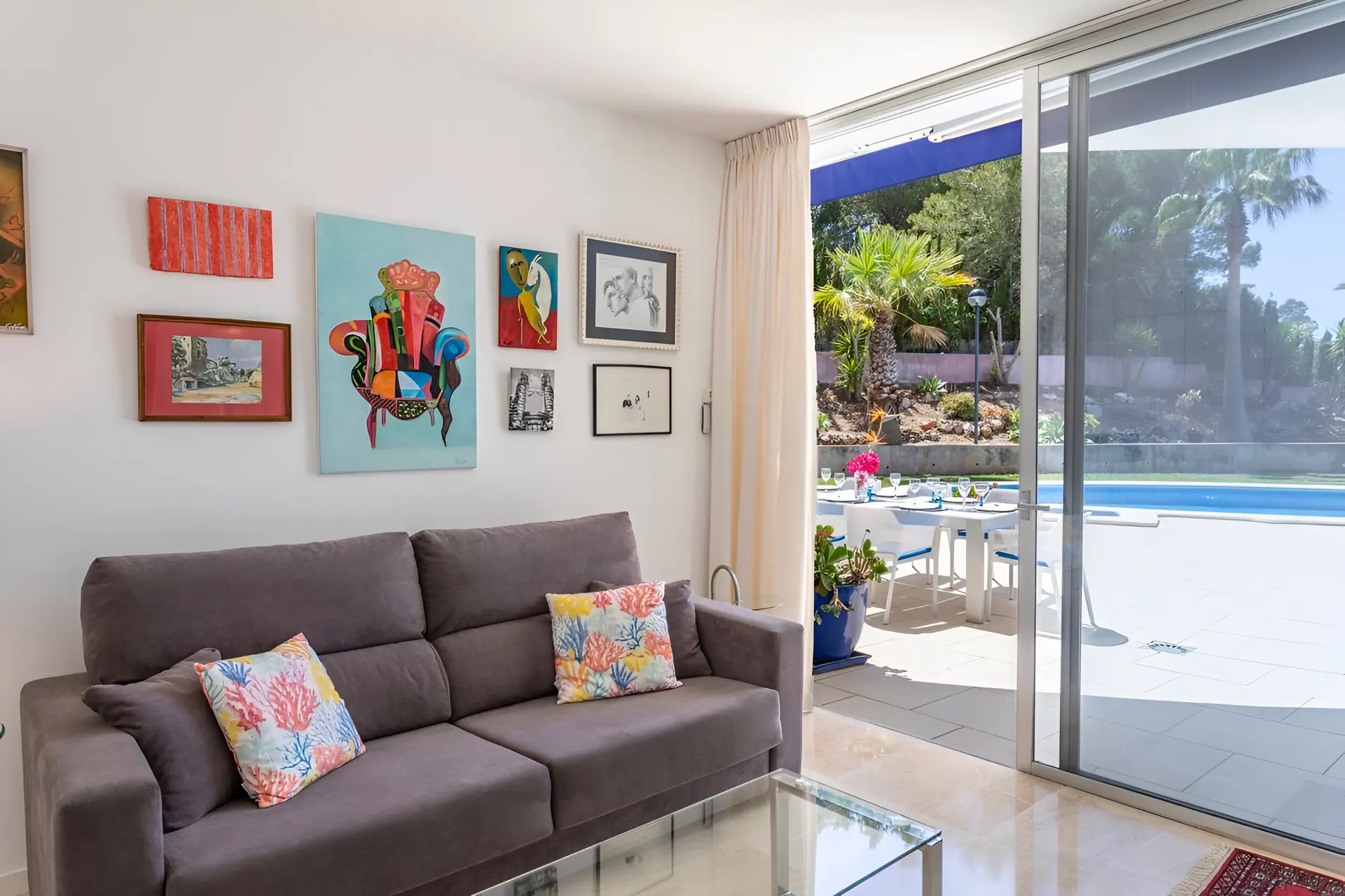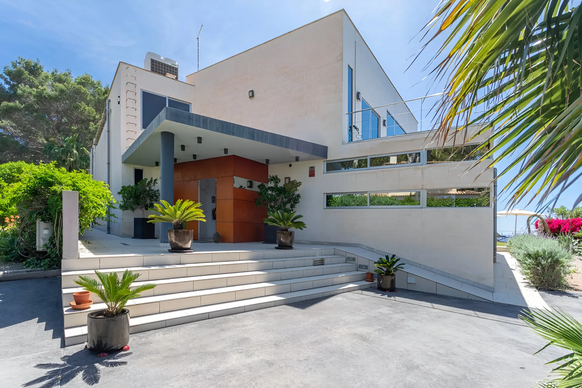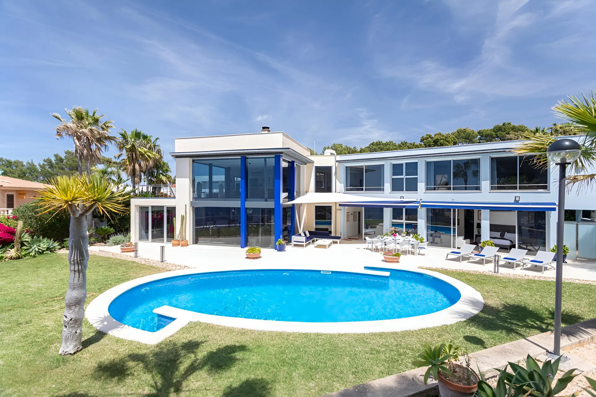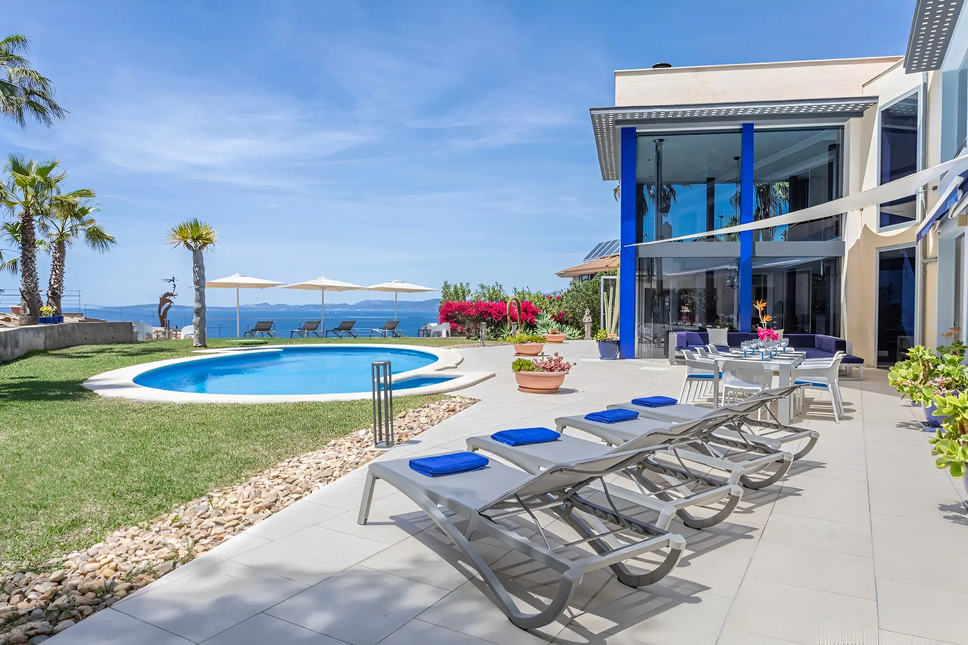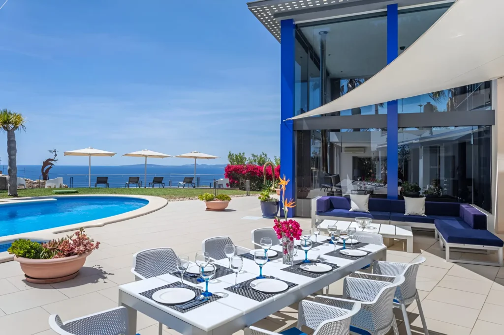 Perched in the tranquil coastal community of Badia Blava, this elegant luxury villa in Palma Bay offers breathtaking panoramic views across the Mediterranean and Mallorca’s southern coastline. Designed in a contemporary style with generous indoor and outdoor spaces, the property provides an exceptional setting for a relaxing holiday in Mallorca. Natural light floods the interiors, while large windows frame the sea from nearly every corner of the home, creating a seamless connection between the villa and its spectacular surroundings. With four bedrooms and spacious living areas, the villa comfortably accommodates up to eight guests seeking privacy, comfort and unforgettable sea views.