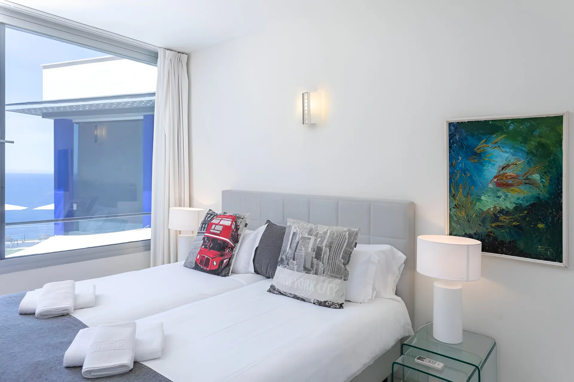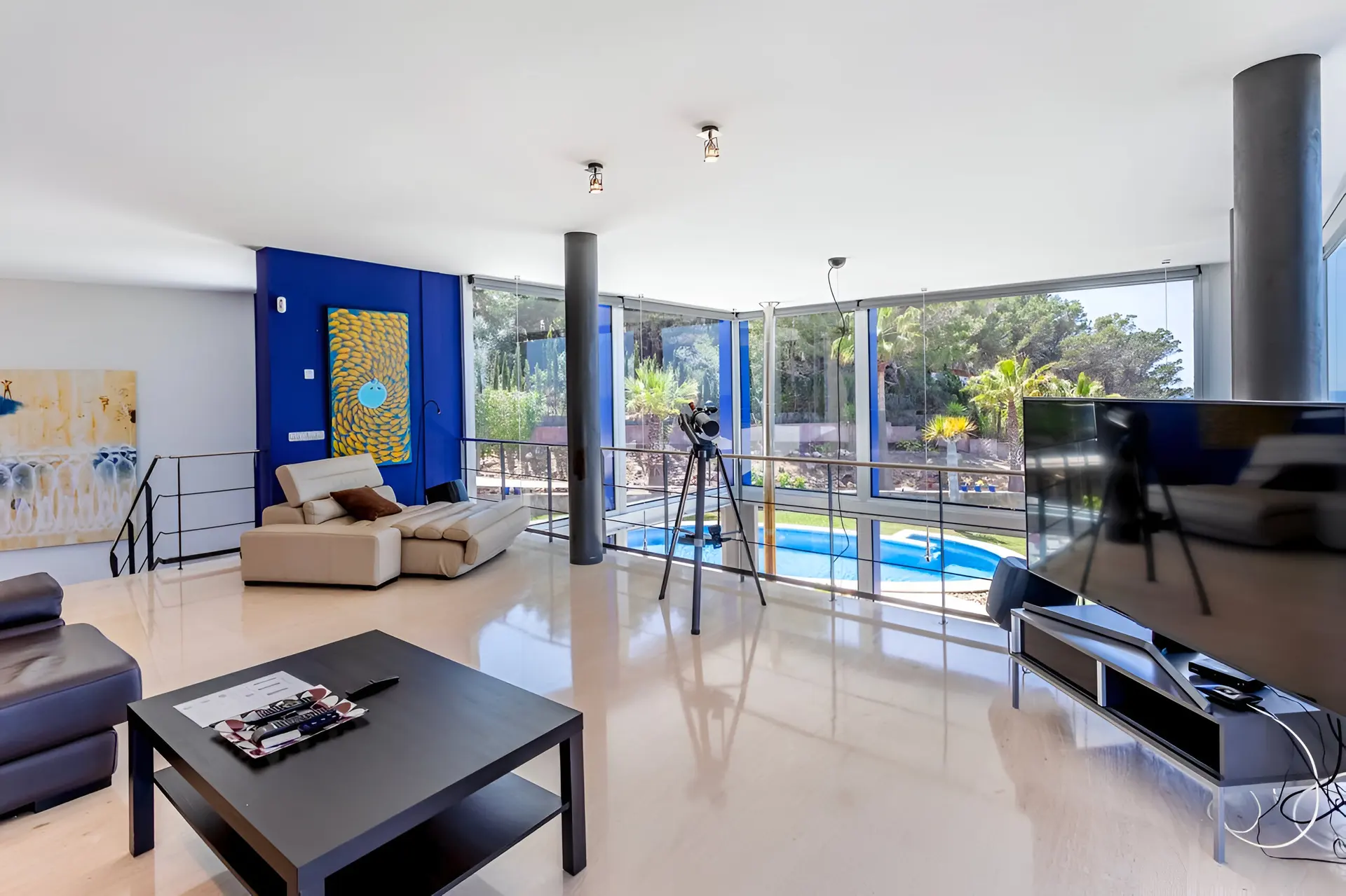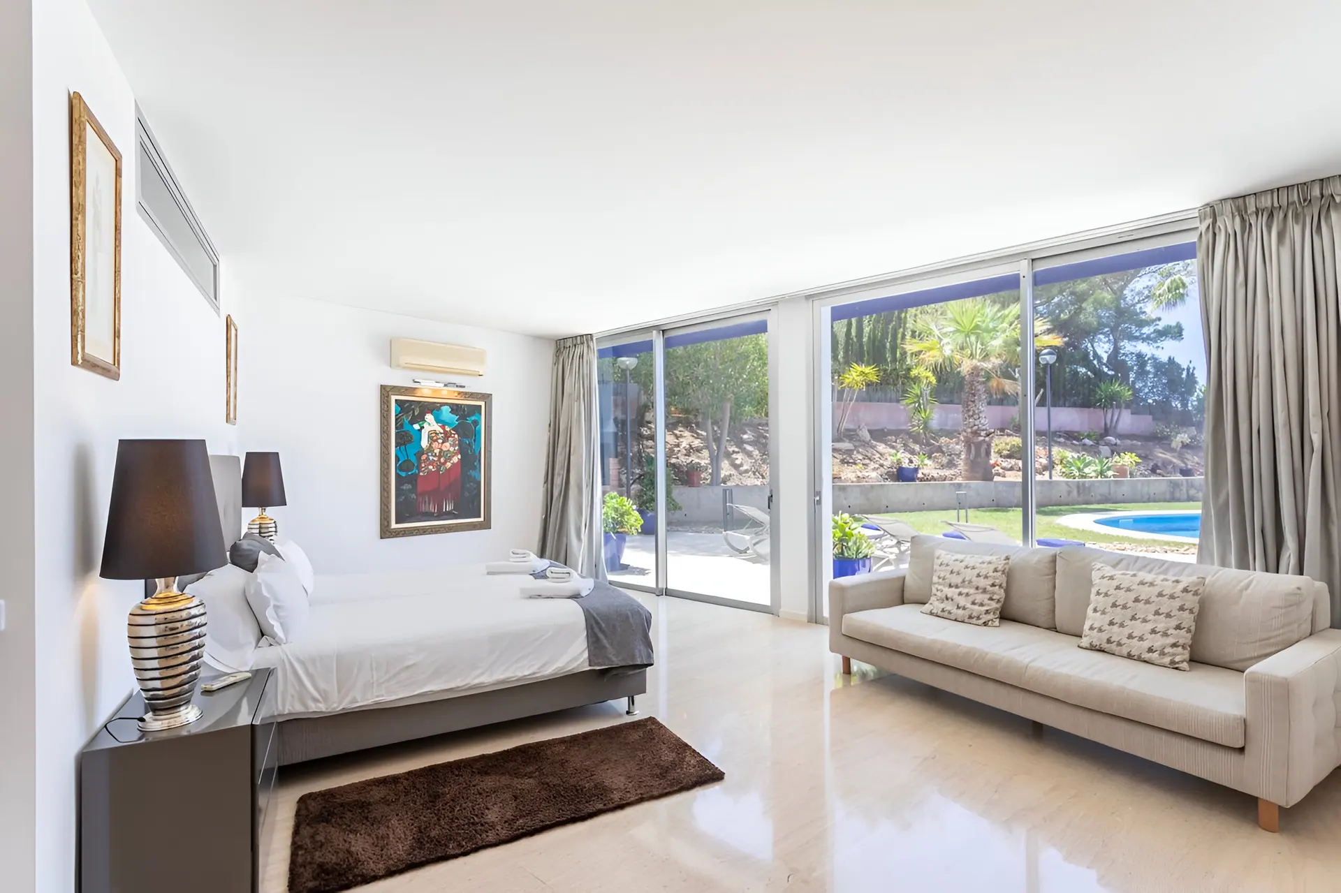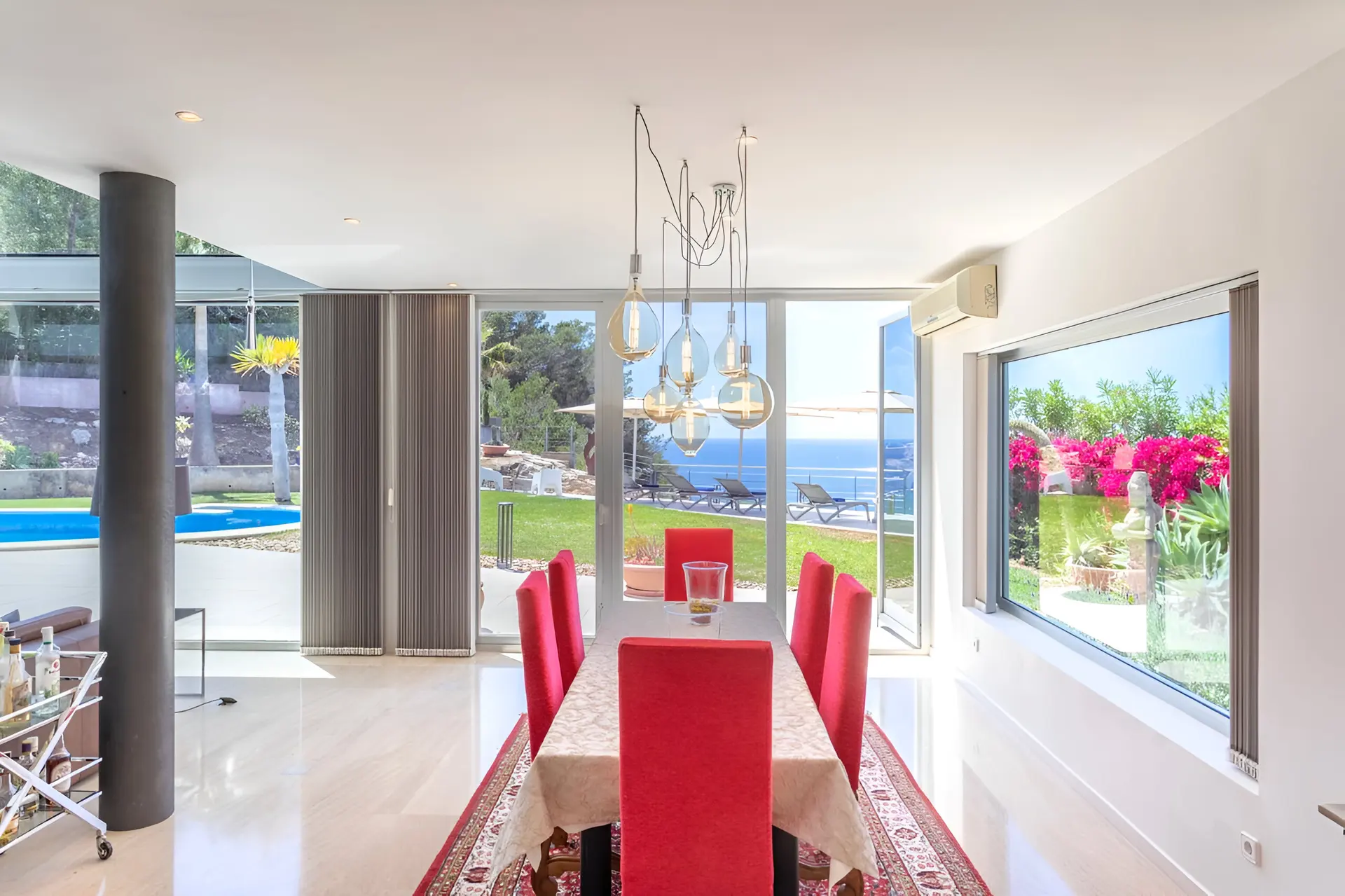 Perched in the tranquil coastal community of Badia Blava, this elegant luxury villa in Palma Bay offers breathtaking panoramic views across the Mediterranean and Mallorca’s southern coastline. Designed in a contemporary style with generous indoor and outdoor spaces, the property provides an exceptional setting for a relaxing holiday in Mallorca. Natural light floods the interiors, while large windows frame the sea from nearly every corner of the home, creating a seamless connection between the villa and its spectacular surroundings. With four bedrooms and spacious living areas, the villa comfortably accommodates up to eight guests seeking privacy, comfort and unforgettable sea views.