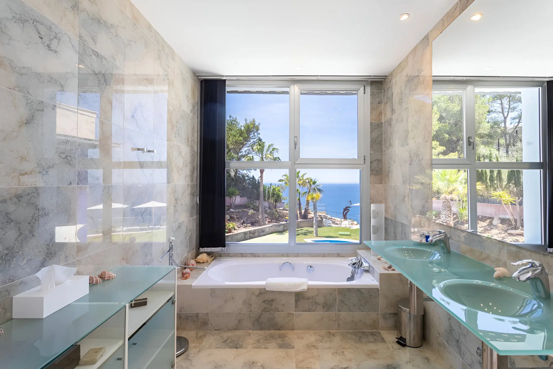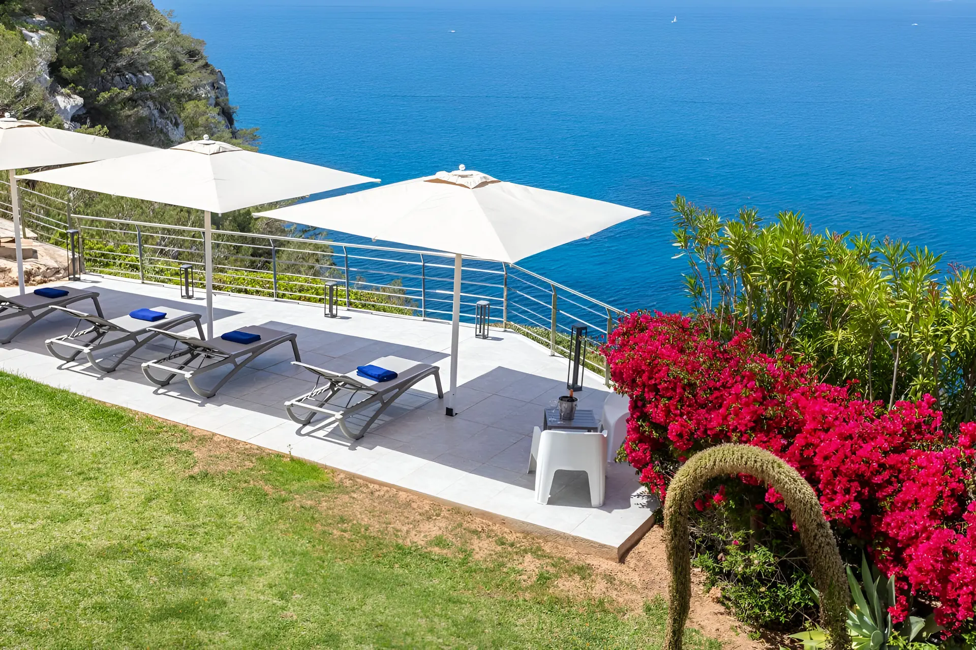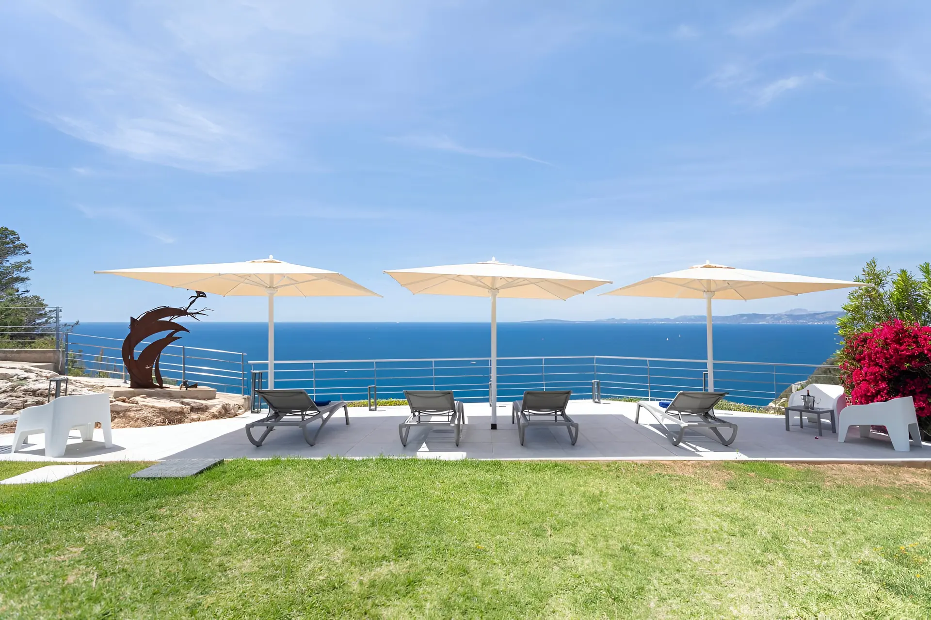 The outdoor spaces are designed to embrace Mallorca’s sunny climate and stunning coastal scenery. A beautifully landscaped garden surrounds the villa, featuring a large private swimming pool measuring 11 x 3 metres. Multiple outdoor lounge areas invite guests to unwind in the sun, enjoy alfresco dining or host evening barbecues under the stars. With its peaceful setting, sea breezes and uninterrupted views of the Mediterranean, the terrace and garden create the perfect environment for a relaxing island getaway.