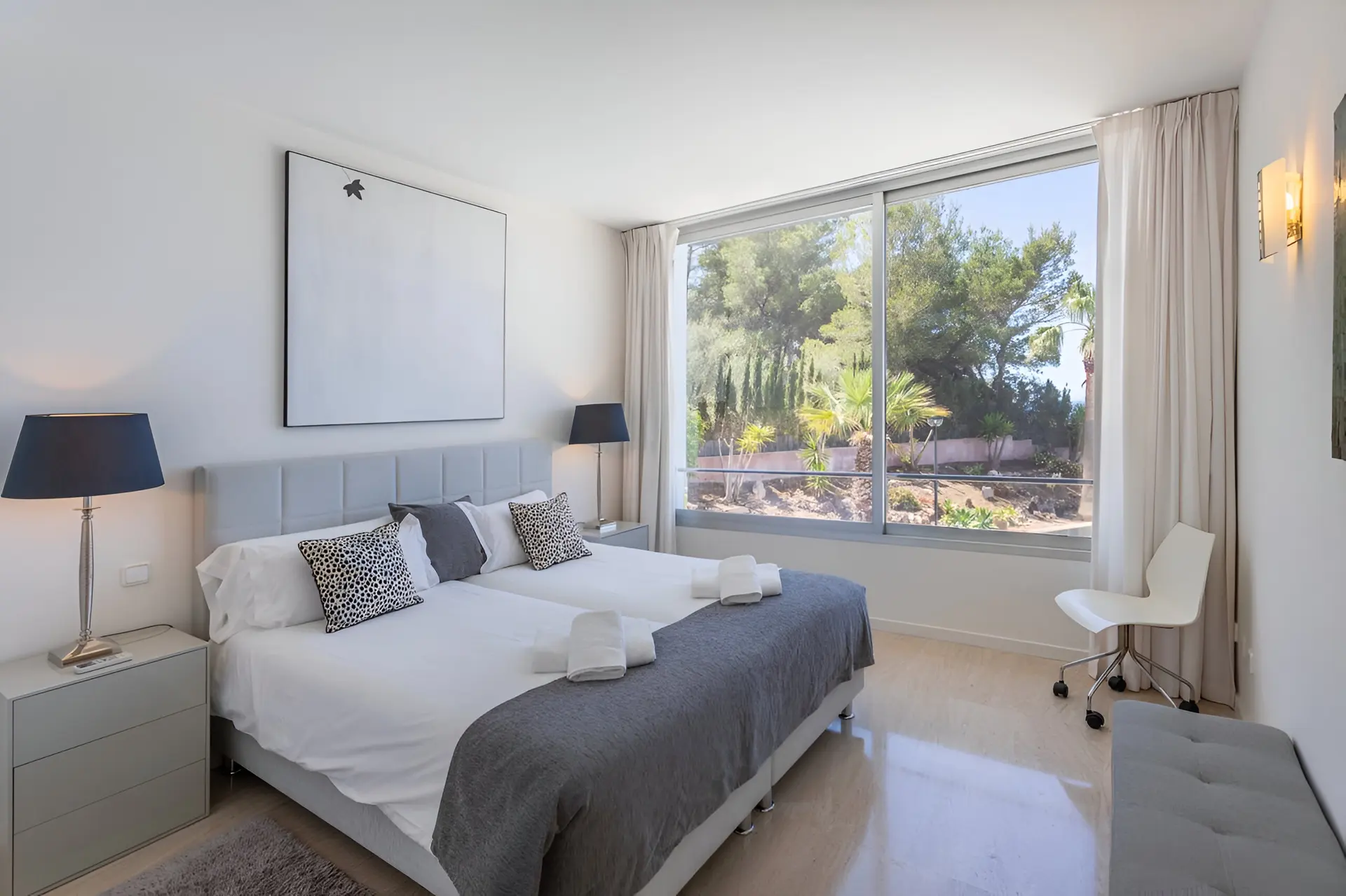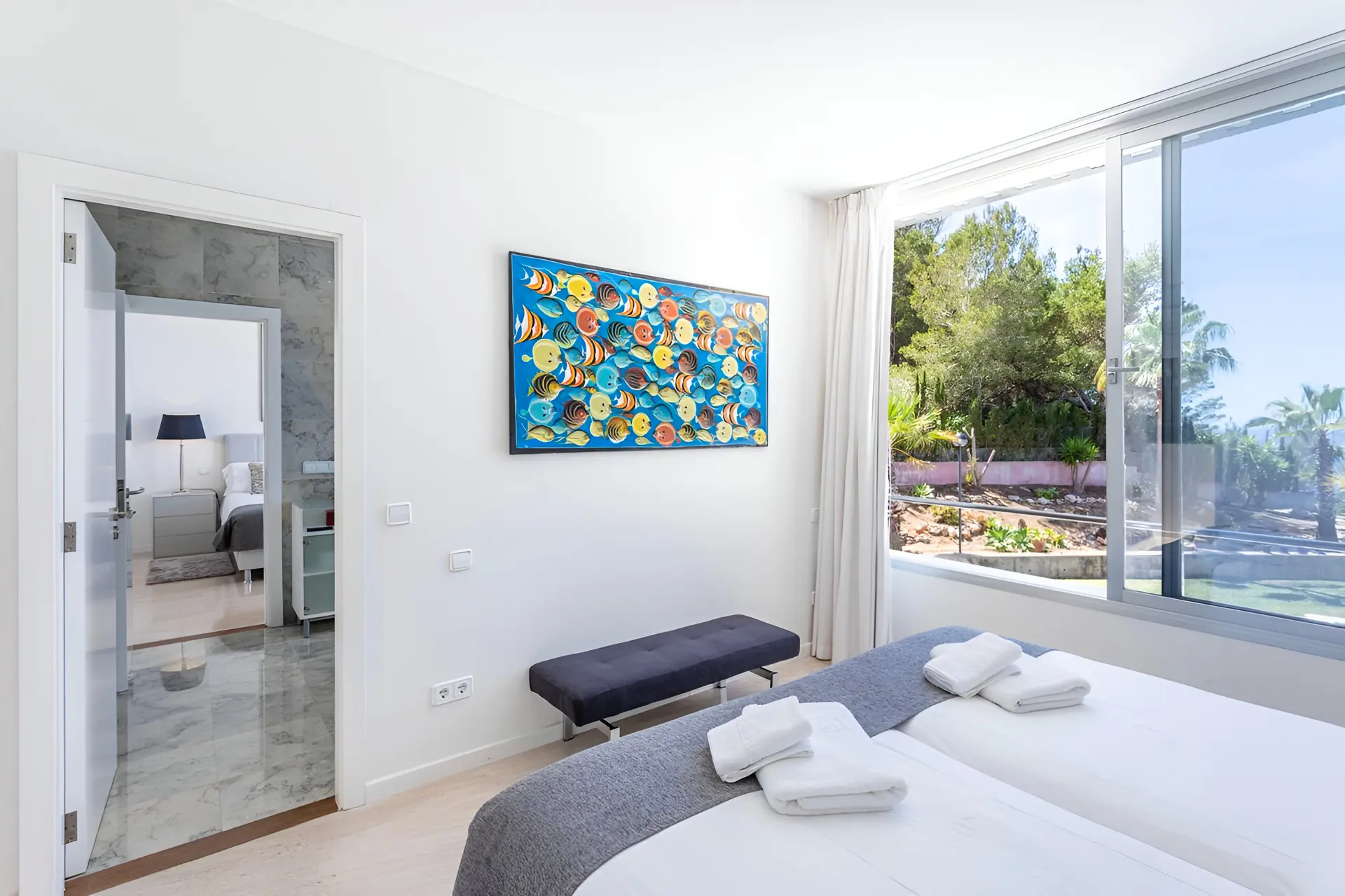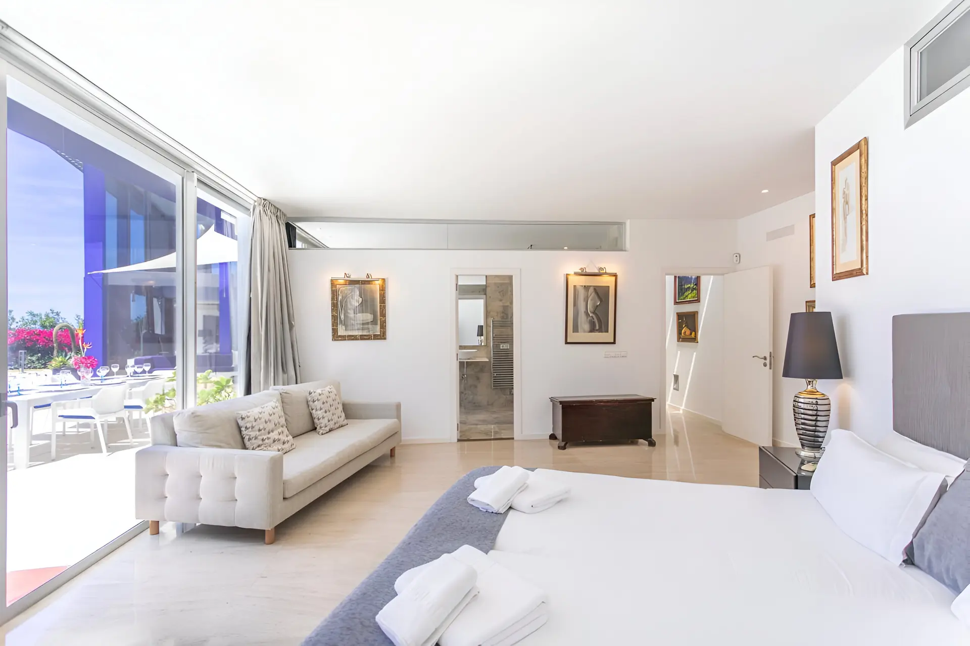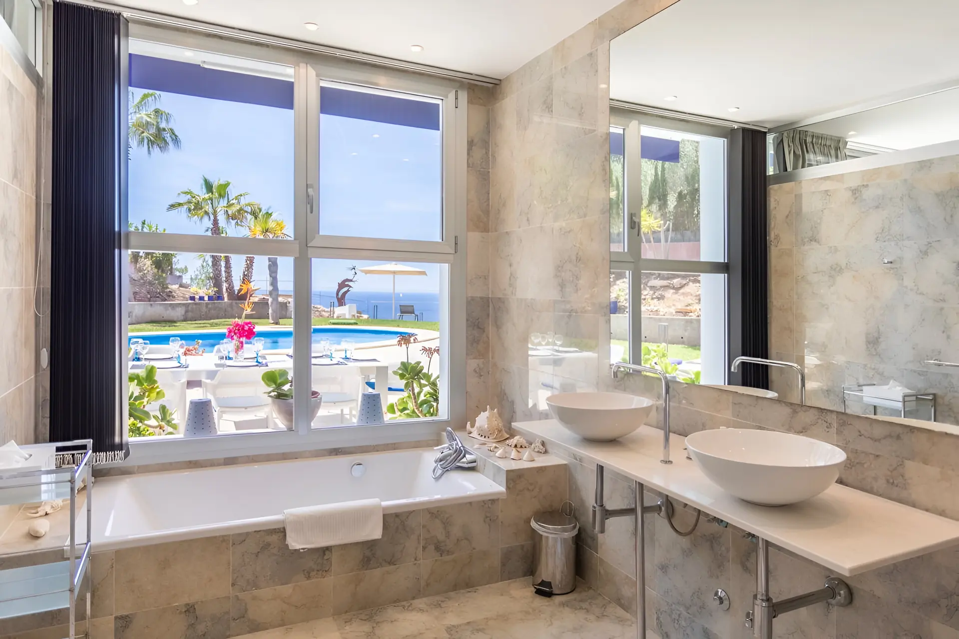 The outdoor spaces are designed to embrace Mallorca’s sunny climate and stunning coastal scenery. A beautifully landscaped garden surrounds the villa, featuring a large private swimming pool measuring 11 x 3 metres. Multiple outdoor lounge areas invite guests to unwind in the sun, enjoy alfresco dining or host evening barbecues under the stars. With its peaceful setting, sea breezes and uninterrupted views of the Mediterranean, the terrace and garden create the perfect environment for a relaxing island getaway.