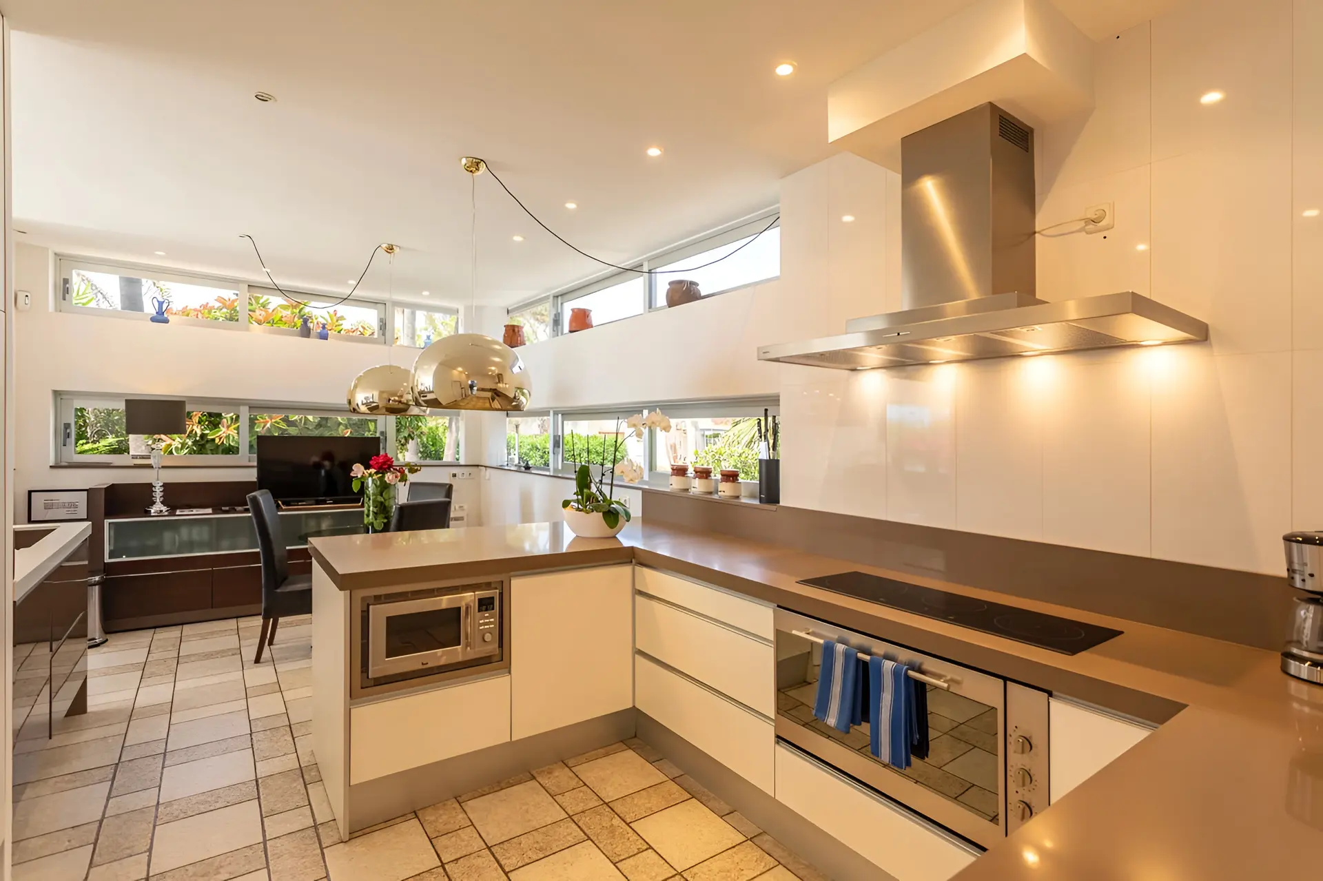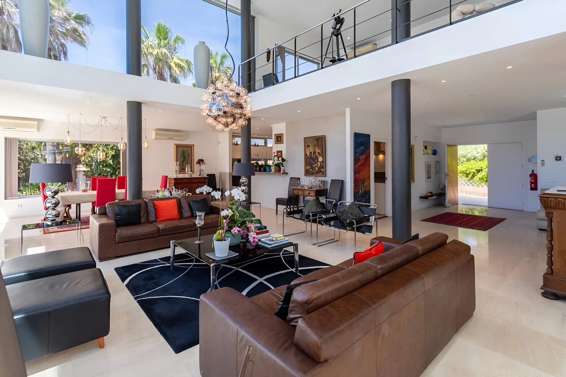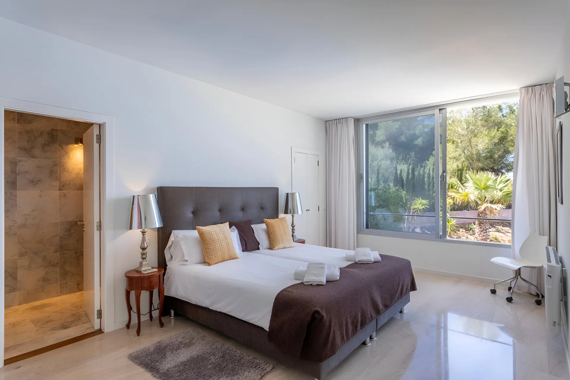 Inside, the villa features a bright open-plan layout designed for modern Mediterranean living. The main living room flows effortlessly into a spacious dining area and fully equipped kitchen, ideal for social gatherings and relaxed family meals. On the ground floor, a master bedroom with an en-suite bathroom sits alongside a secondary lounge that looks out towards the garden and sea. Upstairs, a stylish chill-out lounge opens onto a large terrace where guests can enjoy spectacular sunset views over Palma Bay. This level also hosts two double bedrooms with a shared bathroom and an additional master suite with its own private bathroom, offering both comfort and privacy for guests.
