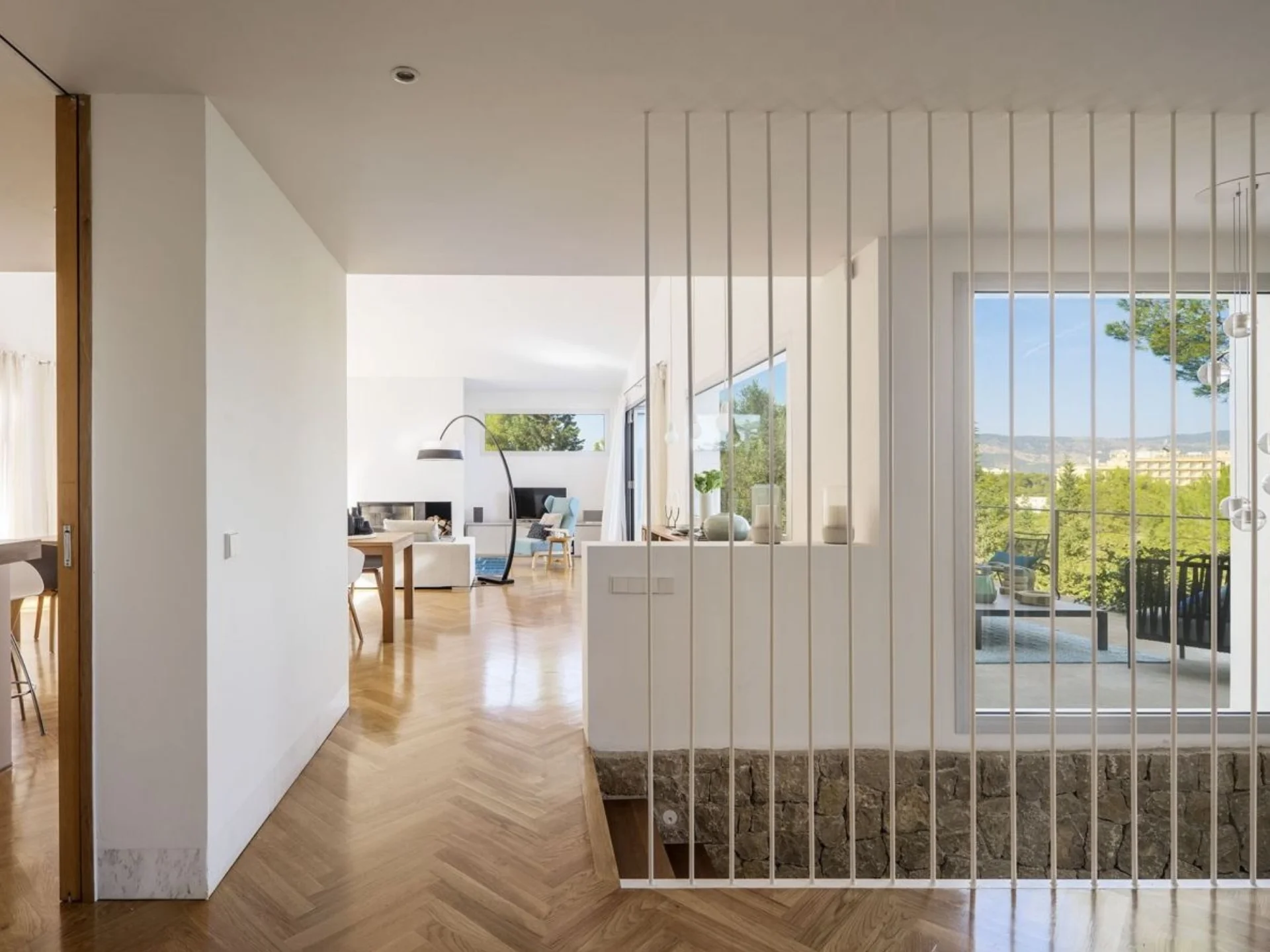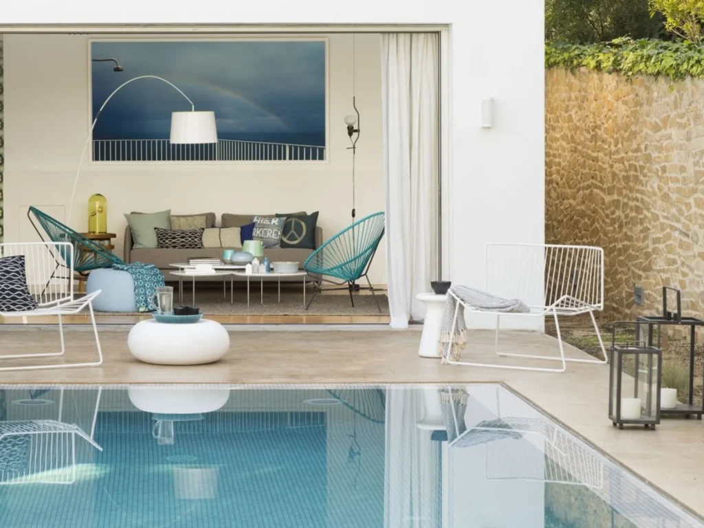Outside, the private swimming pool sits at the heart of the terrace, surrounded by sun loungers and open lounging areas designed for relaxed Mediterranean living. A shaded pergola with a generous dining table creates the perfect setting for long al fresco lunches and warm evenings outdoors. Multiple terraces offer pleasant open views toward Palma Bay and the surrounding coastline, providing inviting spaces to unwind throughout the day.