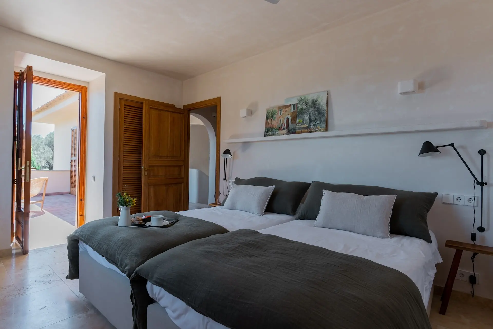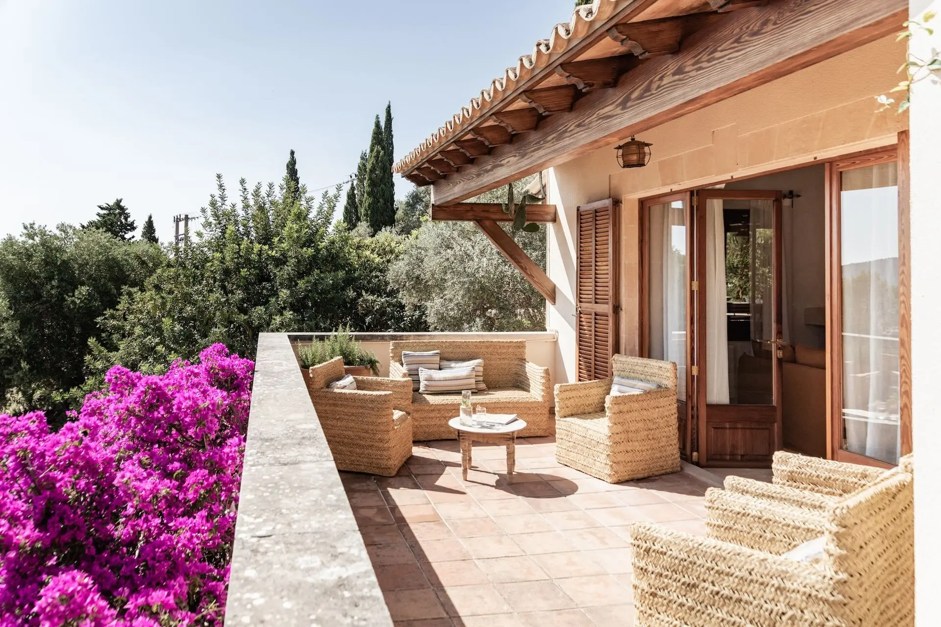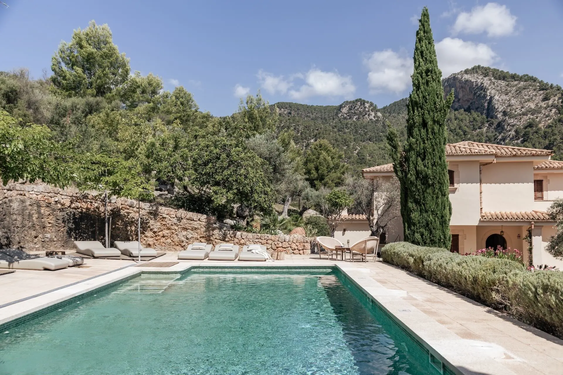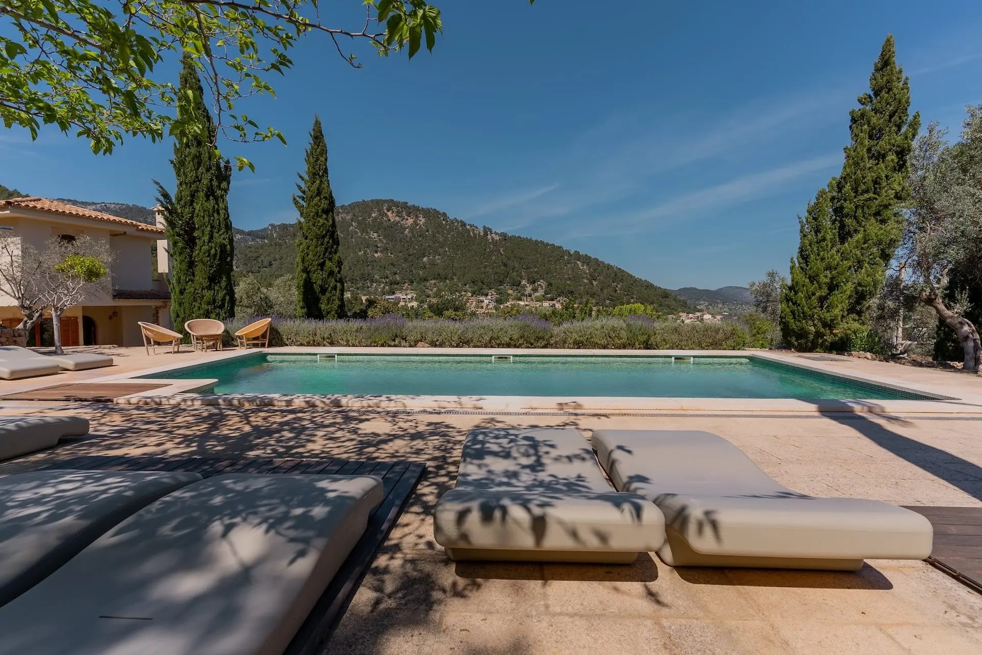 Outdoor living is at the heart of the Son Borrás experience. A 13 × 5 metre private swimming pool sits beside a spacious sun terrace, while several outdoor seating and dining areas invite long Mediterranean afternoons and evenings under the stars. The surrounding gardens are filled with lavender, bougainvillea, olive trees, and cypress, creating a fragrant and colourful landscape.