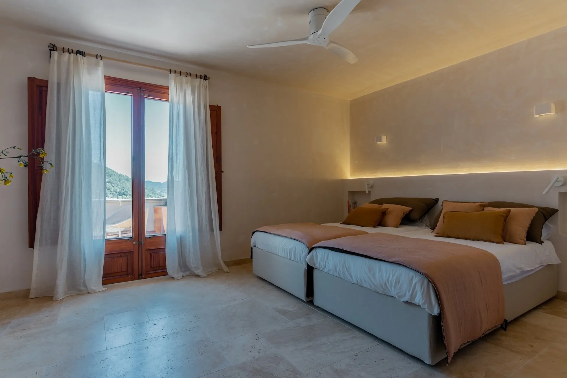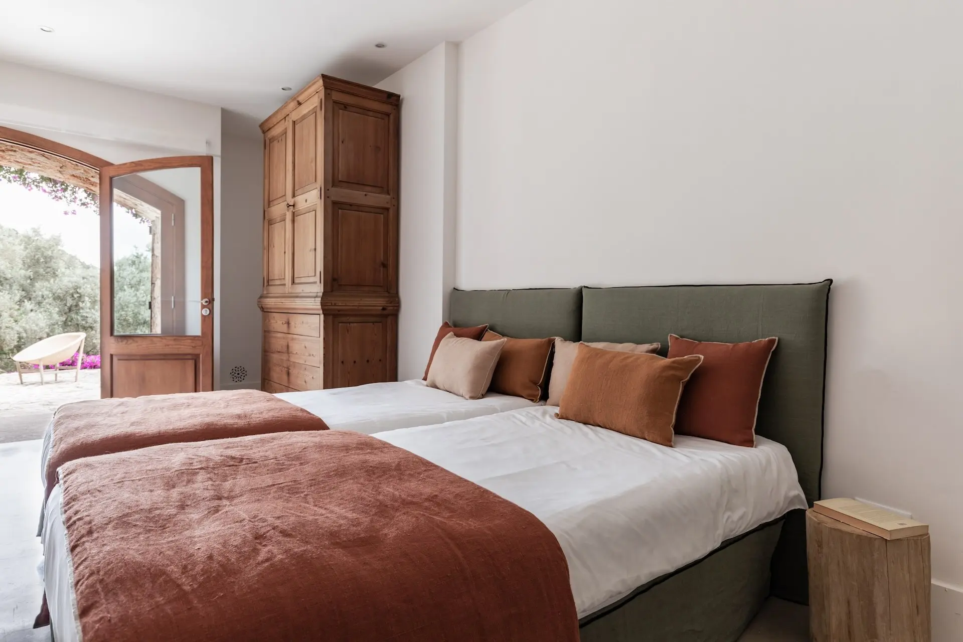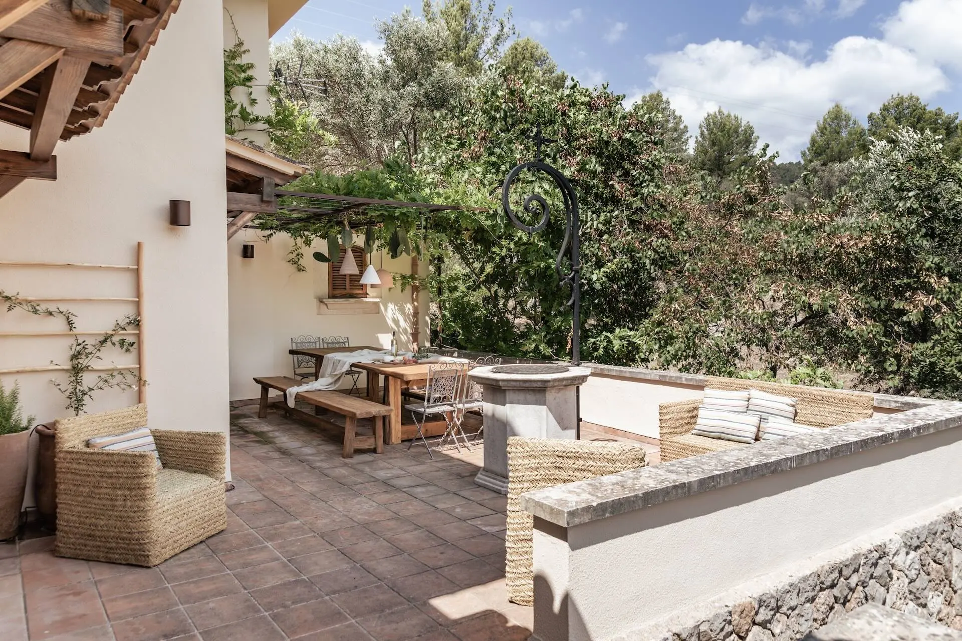 Outdoor living is at the heart of the Son Borrás experience. A 13 × 5 metre private swimming pool sits beside a spacious sun terrace, while several outdoor seating and dining areas invite long Mediterranean afternoons and evenings under the stars. The surrounding gardens are filled with lavender, bougainvillea, olive trees, and cypress, creating a fragrant and colourful landscape.
