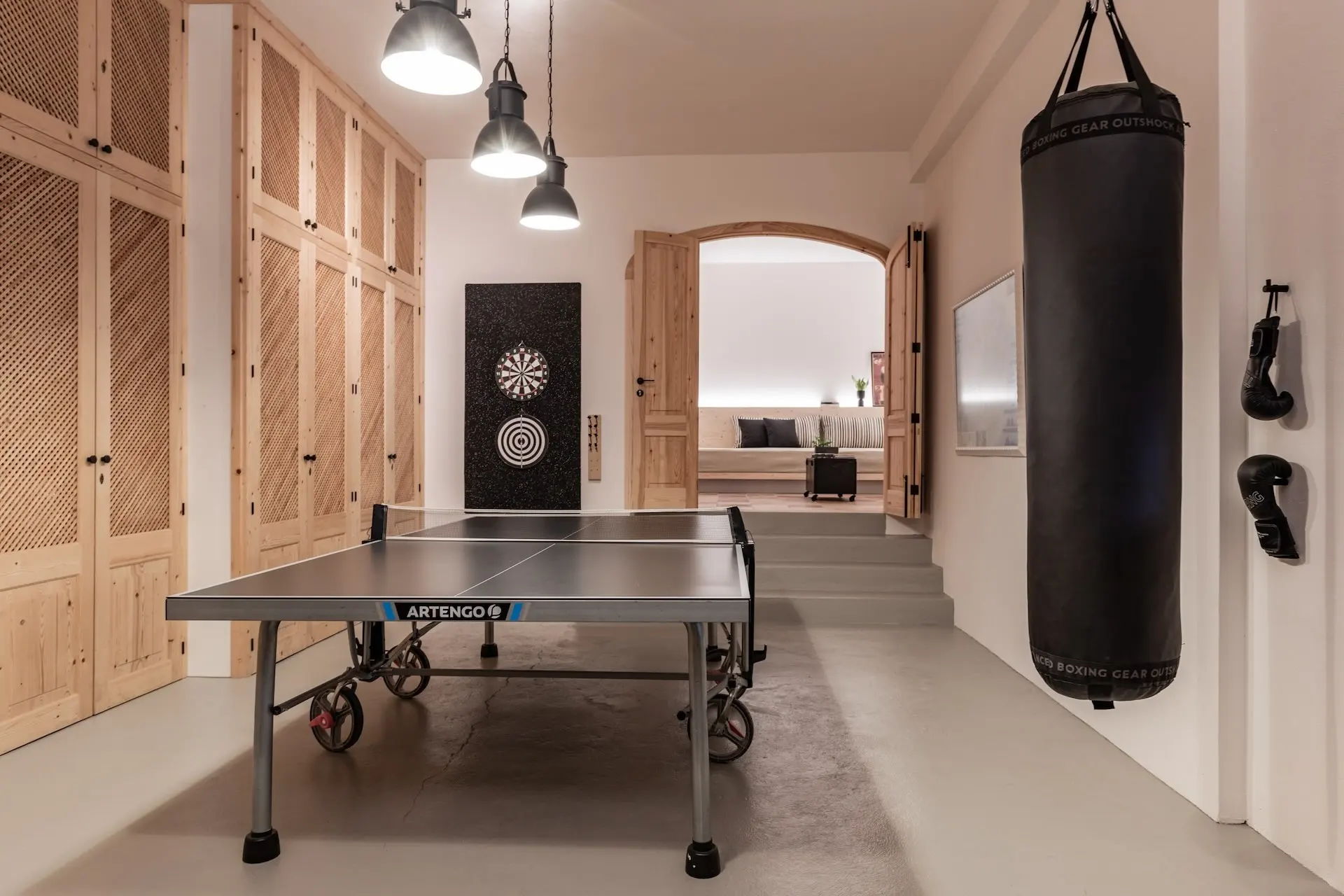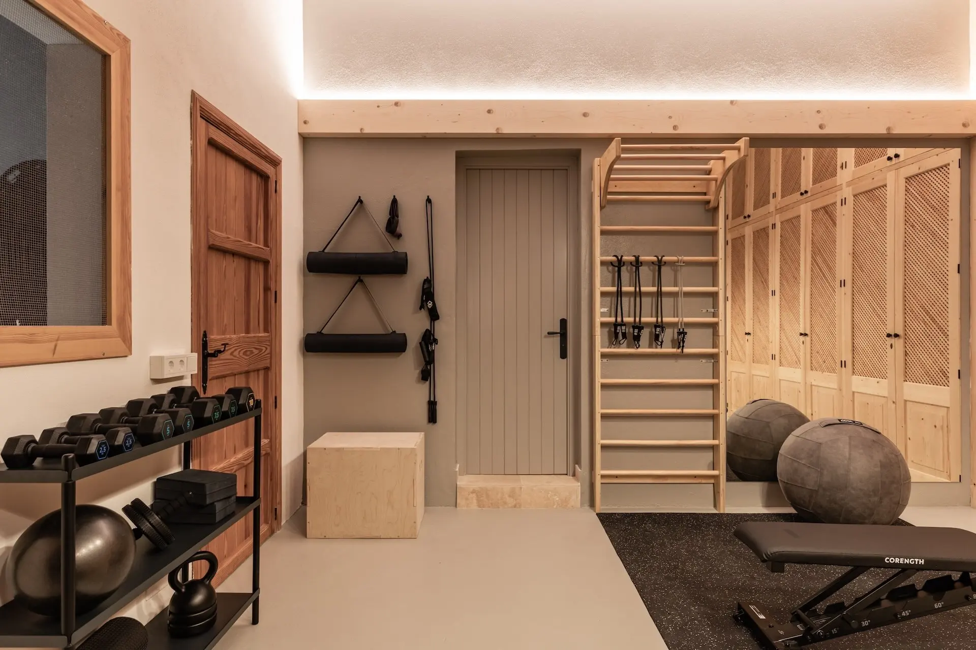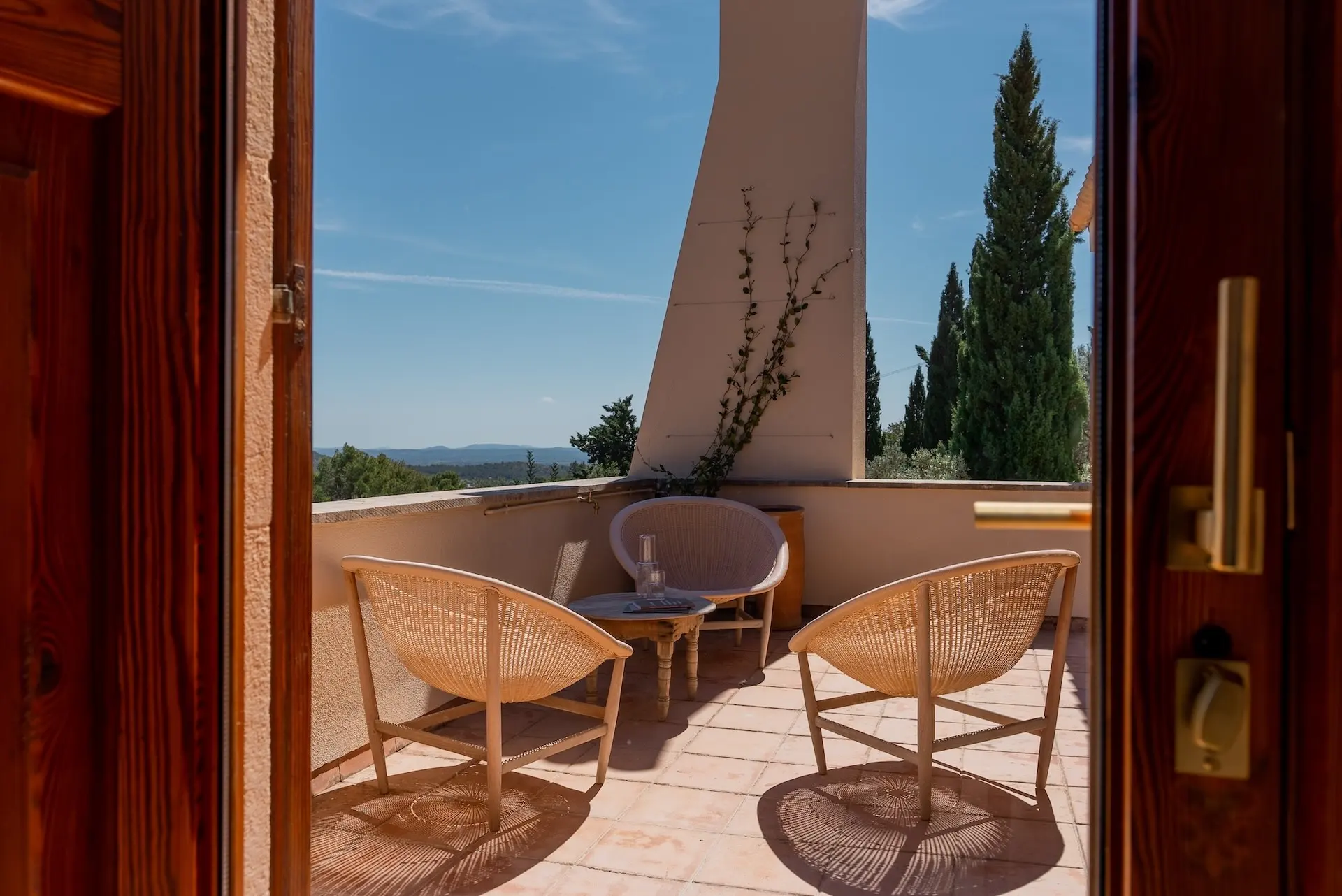 Spread across three levels, the villa provides a harmonious balance between shared living spaces and private retreats. The main floor centres around a spacious, fully equipped kitchen with modern appliances and a striking four-metre dining table, ideal for gathering with family and friends. A generous living room with fireplace and multiple dining areas offer comfortable spaces for relaxing or entertaining, including a charming veranda shaded by wisteria where guests can enjoy meals outdoors. The upper floor hosts four beautifully appointed bedrooms, many with terraces and spectacular views across the village and mountains. On the lower level, a relaxed lounge area and gym create additional spaces for leisure and wellbeing. Two further bedrooms open directly onto a terrace overlooking the countryside, offering privacy and tranquility.