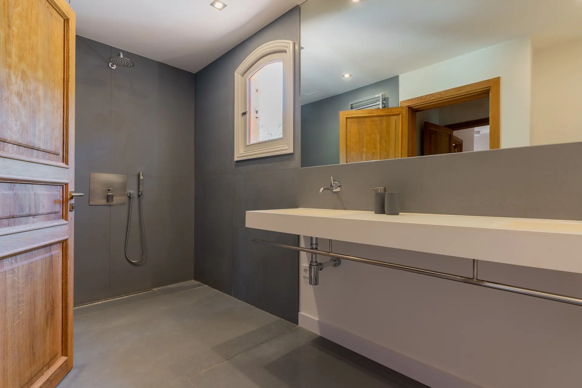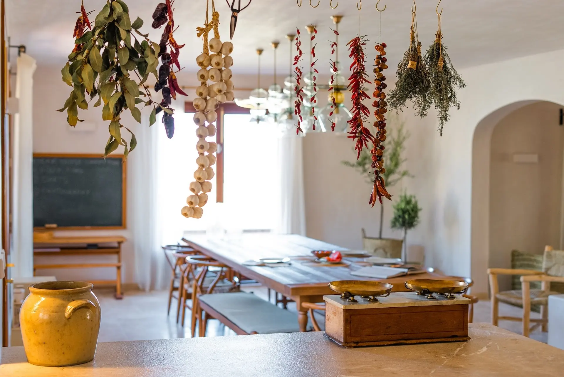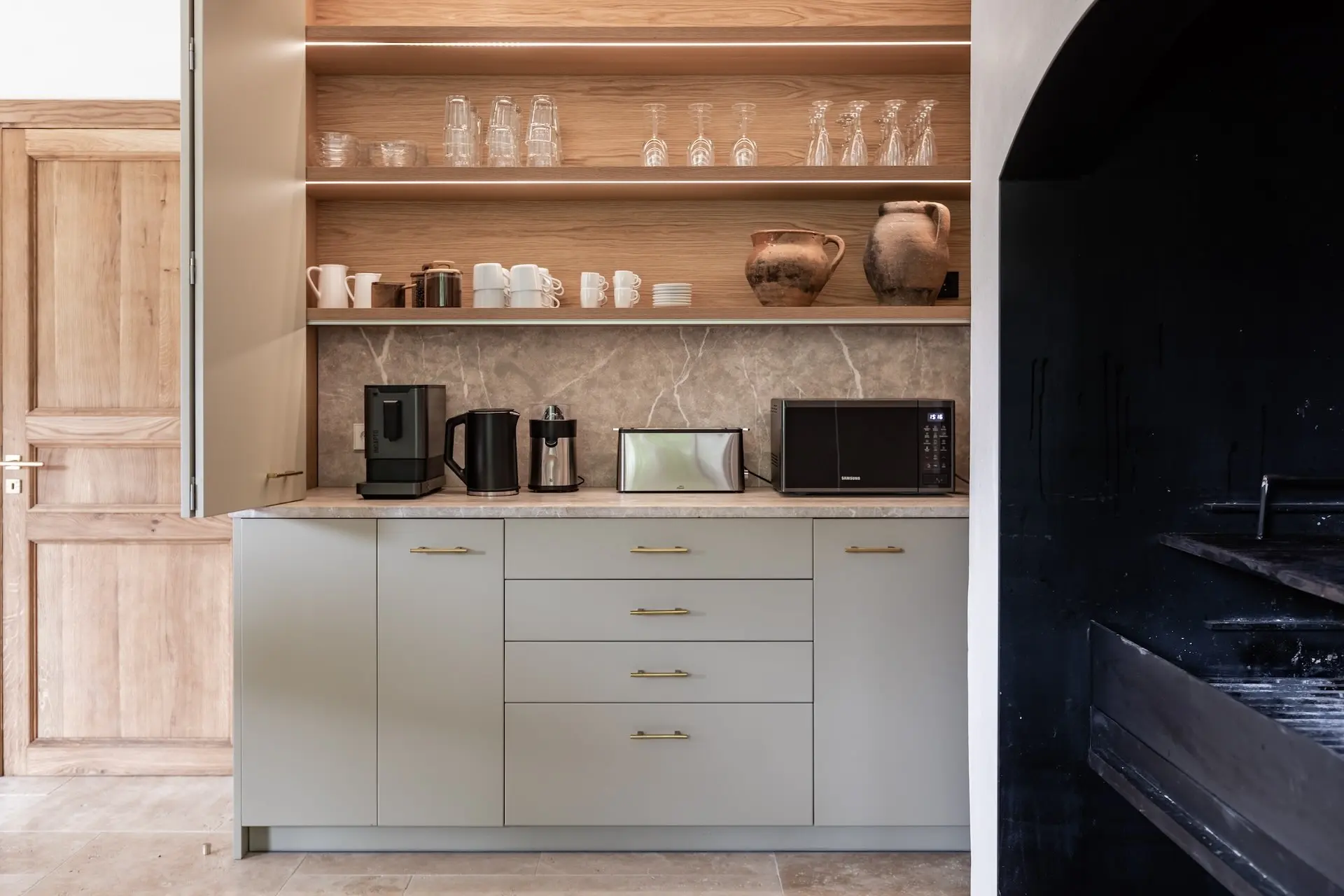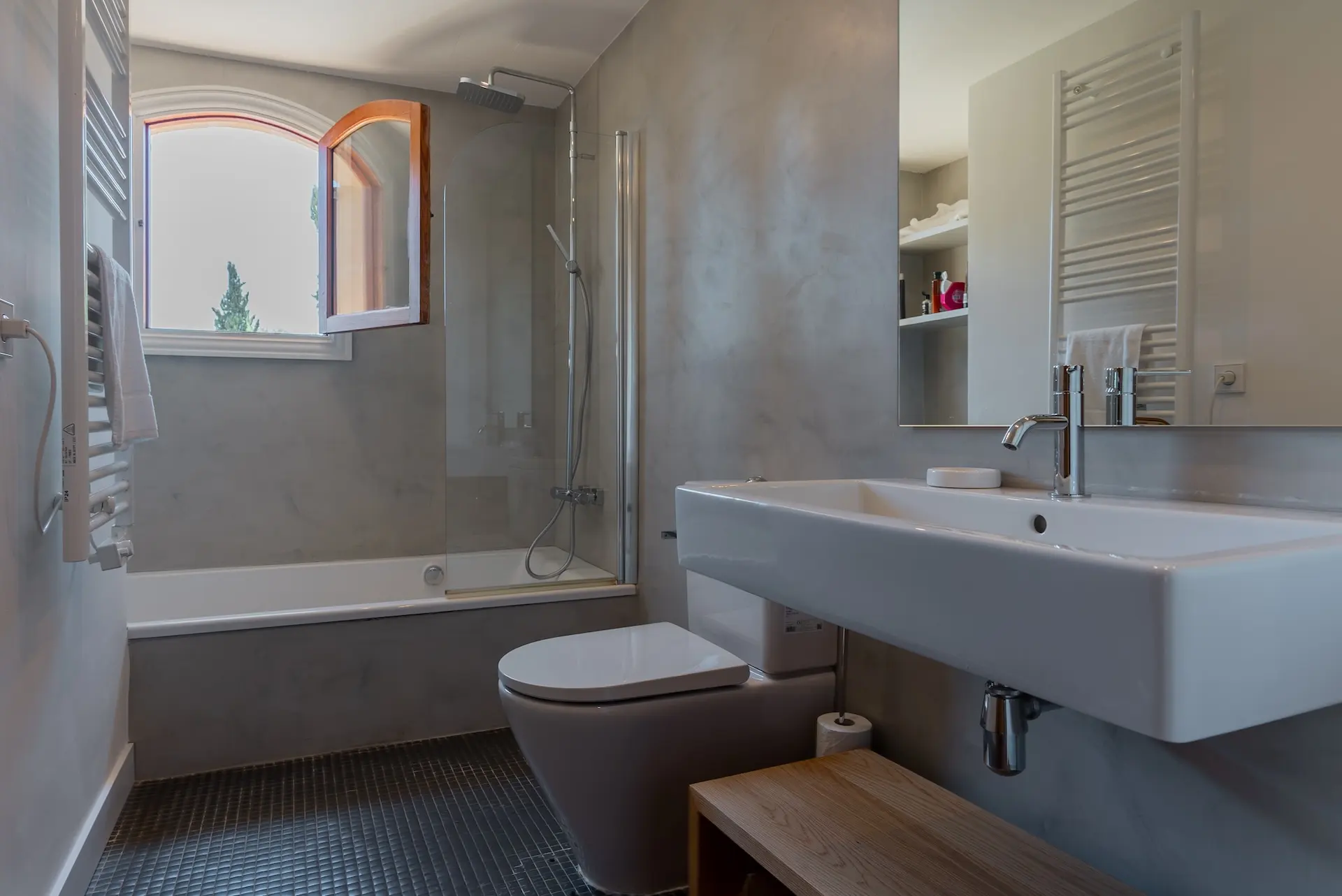 Spread across three levels, the villa provides a harmonious balance between shared living spaces and private retreats. The main floor centres around a spacious, fully equipped kitchen with modern appliances and a striking four-metre dining table, ideal for gathering with family and friends. A generous living room with fireplace and multiple dining areas offer comfortable spaces for relaxing or entertaining, including a charming veranda shaded by wisteria where guests can enjoy meals outdoors. The upper floor hosts four beautifully appointed bedrooms, many with terraces and spectacular views across the village and mountains. On the lower level, a relaxed lounge area and gym create additional spaces for leisure and wellbeing. Two further bedrooms open directly onto a terrace overlooking the countryside, offering privacy and tranquility.
