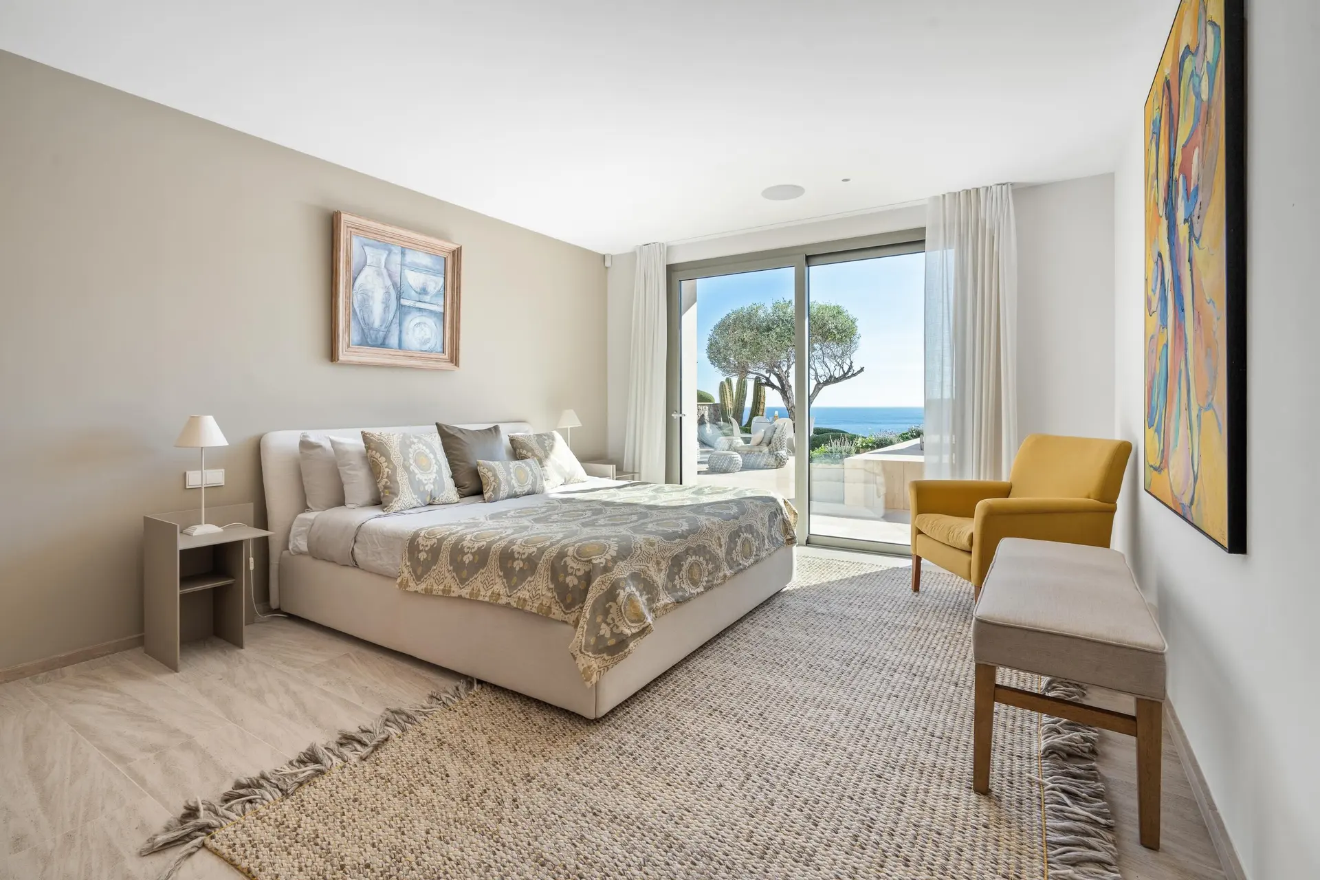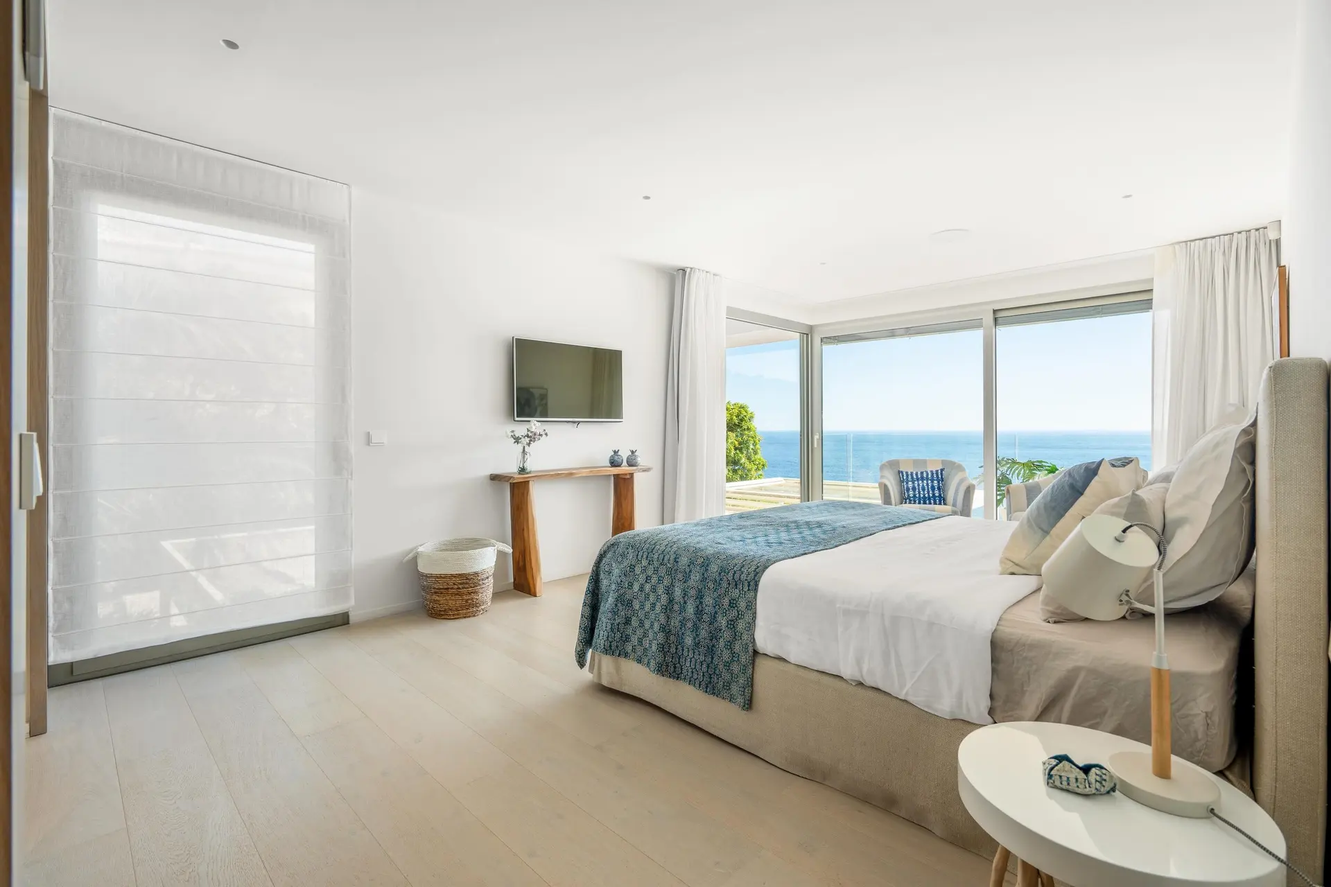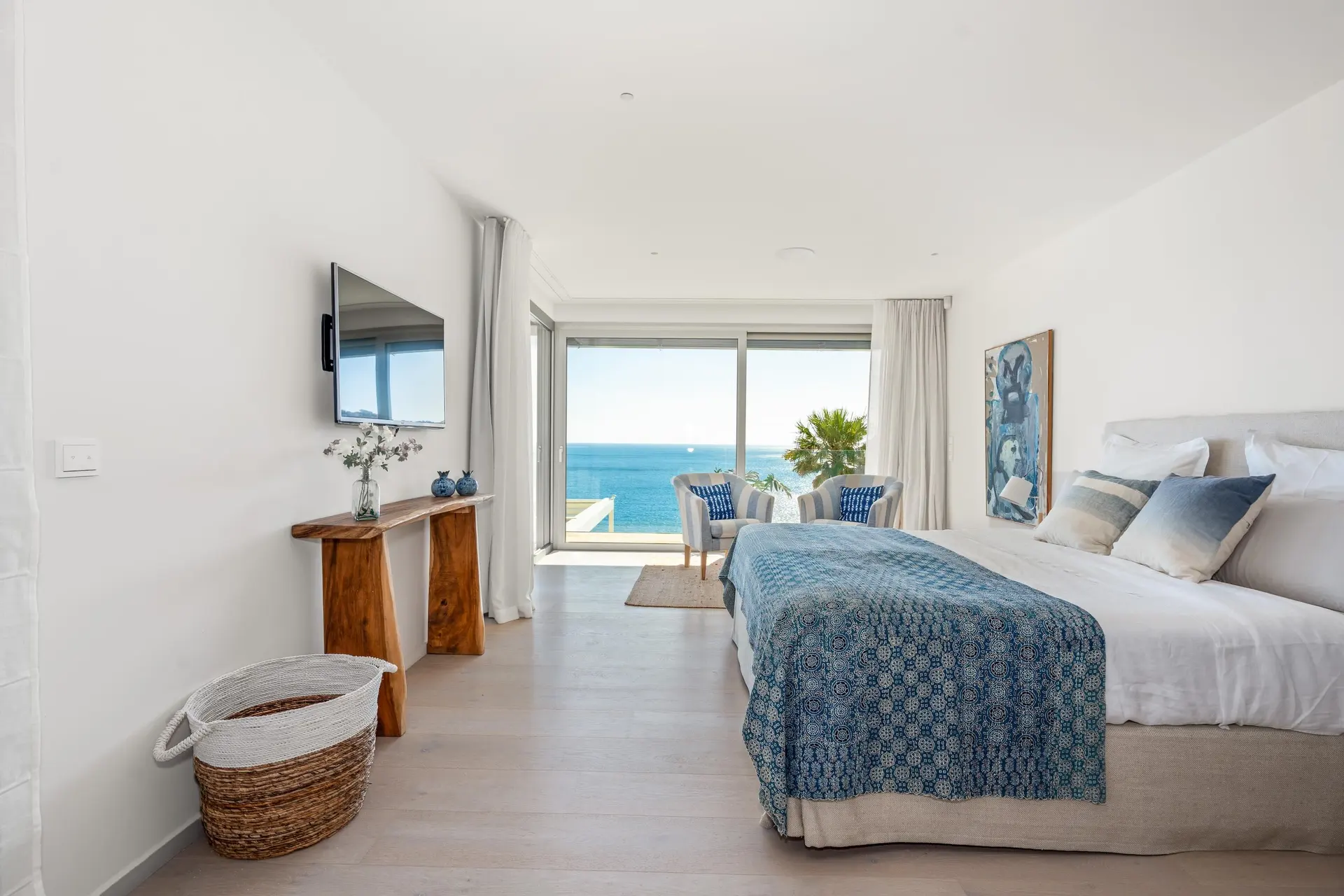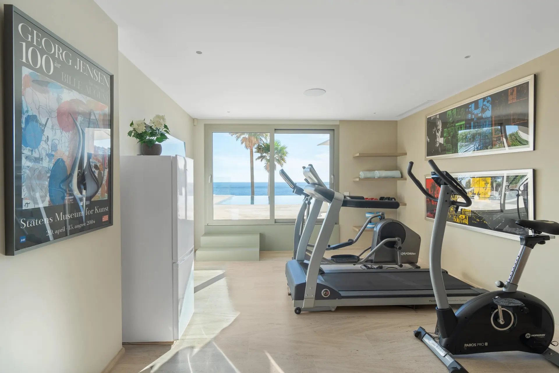 Upon entering the villa, expansive sea views and bright interiors immediately set the tone. The open-plan living concept seamlessly connects the contemporary kitchen, dining area, and living spaces. The lounge is thoughtfully divided into a peaceful sitting space ideal for relaxing with a book while admiring the view, and a comfortable TV corner perfect for evenings indoors. Floor-to-ceiling glass doors flood the interior with natural light and frame the deep blue Mediterranean beyond. The first floor hosts two beautifully designed double bedrooms, including the tranquil master suite, both with en-suite bathrooms and spectacular sea views. On the lower level, two additional double bedrooms provide generous accommodation, one with an en-suite bathroom and a sofa bed, making it ideal for families or guests. This level also includes a stylish shared bathroom and a compact fitness corner. A private elevator ensures effortless access between all floors of the villa.