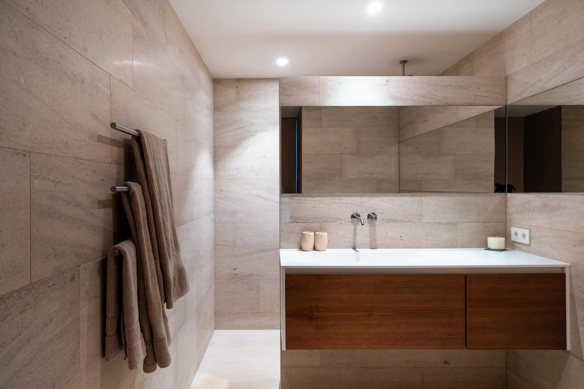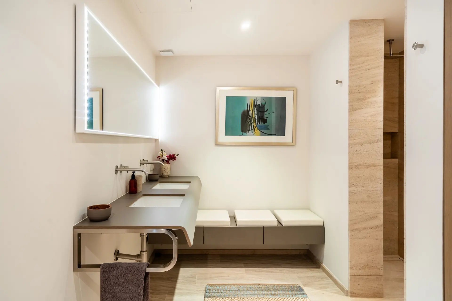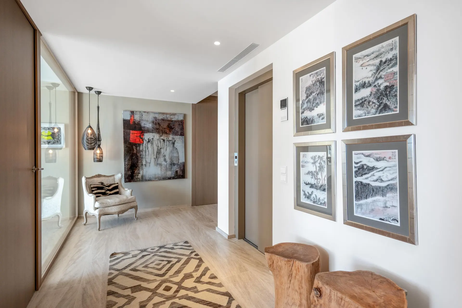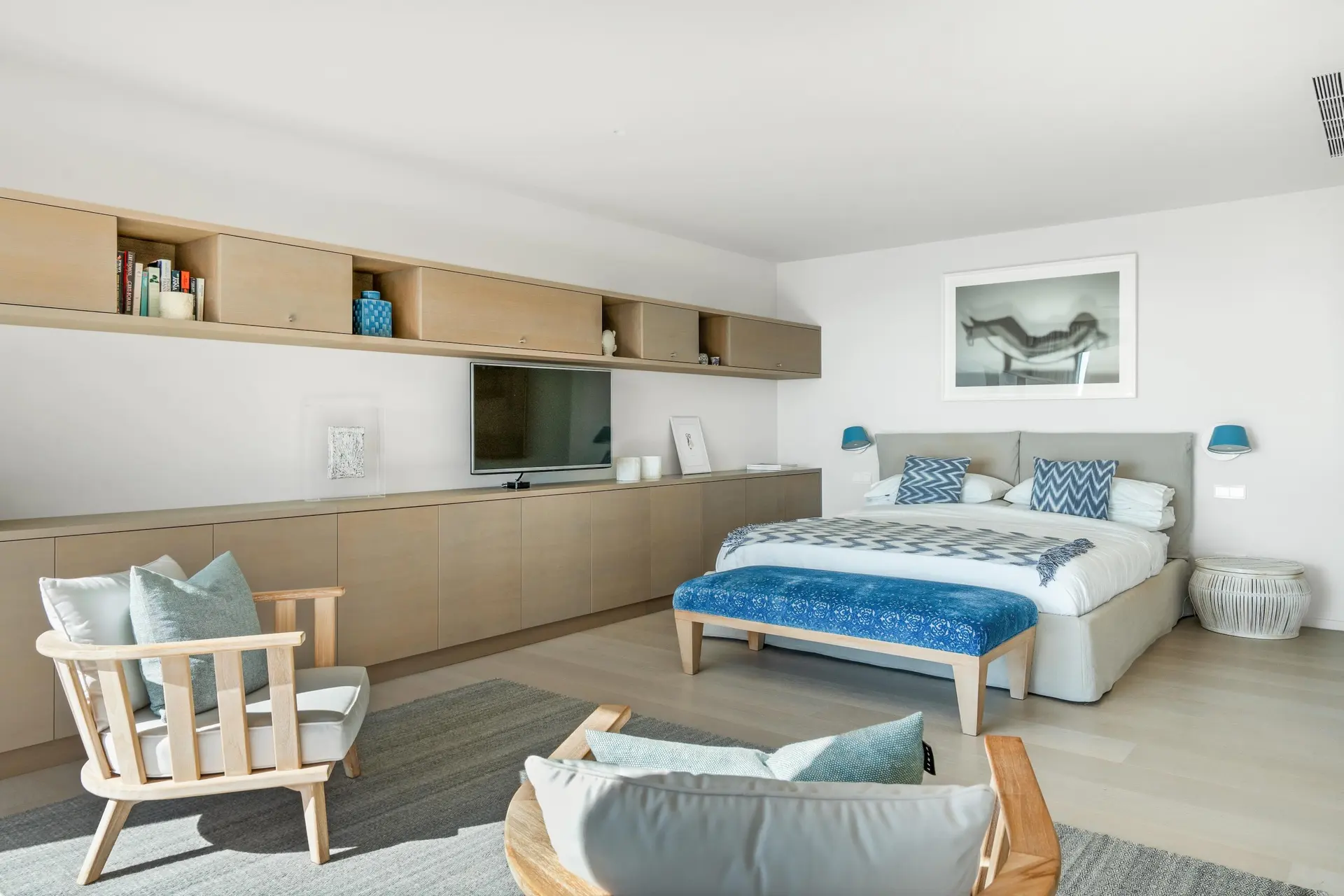 Upon entering the villa, expansive sea views and bright interiors immediately set the tone. The open-plan living concept seamlessly connects the contemporary kitchen, dining area, and living spaces. The lounge is thoughtfully divided into a peaceful sitting space ideal for relaxing with a book while admiring the view, and a comfortable TV corner perfect for evenings indoors. Floor-to-ceiling glass doors flood the interior with natural light and frame the deep blue Mediterranean beyond. The first floor hosts two beautifully designed double bedrooms, including the tranquil master suite, both with en-suite bathrooms and spectacular sea views. On the lower level, two additional double bedrooms provide generous accommodation, one with an en-suite bathroom and a sofa bed, making it ideal for families or guests. This level also includes a stylish shared bathroom and a compact fitness corner. A private elevator ensures effortless access between all floors of the villa.