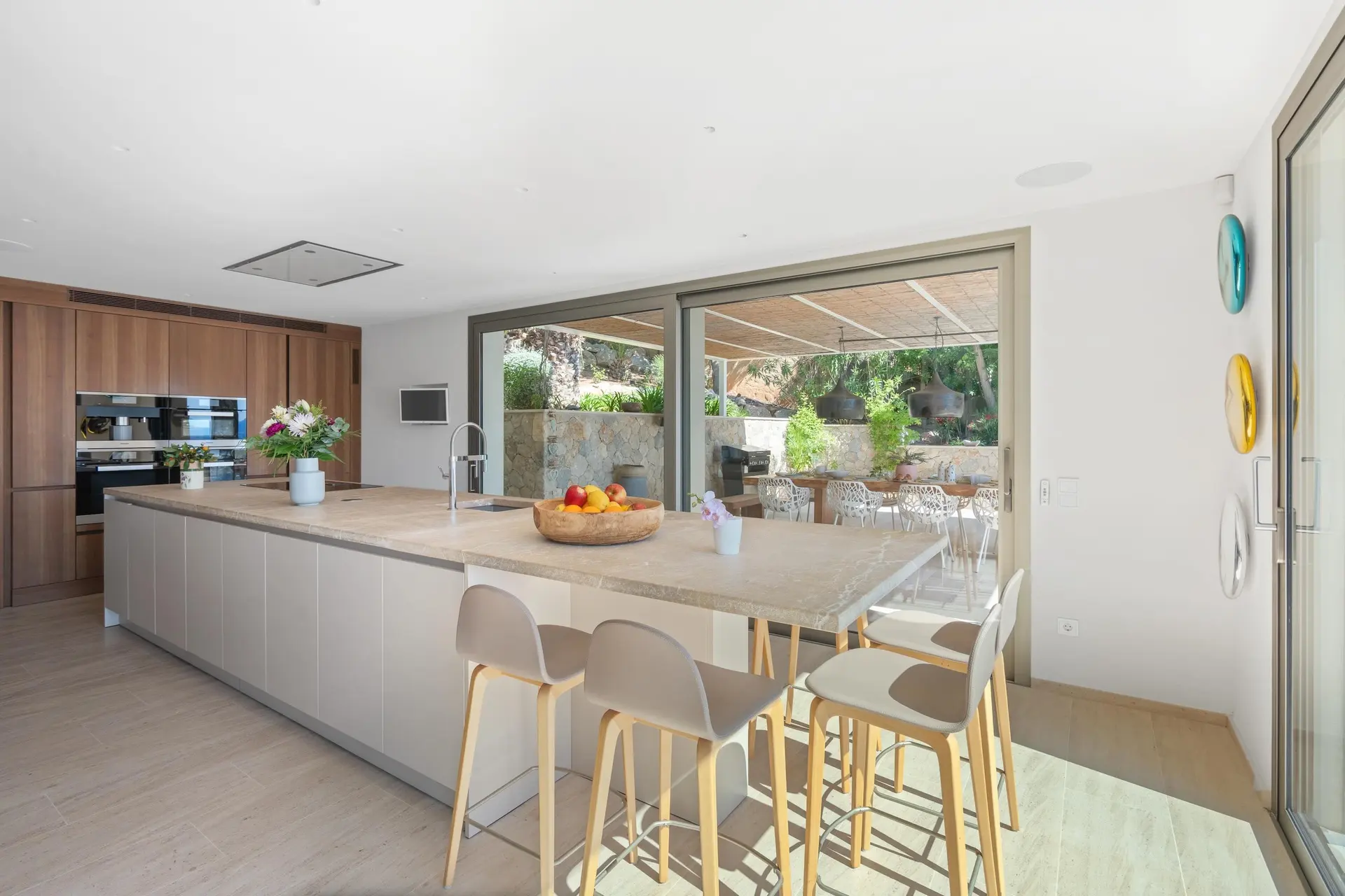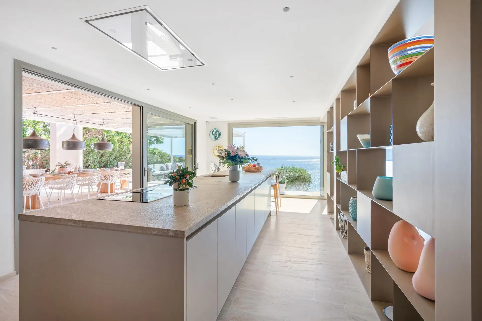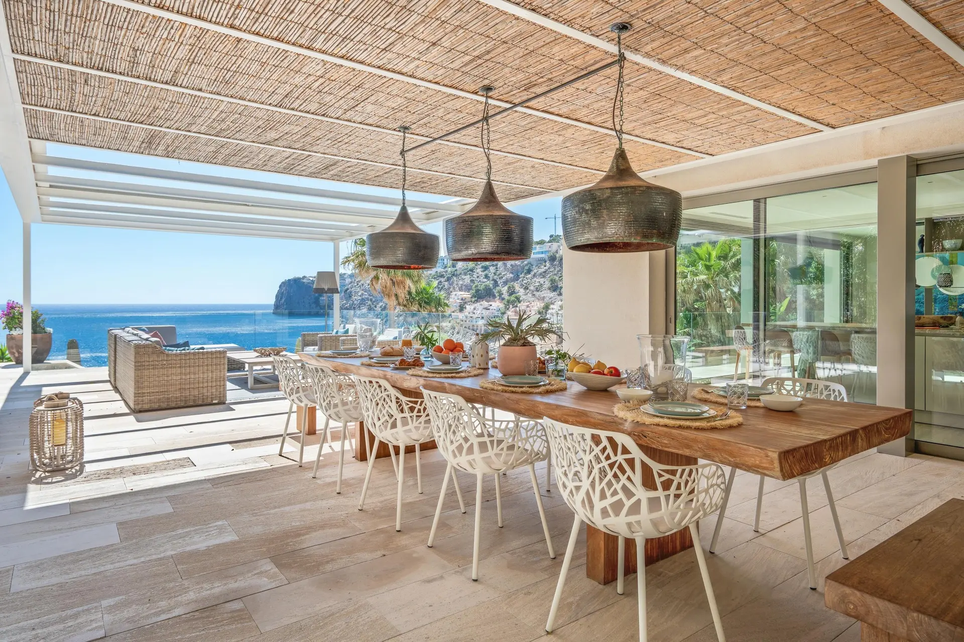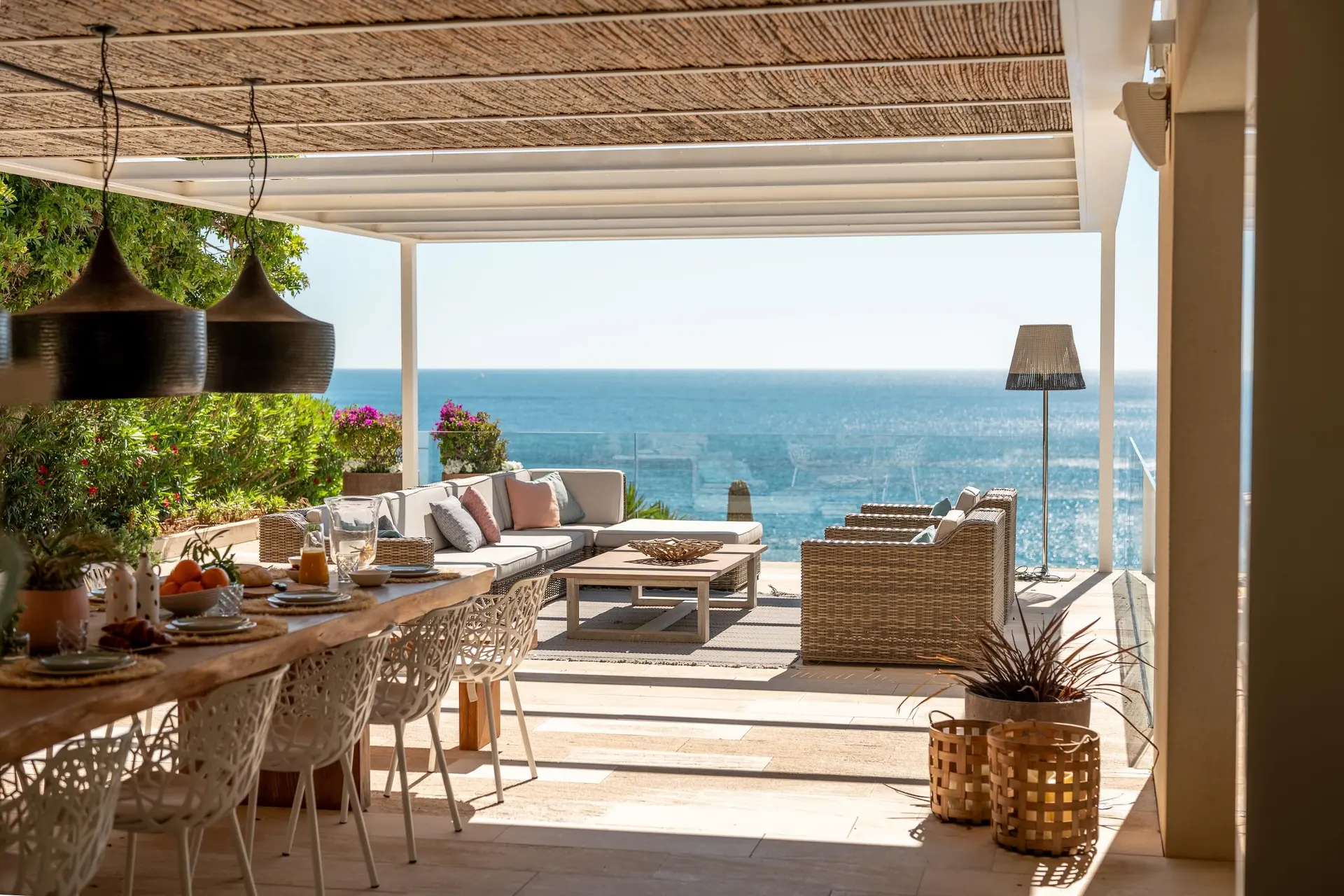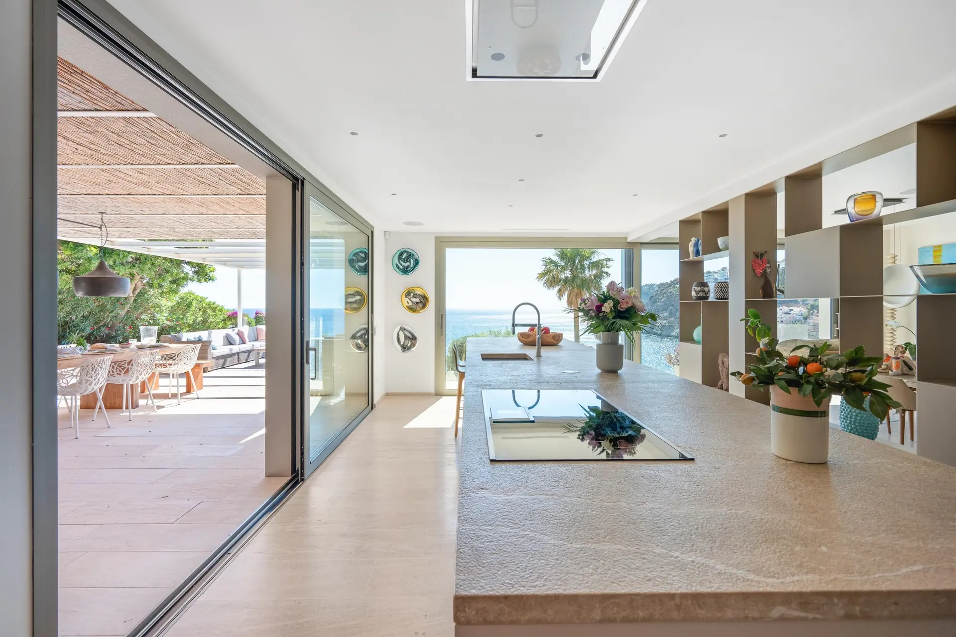 The outdoor areas are designed for enjoying the Mediterranean lifestyle. Spacious terraces feature comfortable lounge seating, a stylish outdoor dining area, and a barbecue — perfect for long lunches, sunset drinks, or relaxed dinners under the stars. The large infinity saltwater pool blends beautifully with the surrounding scenery, creating the sensation of merging with the sea and horizon. Sun loungers and shaded corners invite guests to unwind while taking in the spectacular coastal views.