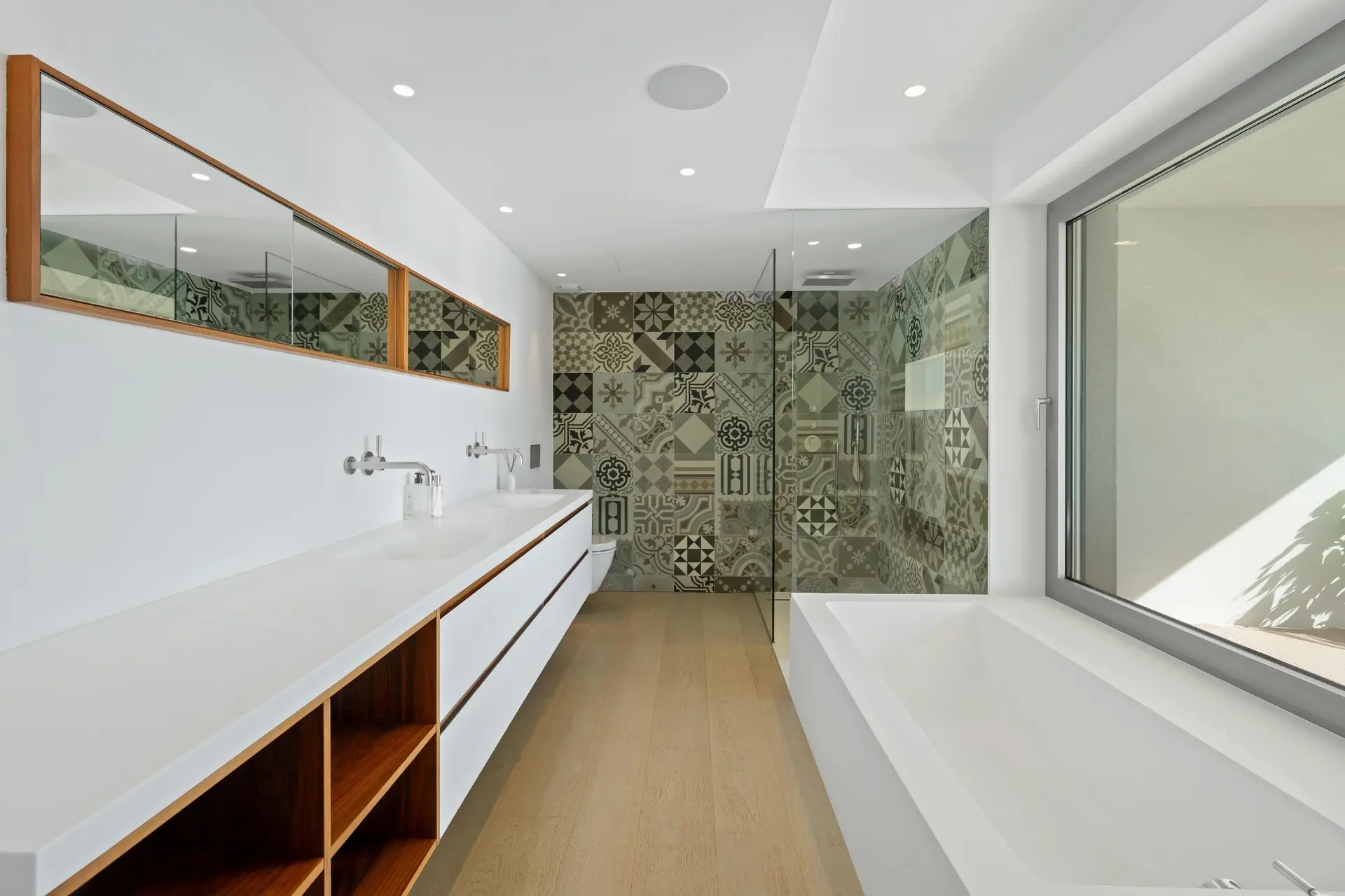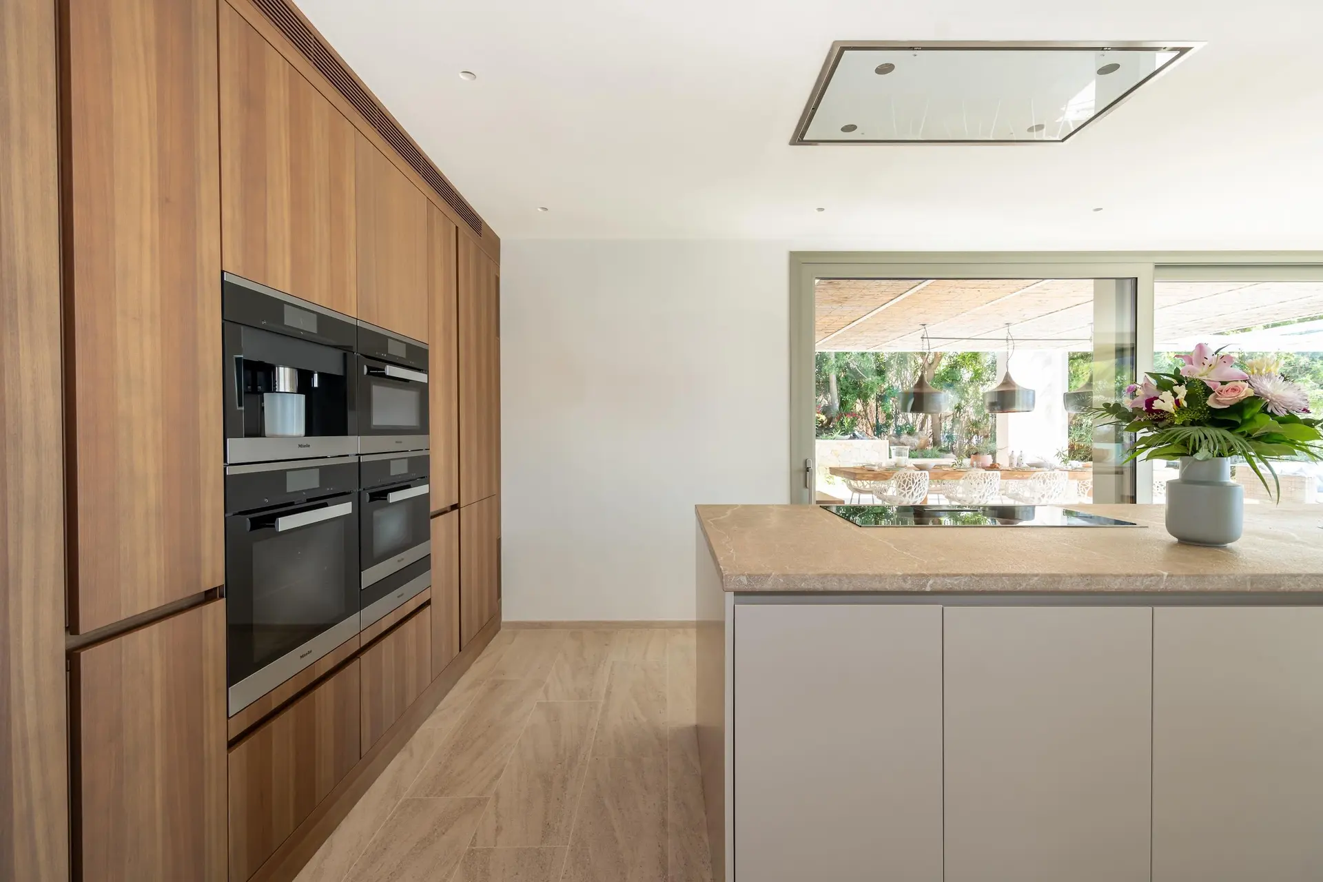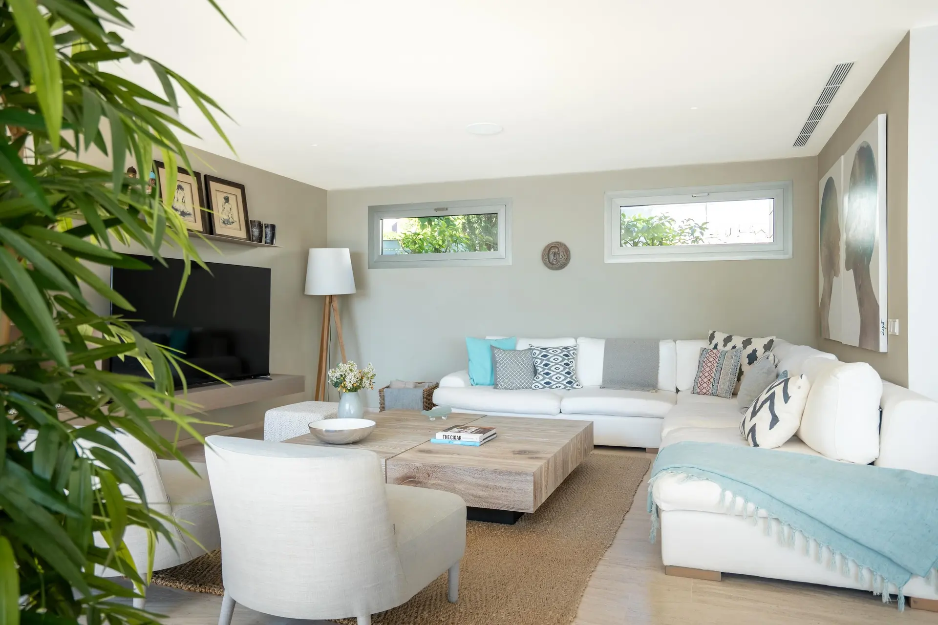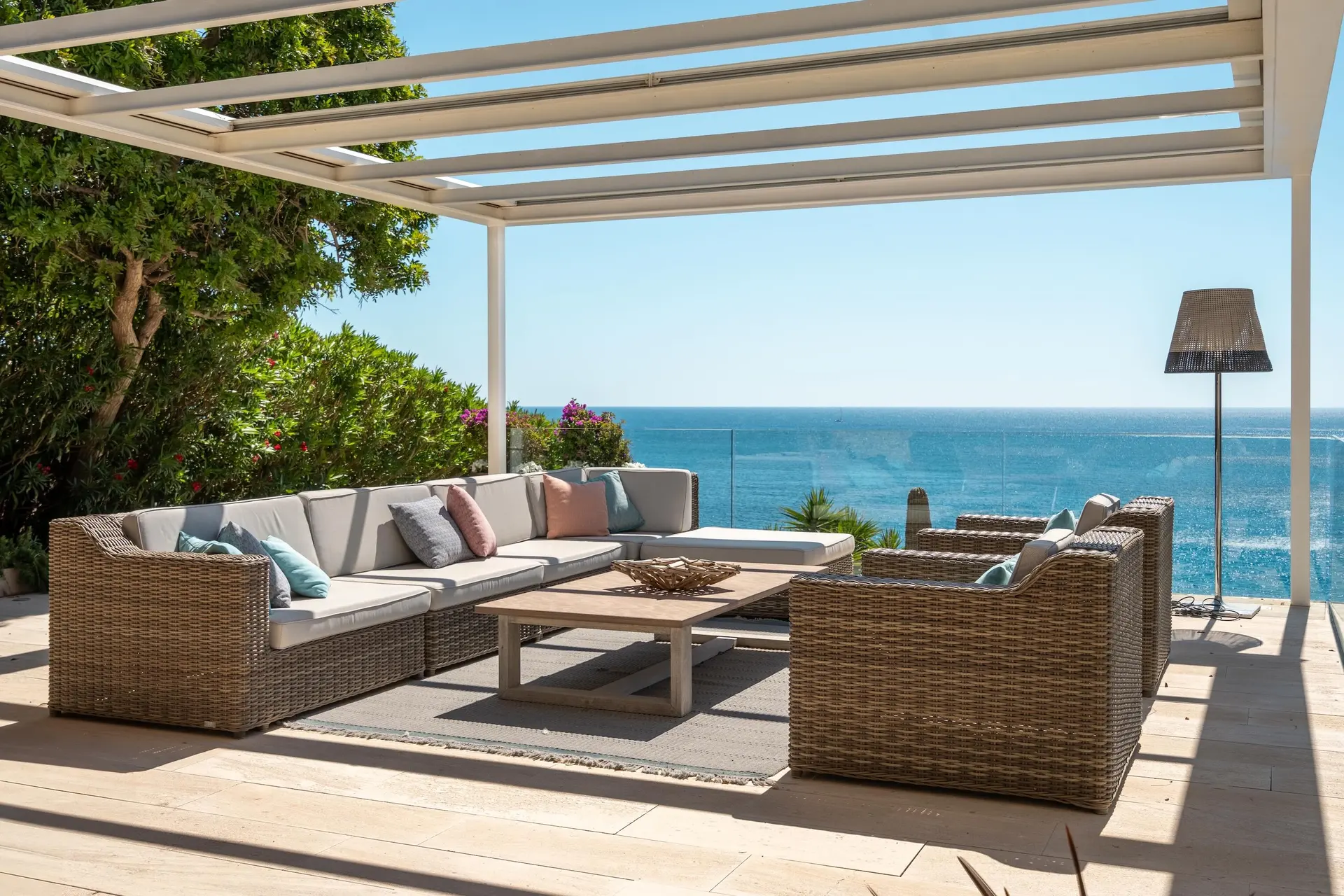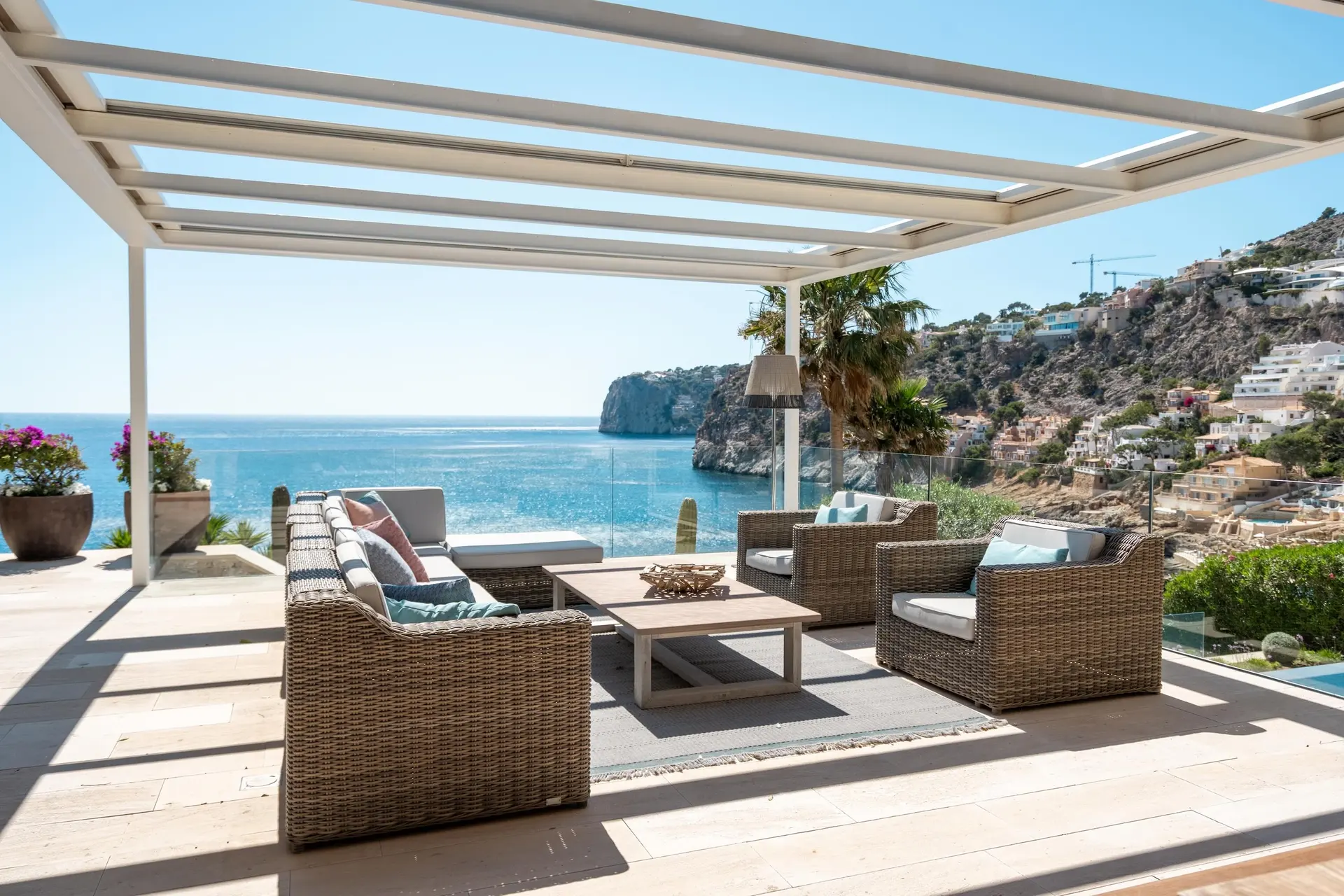The outdoor areas are designed for enjoying the Mediterranean lifestyle. Spacious terraces feature comfortable lounge seating, a stylish outdoor dining area, and a barbecue — perfect for long lunches, sunset drinks, or relaxed dinners under the stars. The large infinity saltwater pool blends beautifully with the surrounding scenery, creating the sensation of merging with the sea and horizon. Sun loungers and shaded corners invite guests to unwind while taking in the spectacular coastal views.