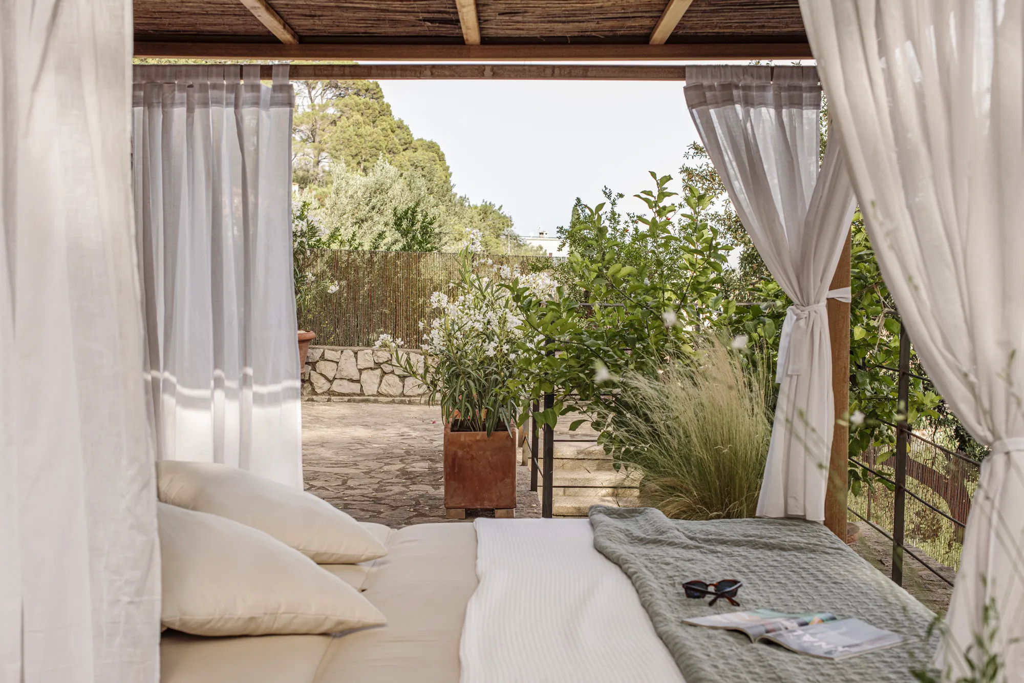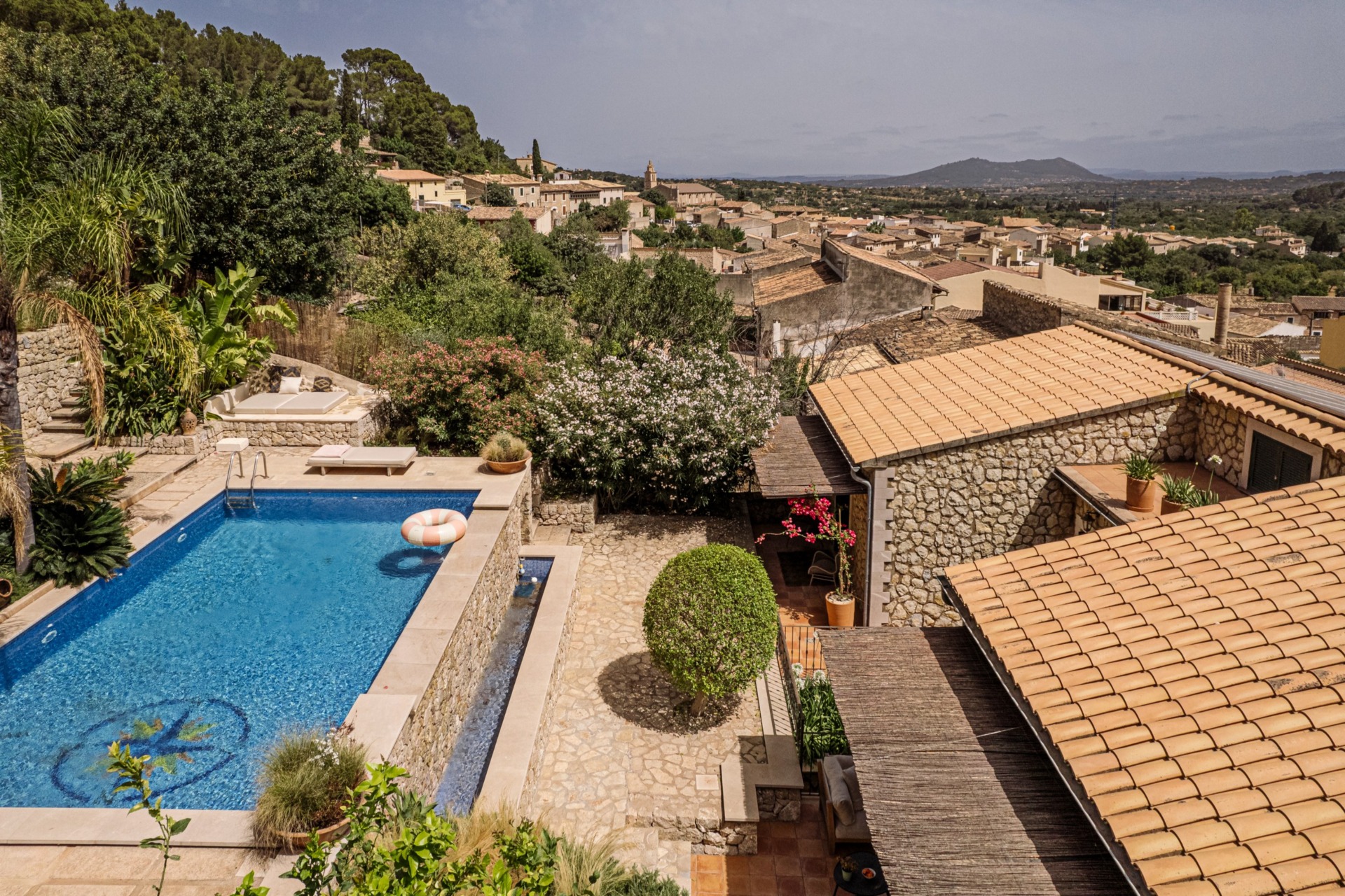 Outside, the villa opens onto a beautifully designed garden with several terraces arranged on different levels. These outdoor spaces offer wonderful views of the surrounding mountains and countryside. The large swimming pool provides the perfect place to cool off under the Mediterranean sun, while Bali beds, sun loungers and shaded seating areas invite guests to relax throughout the day.