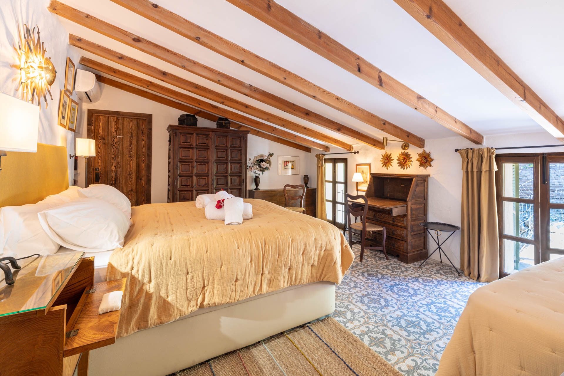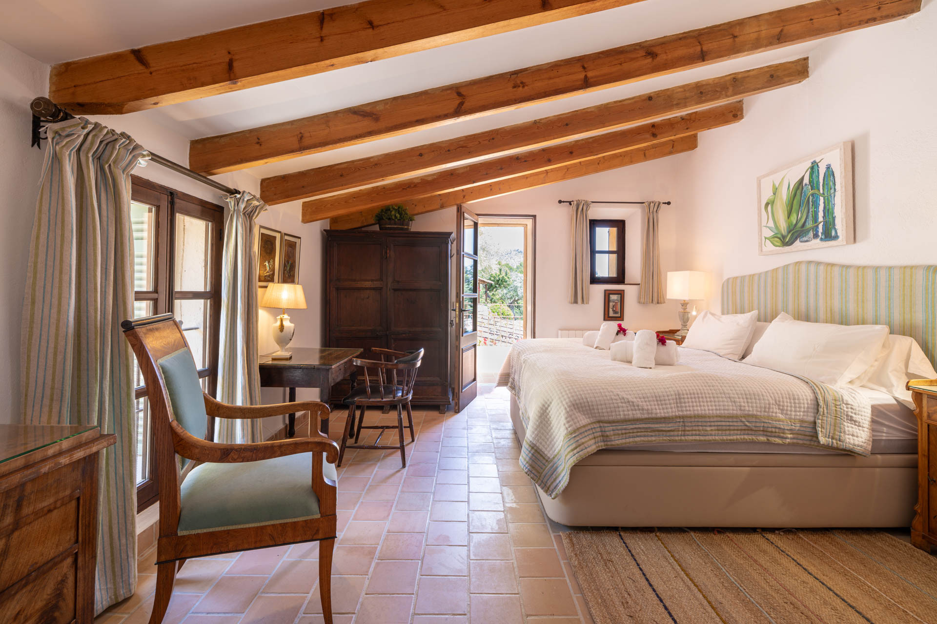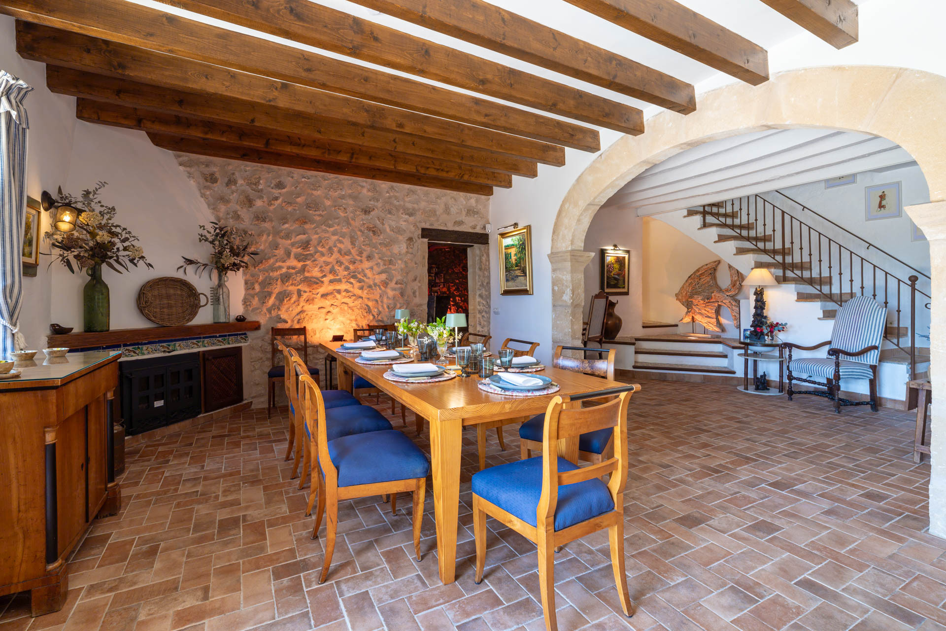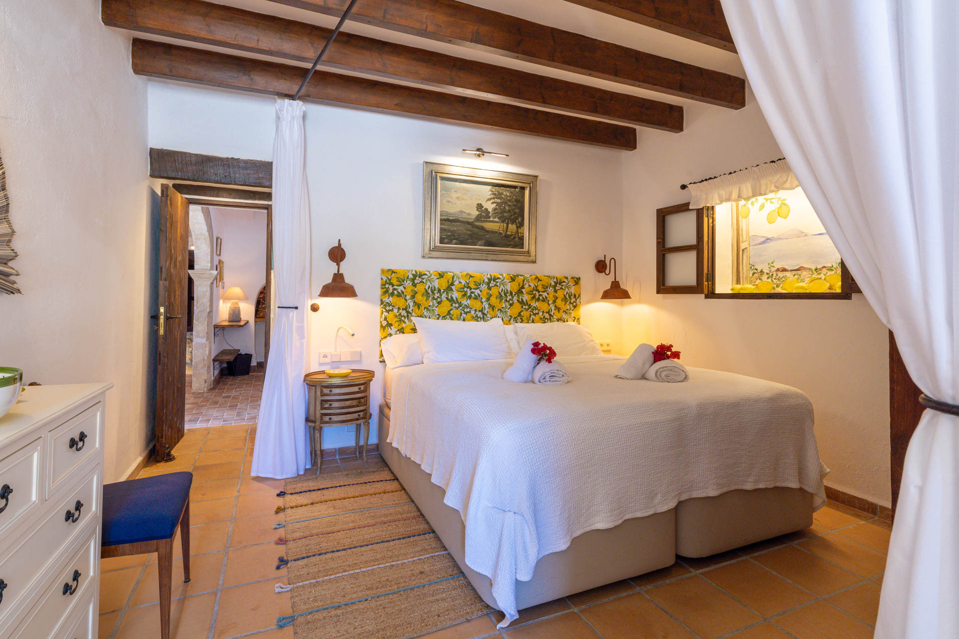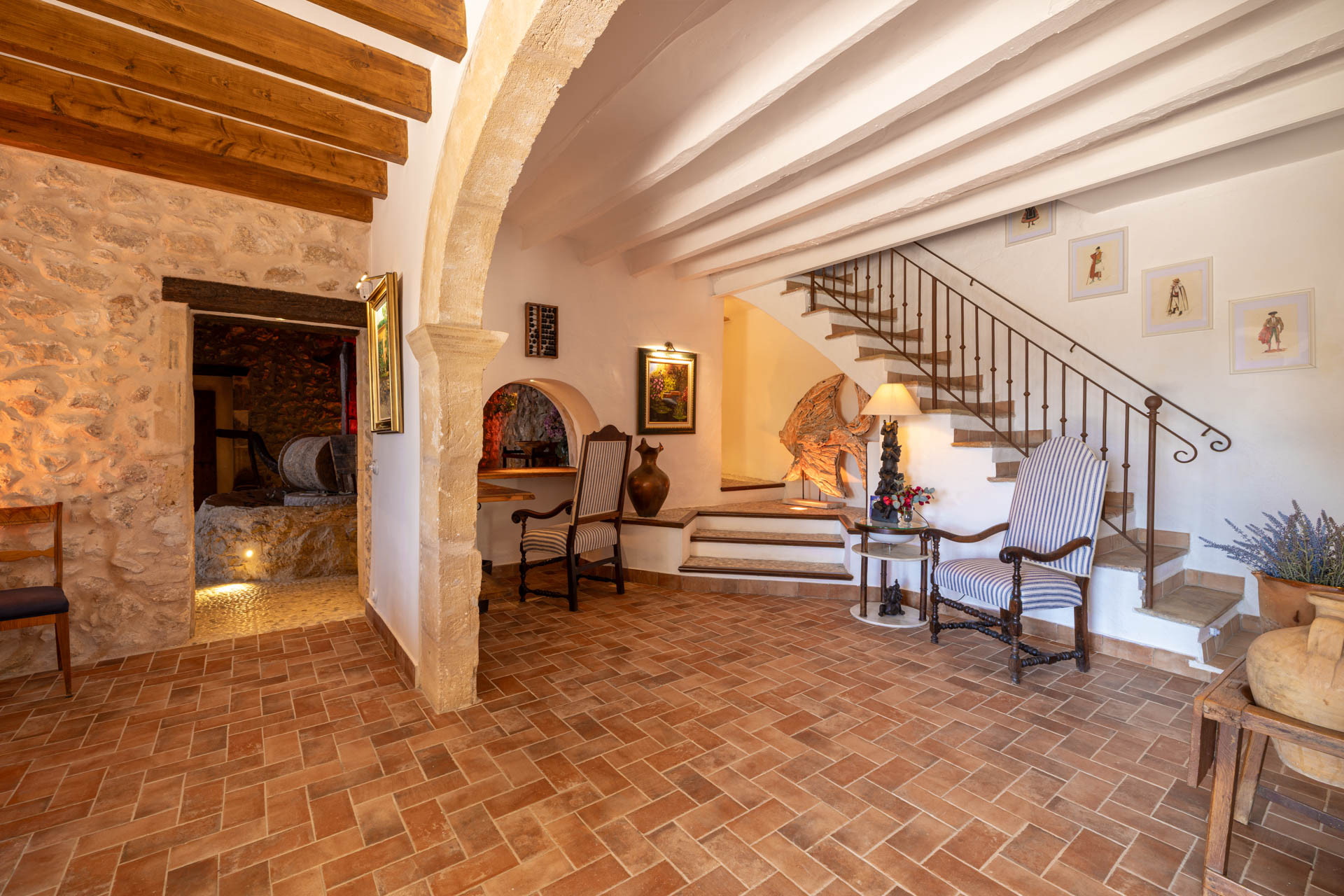 Outside, the finca opens onto expansive gardens and terraces designed for outdoor living. The private swimming pool provides a refreshing escape during warm days, while shaded terraces and dining areas create the perfect setting for long Mediterranean meals. Guests can also enjoy private walking trails leading into the surrounding countryside, offering a unique connection to nature.