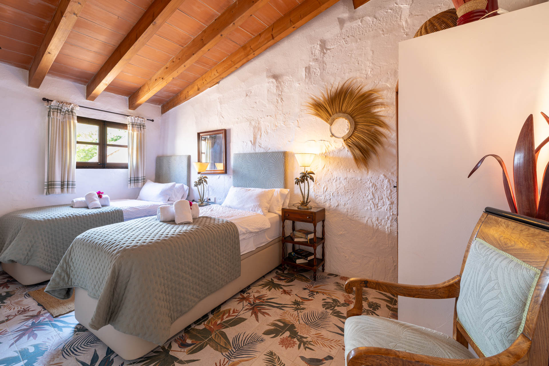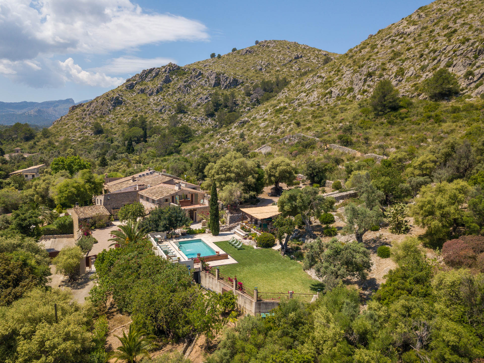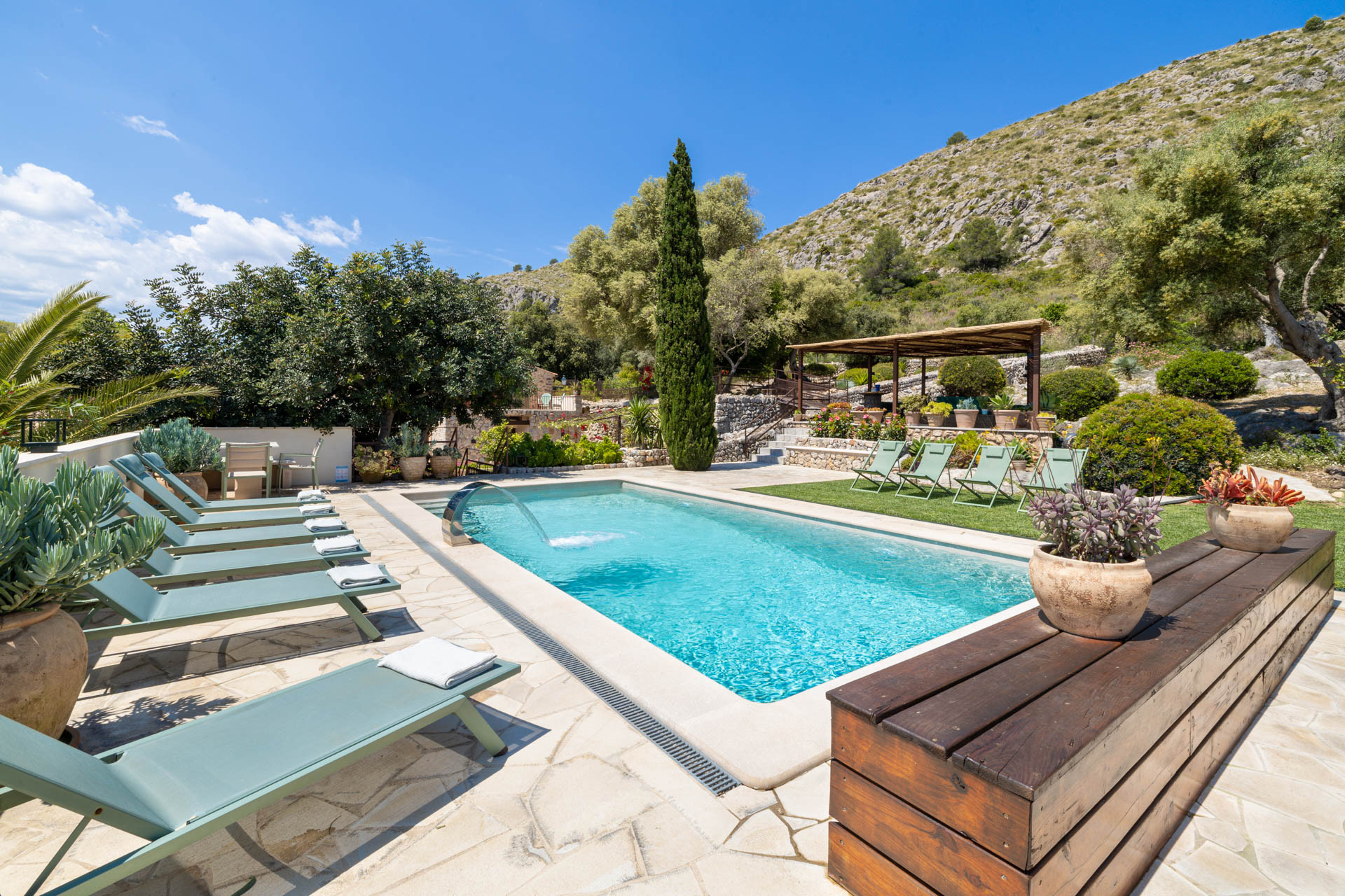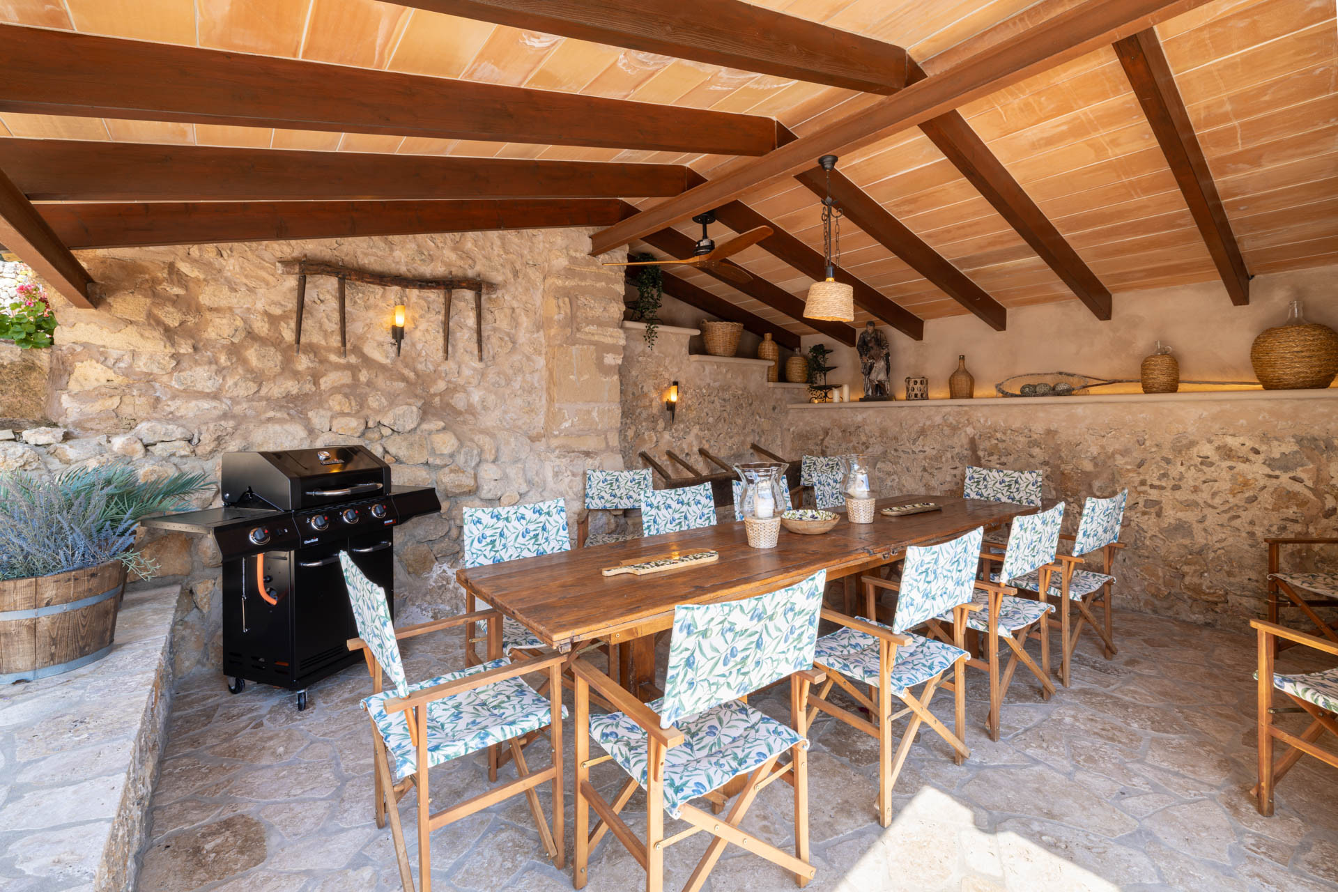 Outside, the finca opens onto expansive gardens and terraces designed for outdoor living. The private swimming pool provides a refreshing escape during warm days, while shaded terraces and dining areas create the perfect setting for long Mediterranean meals. Guests can also enjoy private walking trails leading into the surrounding countryside, offering a unique connection to nature.