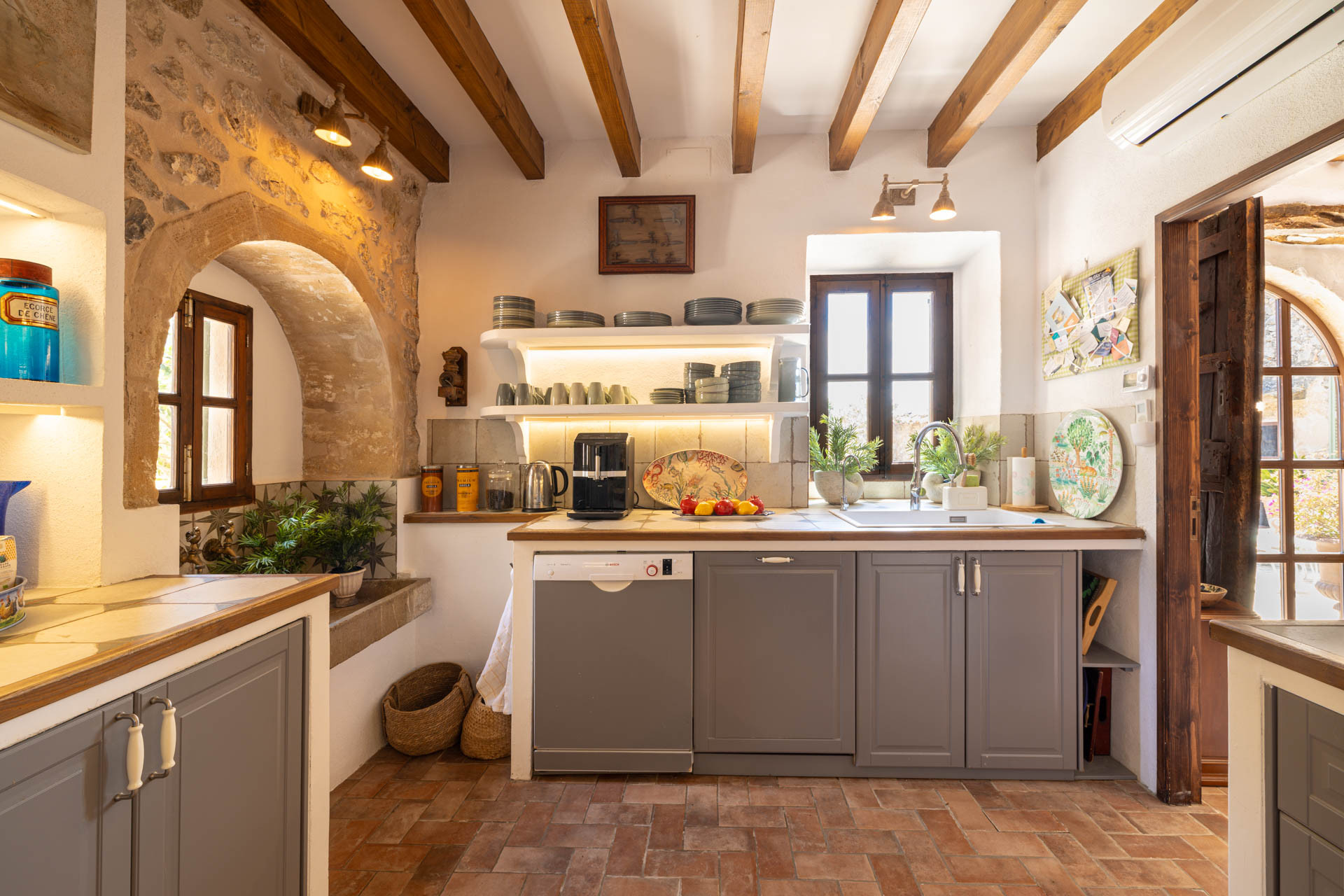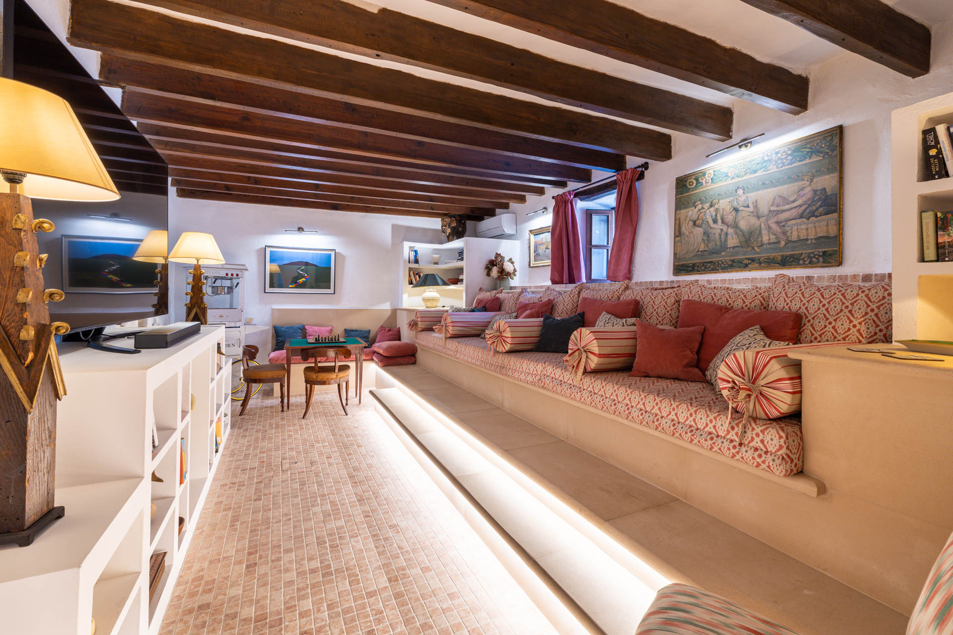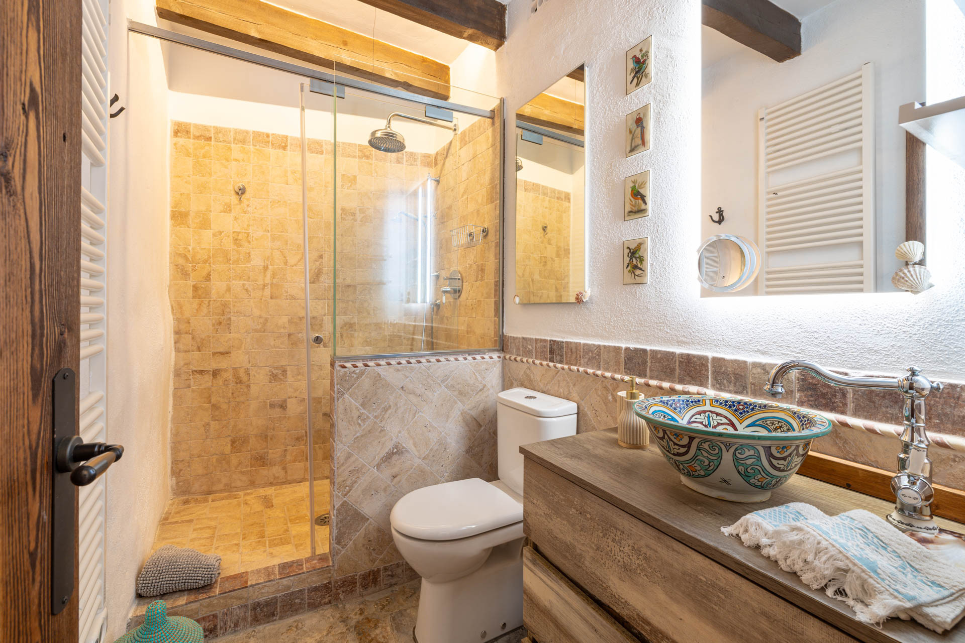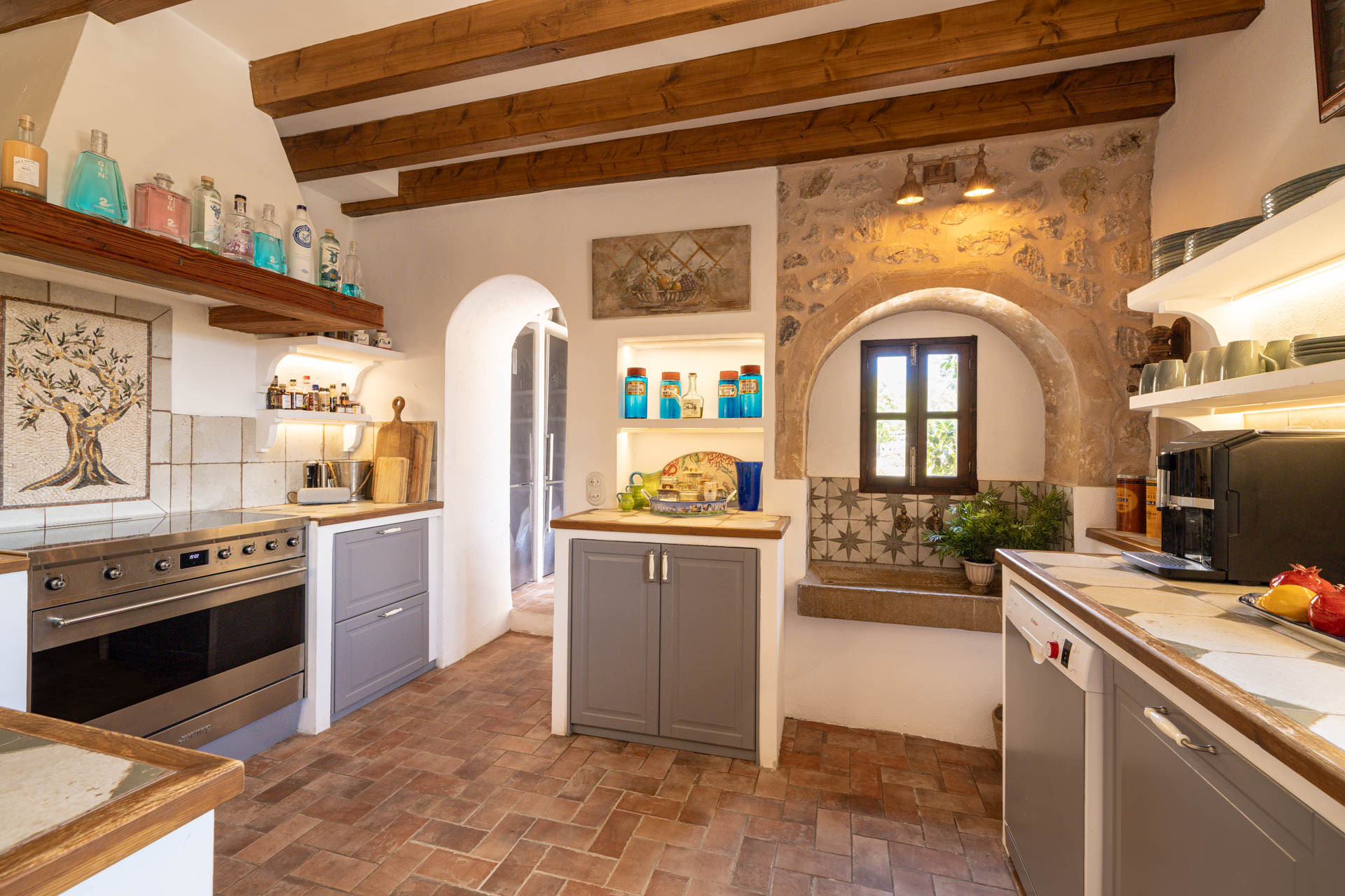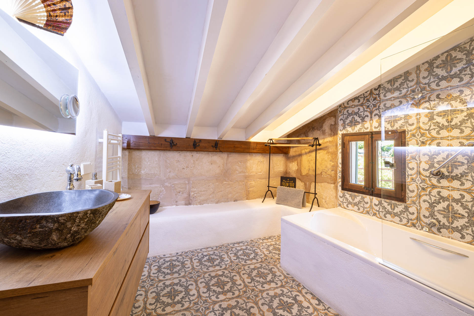 Outside, the finca opens onto expansive gardens and terraces designed for outdoor living. The private swimming pool provides a refreshing escape during warm days, while shaded terraces and dining areas create the perfect setting for long Mediterranean meals. Guests can also enjoy private walking trails leading into the surrounding countryside, offering a unique connection to nature.