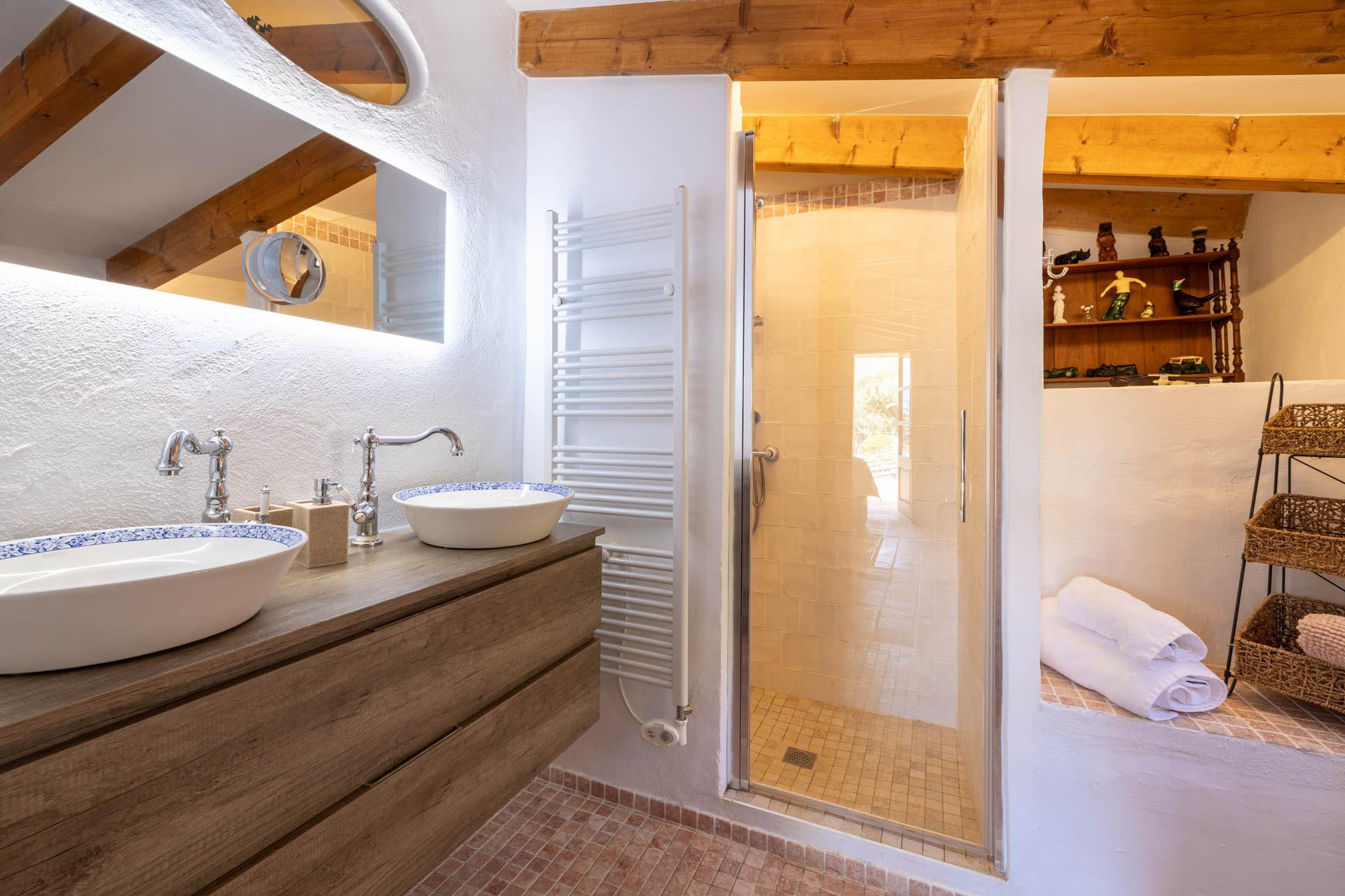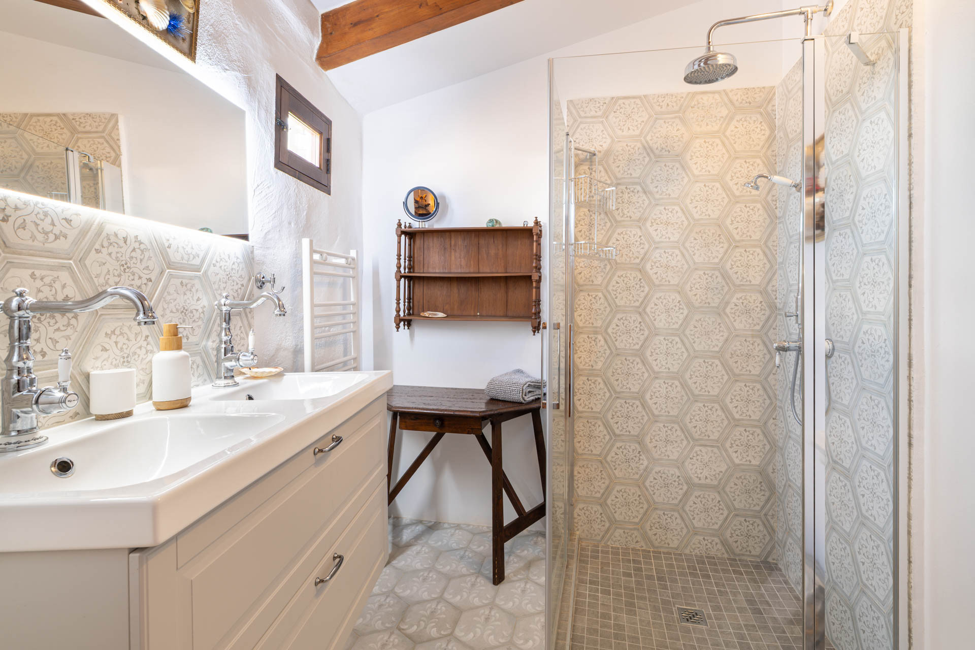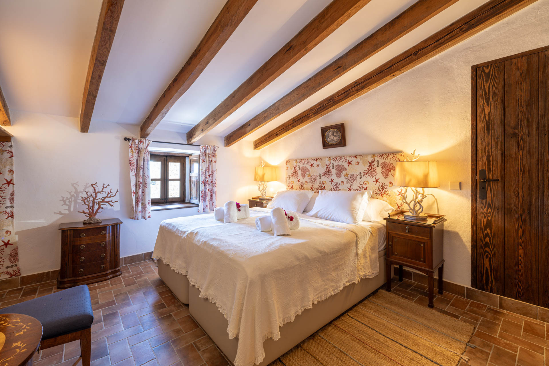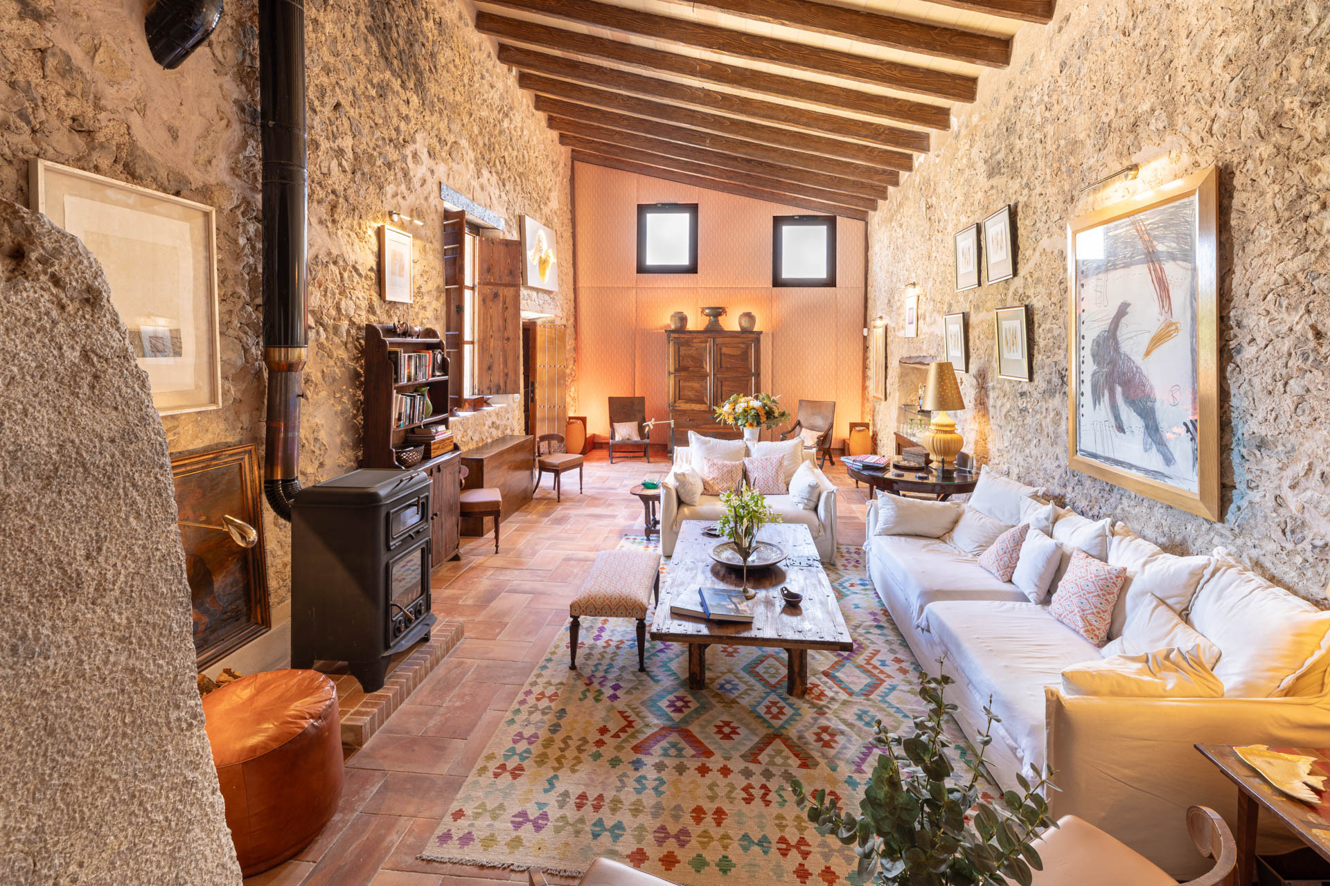 Inside, the villa showcases authentic architectural features such as exposed stone walls, wooden beams and original details, including a historic olive press. These traditional elements are complemented by a carefully curated mix of antique and modern furnishings, creating a warm and elegant atmosphere throughout. The spacious living areas are designed for relaxation, while natural textures and earthy tones reflect the surrounding landscape. The property offers six spacious bedrooms and six bathrooms. Each room has been thoughtfully designed to provide comfort, privacy and a sense of calm, making the villa ideal for families or groups.