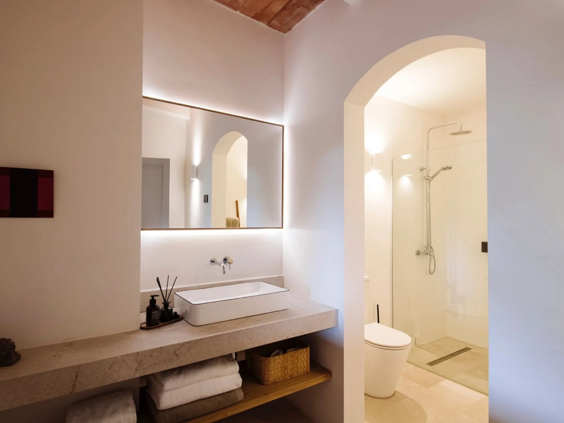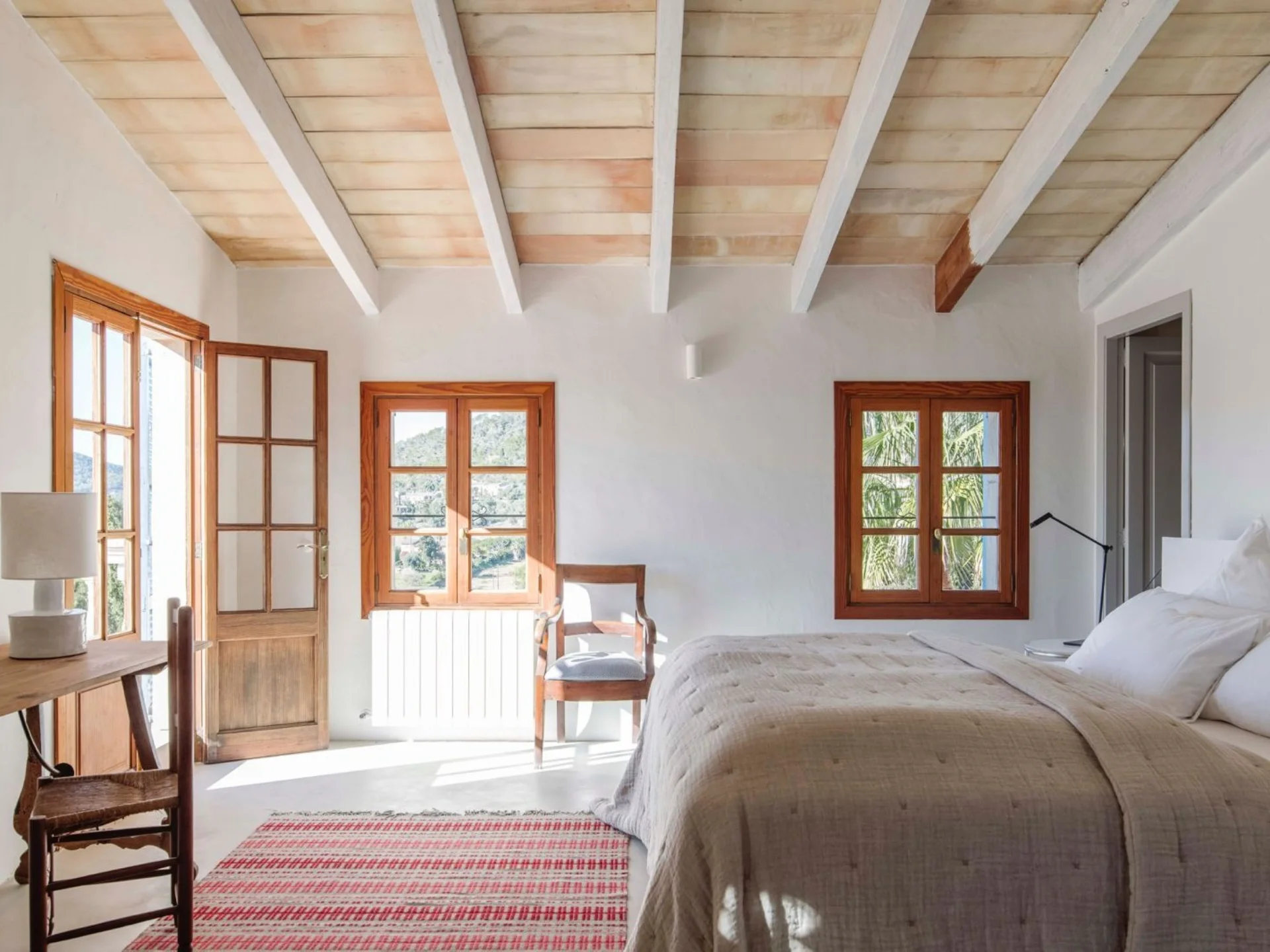 Spanning generous interior living areas, the finca preserves traditional architectural details such as whitewashed walls, exposed wooden beams, and natural stone elements, while integrating refined modern finishes and amenities. Multiple living spaces provide flexibility for both gathering and quiet retreat, including a cosy fireplace lounge and a separate TV room. The property accommodates up to twelve guests across six spacious bedrooms and seven bathrooms. A detached guest casita offers additional independence, ideal for couples or visitors seeking extra privacy.
