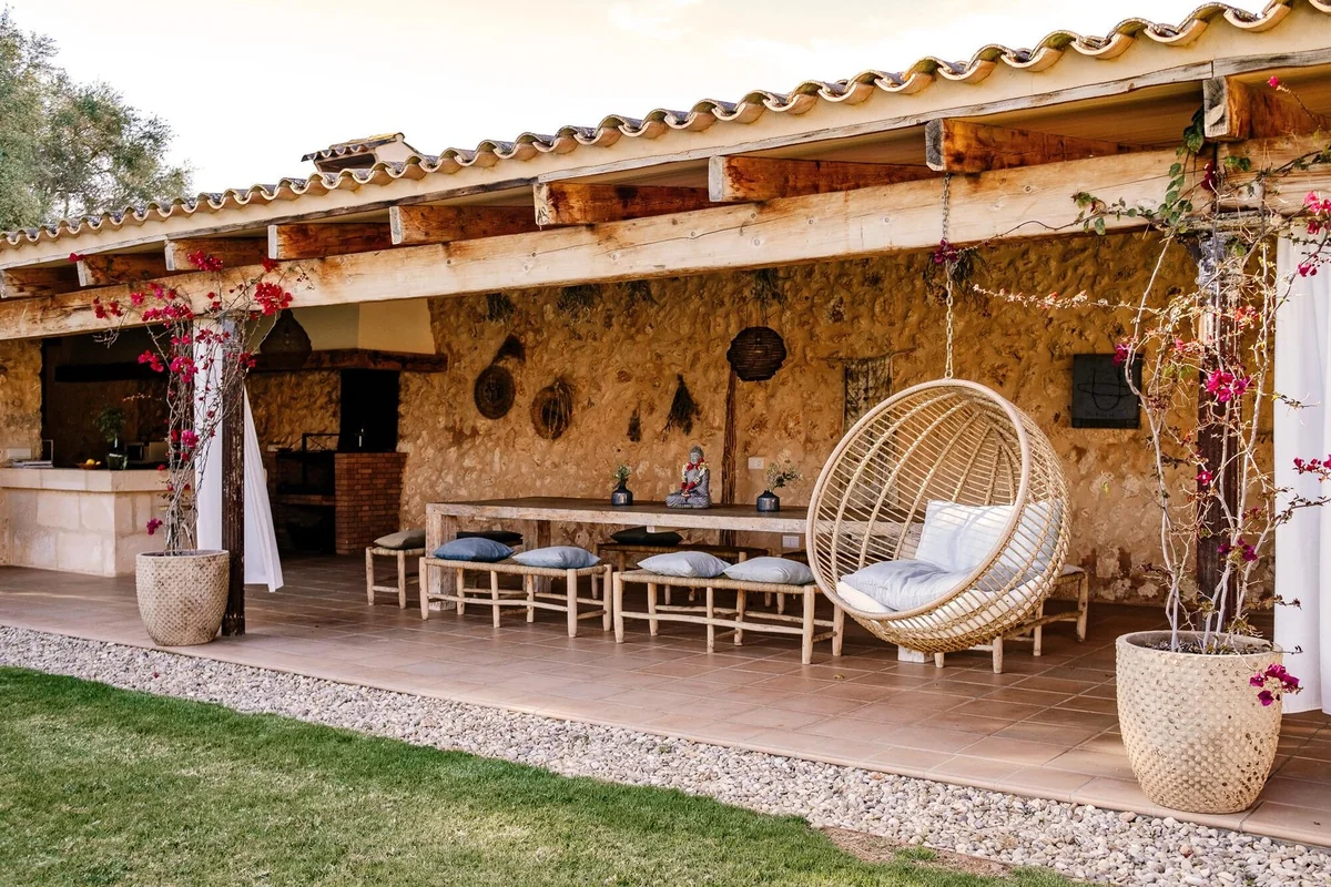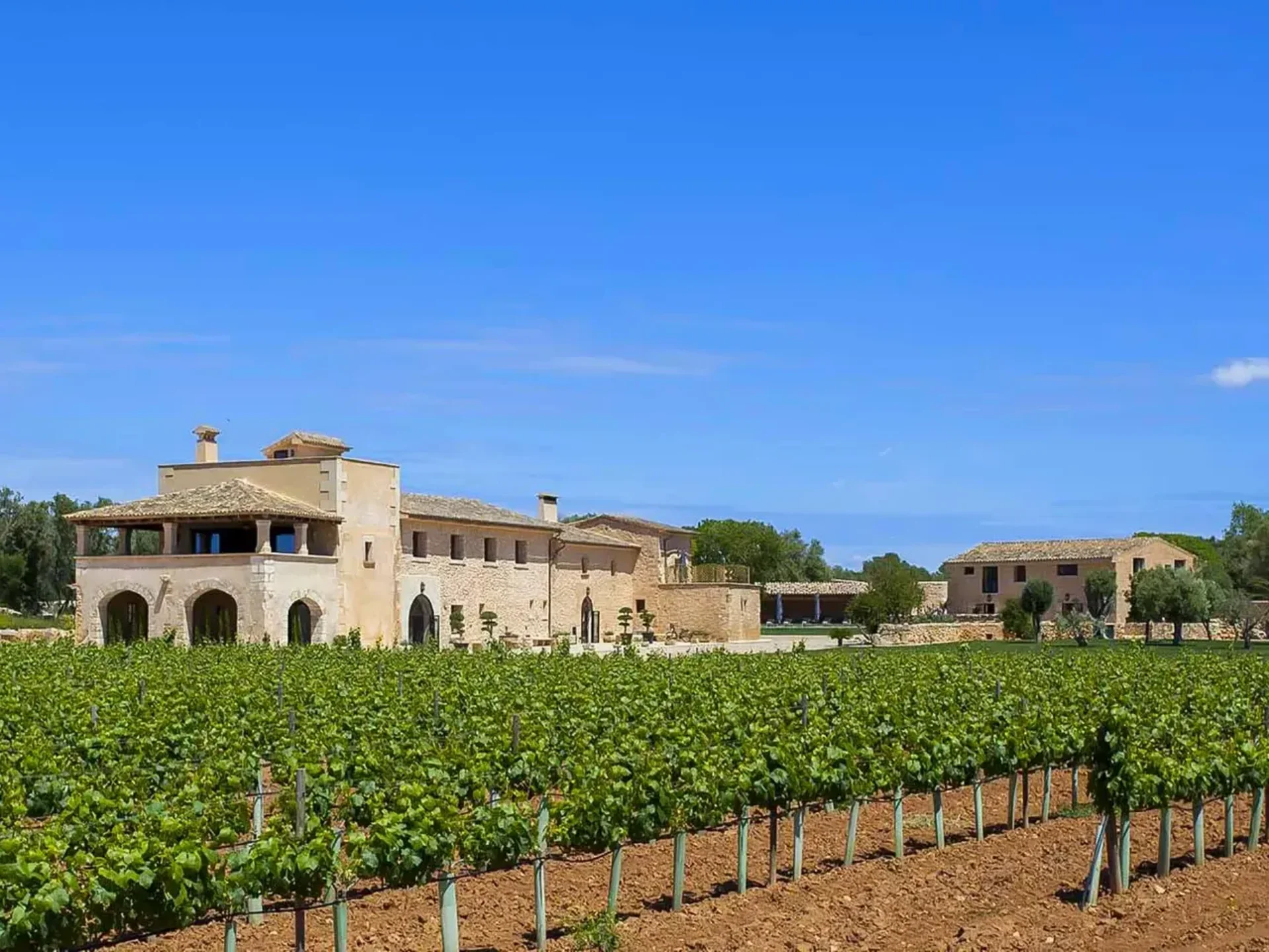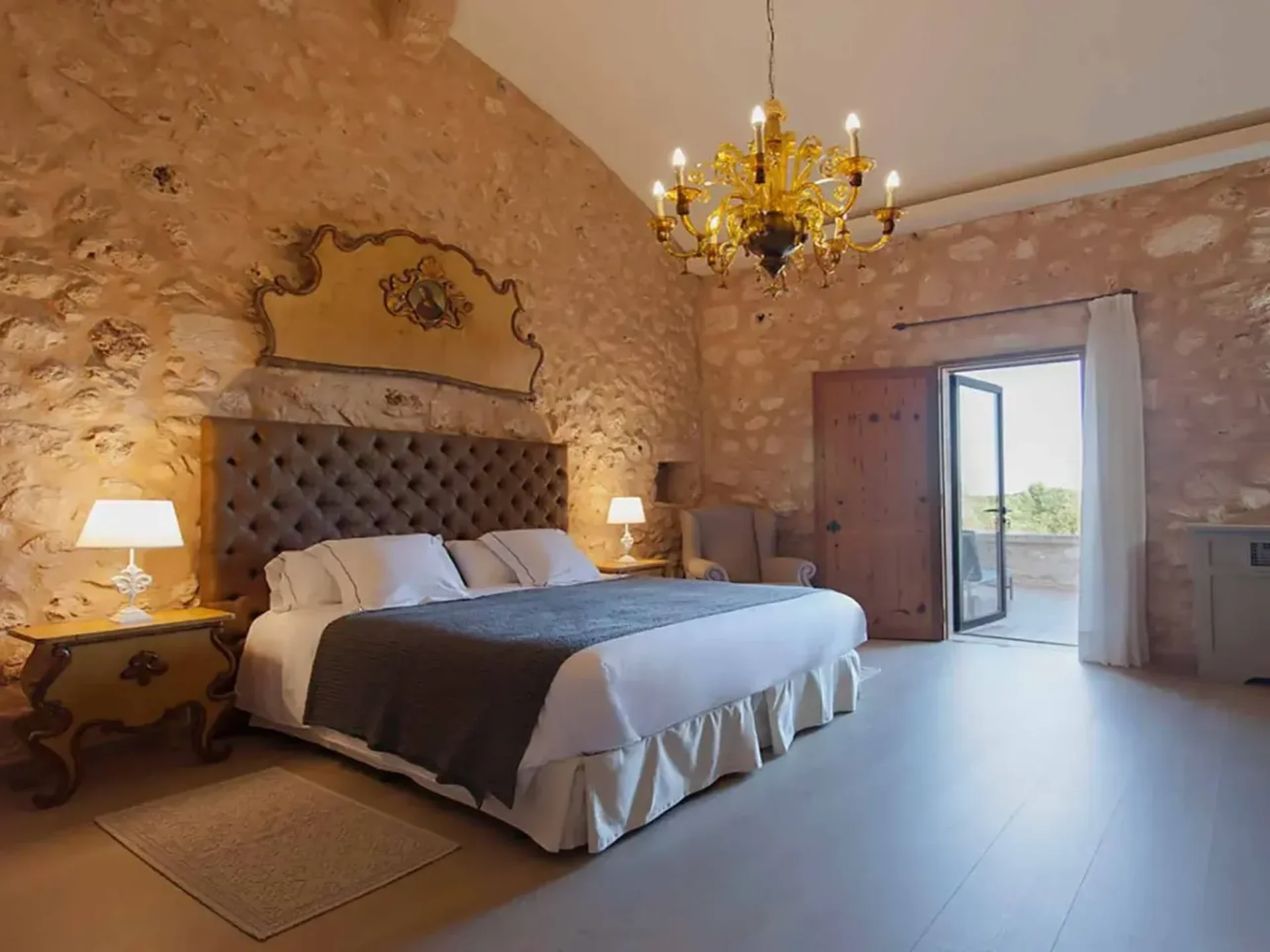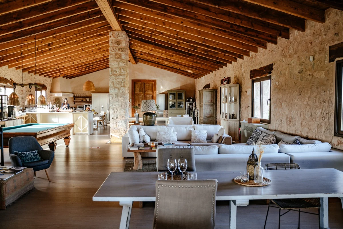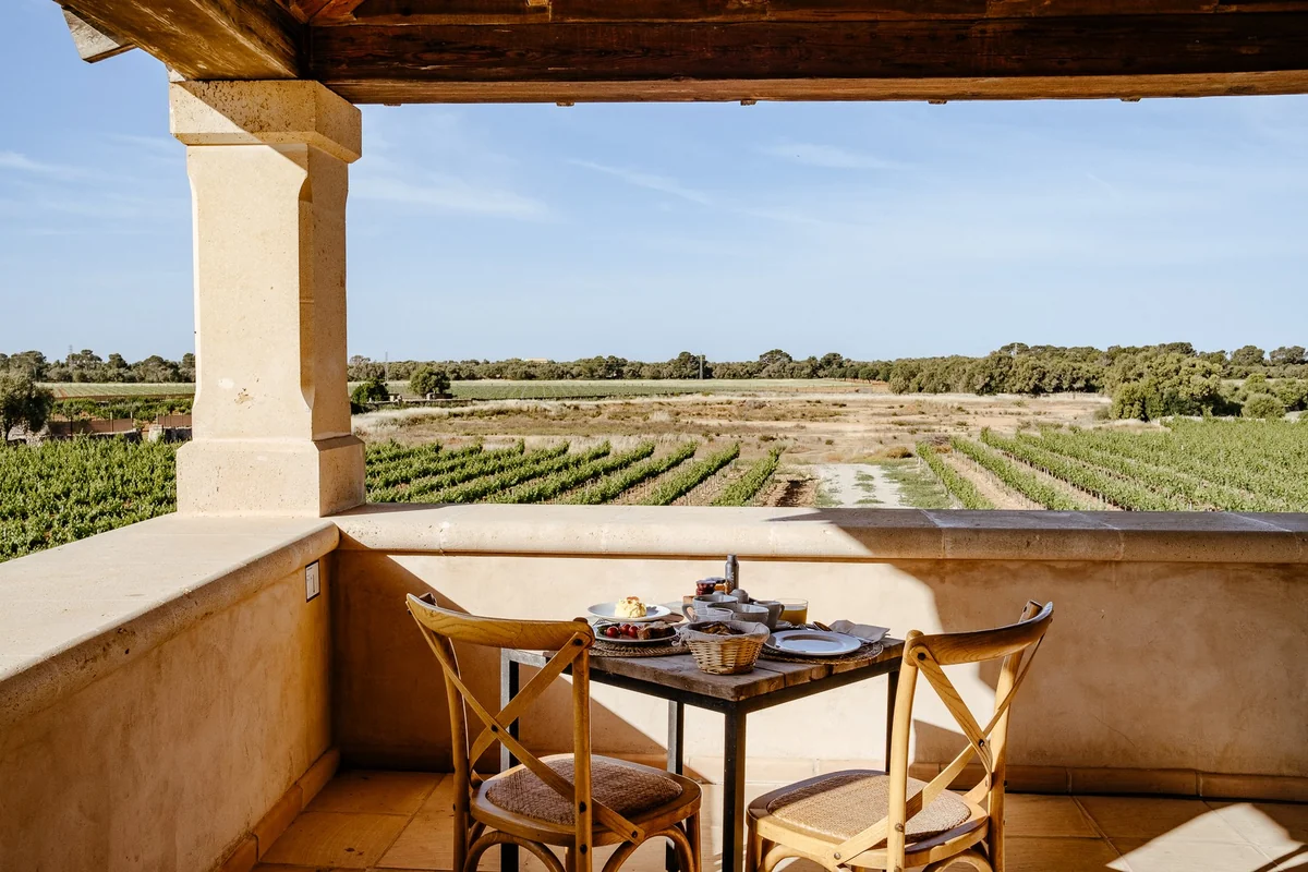 Inside, the villa’s atmosphere is warm and elegant. High beamed ceilings, traditional stone details, and soft natural tones highlight the property’s Mallorcan heritage. A spacious living room on the upper level features refined furnishings, a striking chandelier, and large glass doors that open onto a private terrace overlooking the surrounding vineyards. Most rooms enjoy private balconies or terraces with views across the gardens and countryside, while all feature en-suite bathrooms. A fully equipped kitchen and multiple indoor and outdoor dining areas provide ideal spaces for shared meals and relaxed entertaining.