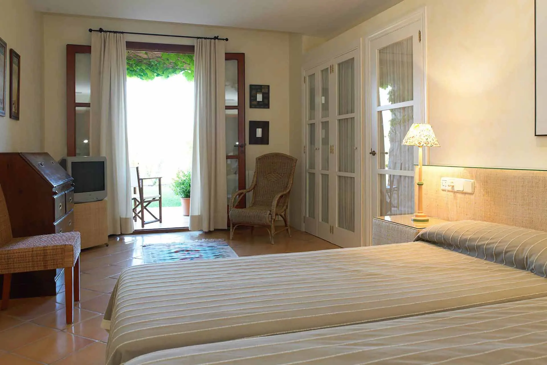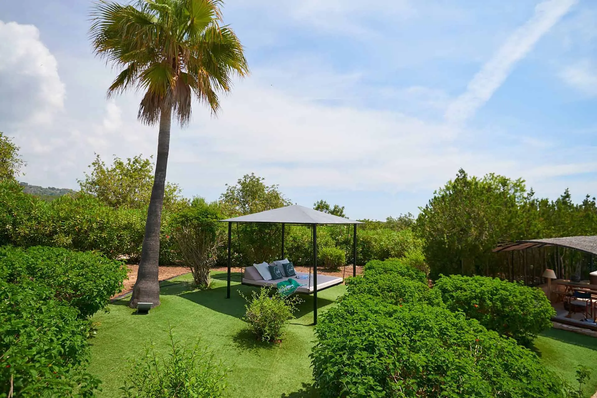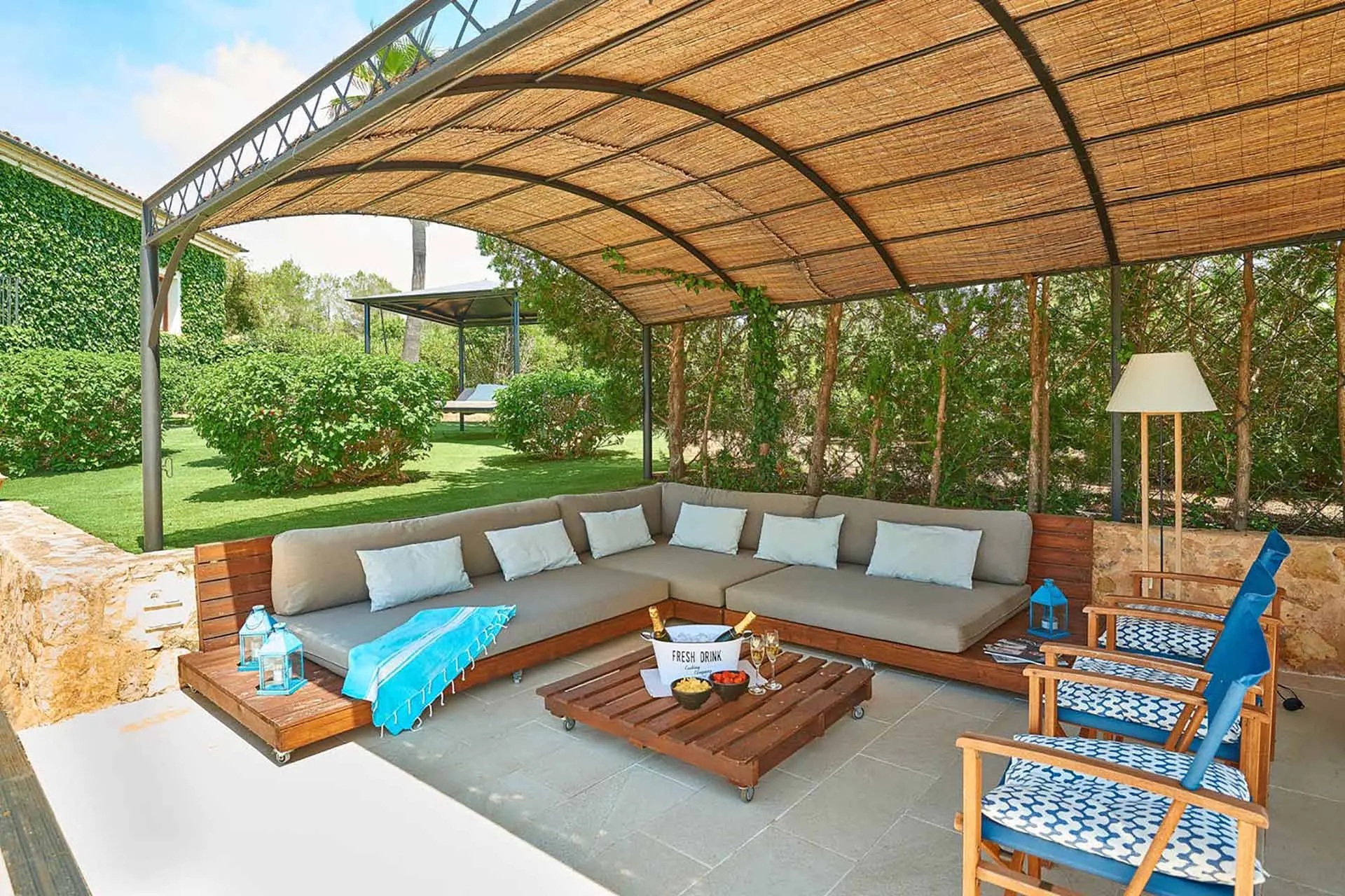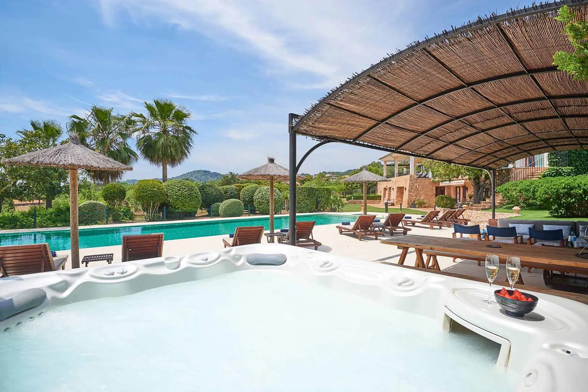 Outdoor living is central to the Golf D’or finca experience. Multiple terraces provide a variety of settings for dining and relaxation, with four dining areas both indoors and outdoors allowing guests to choose between shaded lunches, sunset dinners, or casual meals under the stars. A private jacuzzi, barbecue area, and chill-out lounge create inviting spaces to unwind after a day exploring the island.
