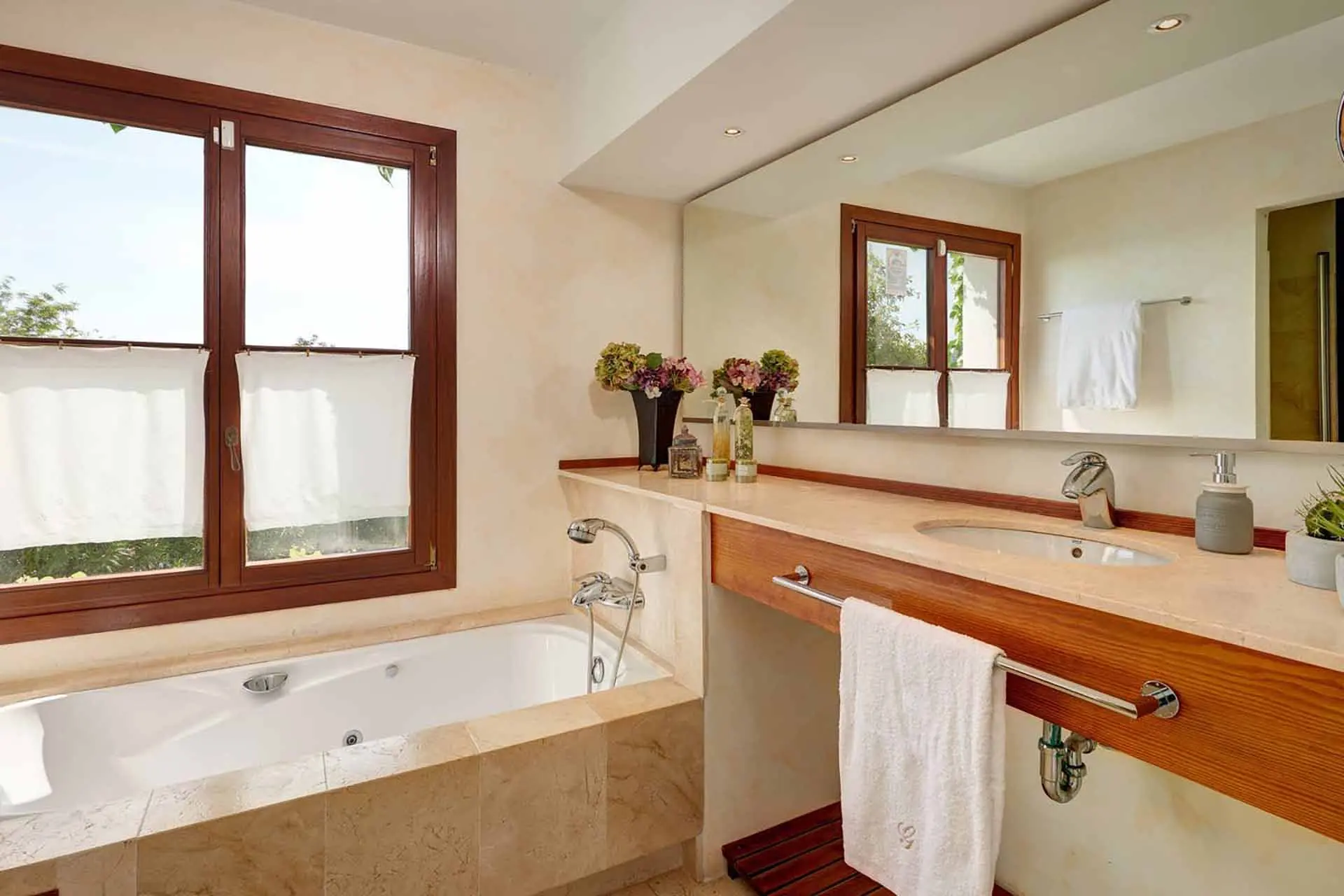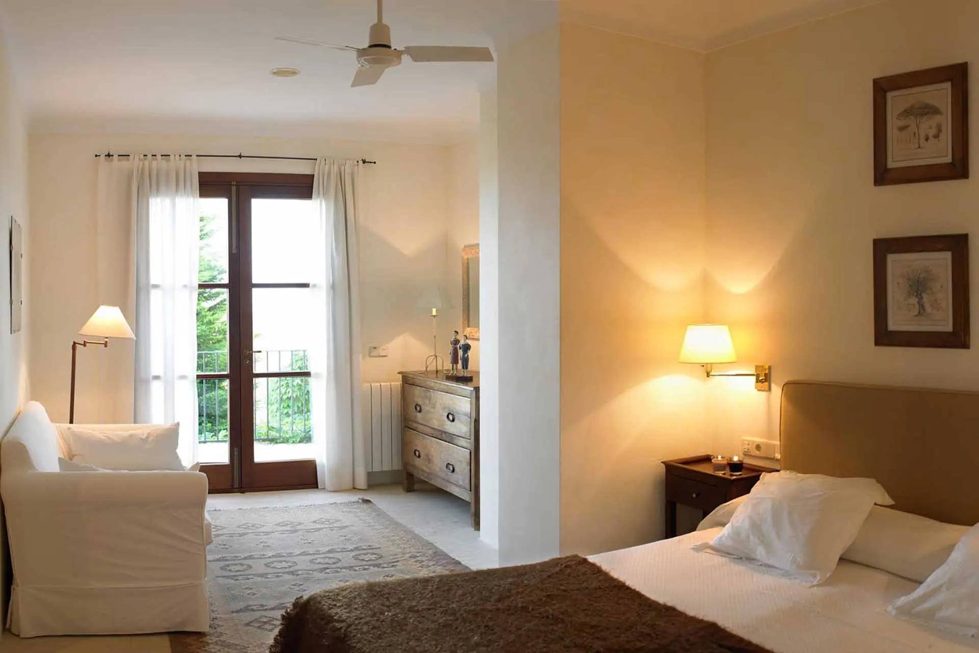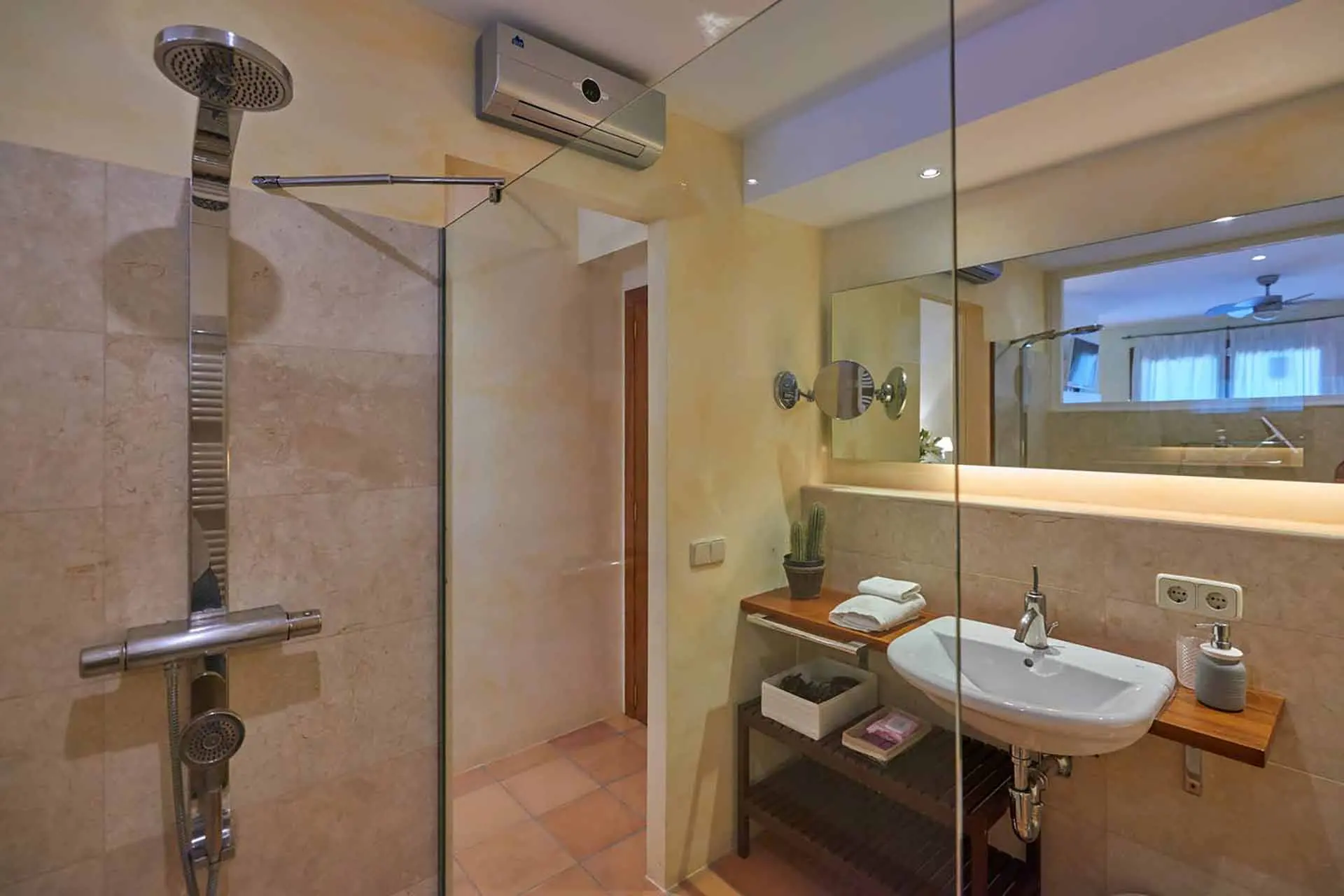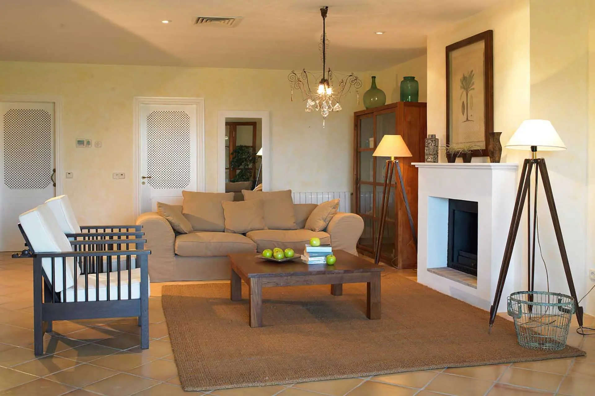 Outdoor living is central to the Golf D’or finca experience. Multiple terraces provide a variety of settings for dining and relaxation, with four dining areas both indoors and outdoors allowing guests to choose between shaded lunches, sunset dinners, or casual meals under the stars. A private jacuzzi, barbecue area, and chill-out lounge create inviting spaces to unwind after a day exploring the island.