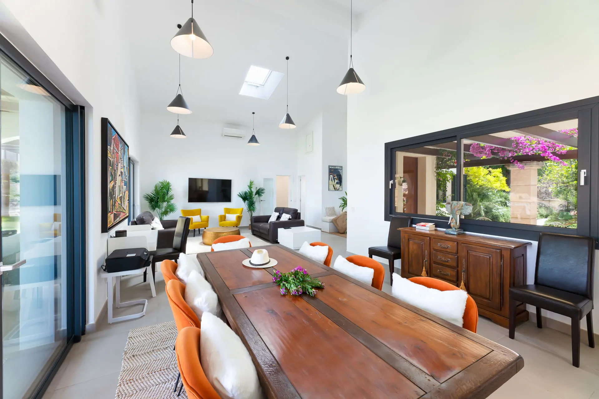 Outdoor living is the highlight of the villa. Beautifully landscaped gardens filled with native Mediterranean plants, including pine, orange, and almond trees surround the property, creating a tranquil and fragrant environment. The swimming pool appears to merge with the horizon, offering a serene place to cool off while gazing out over the shimmering Mediterranean. Comfortable sun loungers and a daybed invite guests to relax in the sunshine, while the peaceful surroundings make the terrace an ideal spot for evening stargazing.