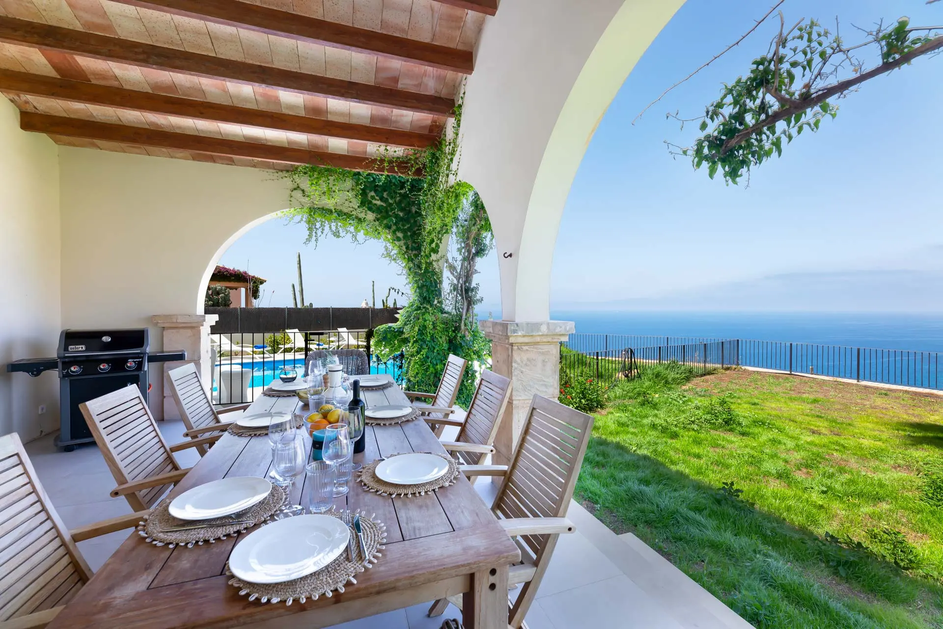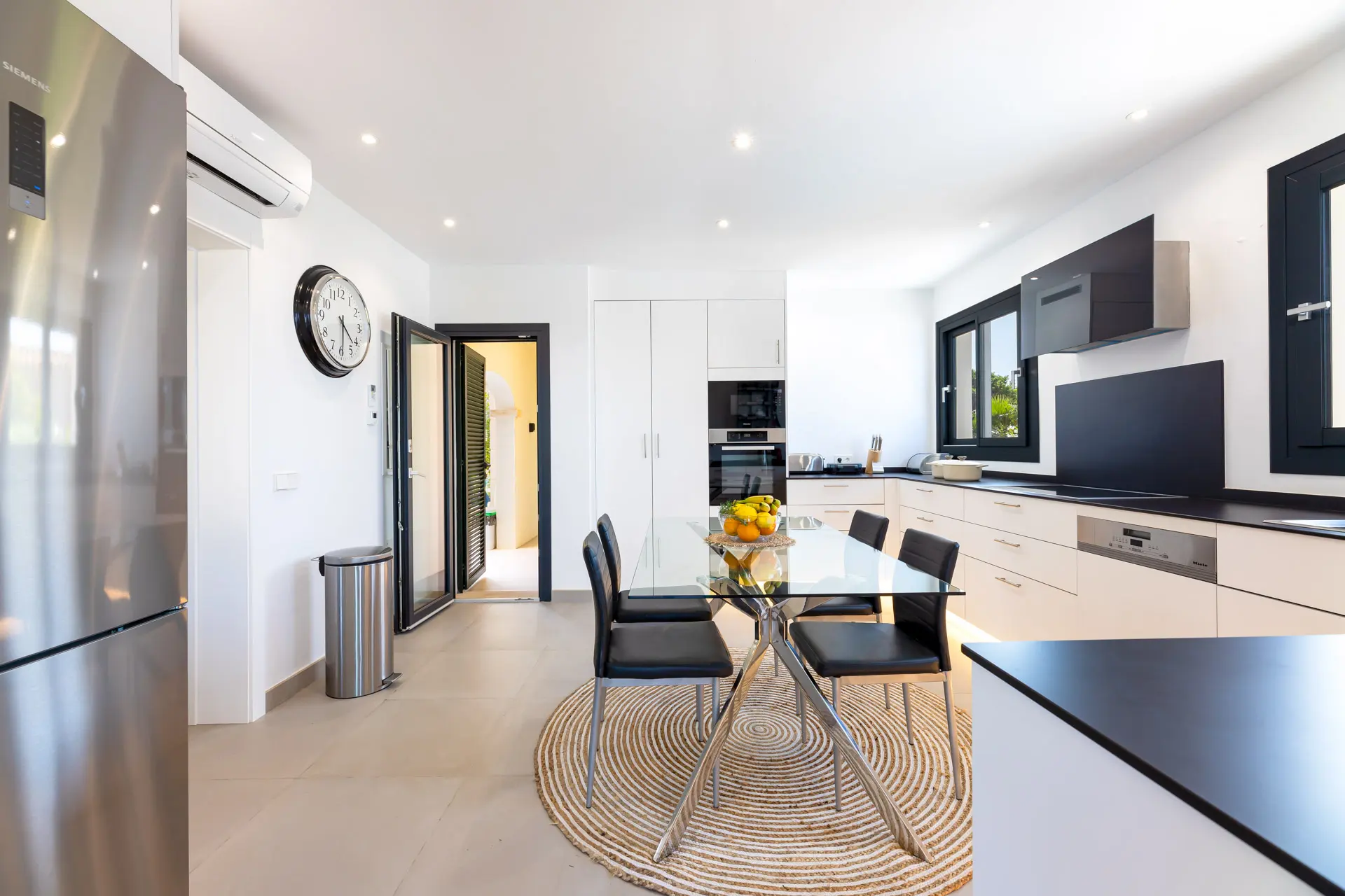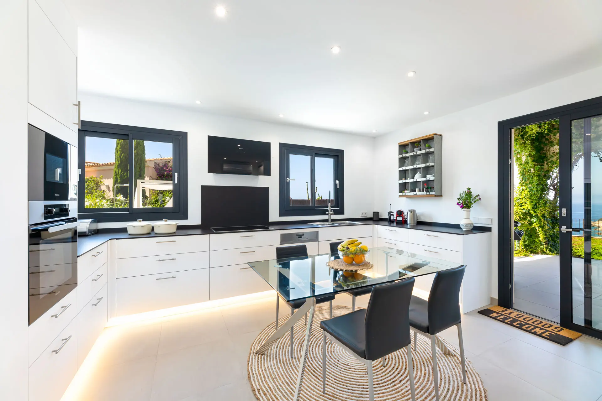 Recently refurbished, the villa combines contemporary comfort with relaxed Mediterranean charm. Bright interiors, high ceilings, and large openings fill the living spaces with natural light while framing spectacular views of the coastline and surrounding mountains. The open-plan living and dining area forms the heart of the home, featuring an elegant oak dining table for eight guests and a comfortable lounge area. The modern kitchen is equipped with high-end Miele appliances and connects directly to the outdoor dining and barbecue area, creating a seamless transition between indoor and outdoor living. This space is perfect for preparing relaxed lunches or sunset dinners while enjoying sweeping mountain and sea views.