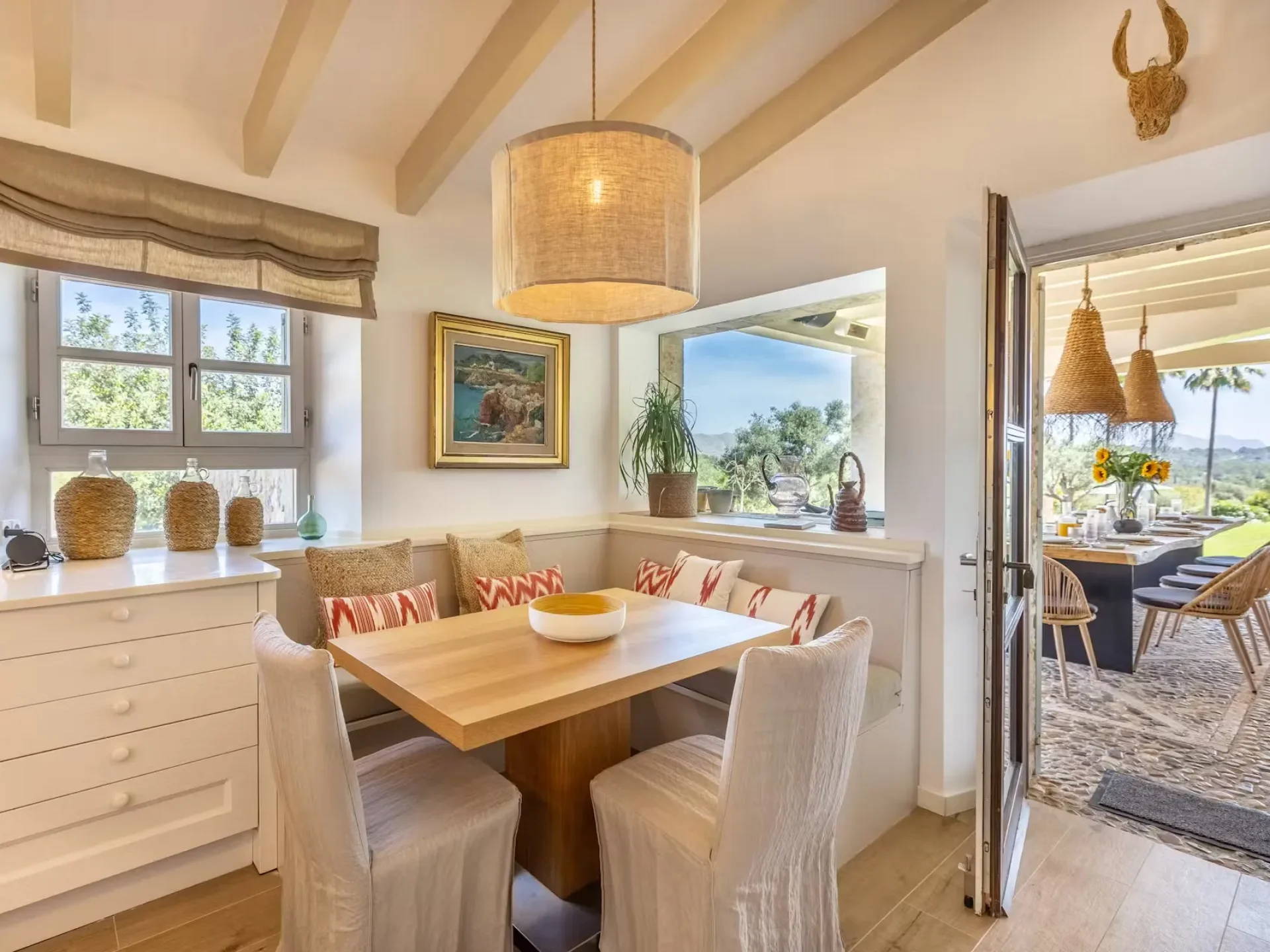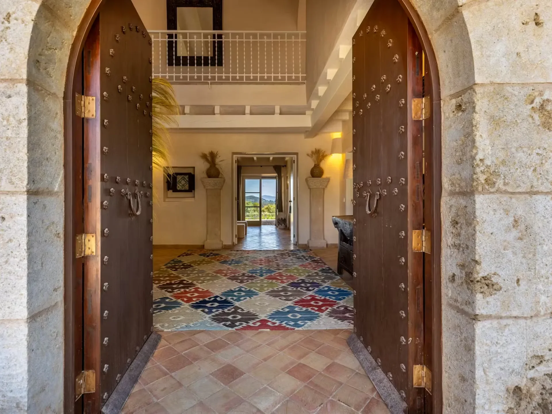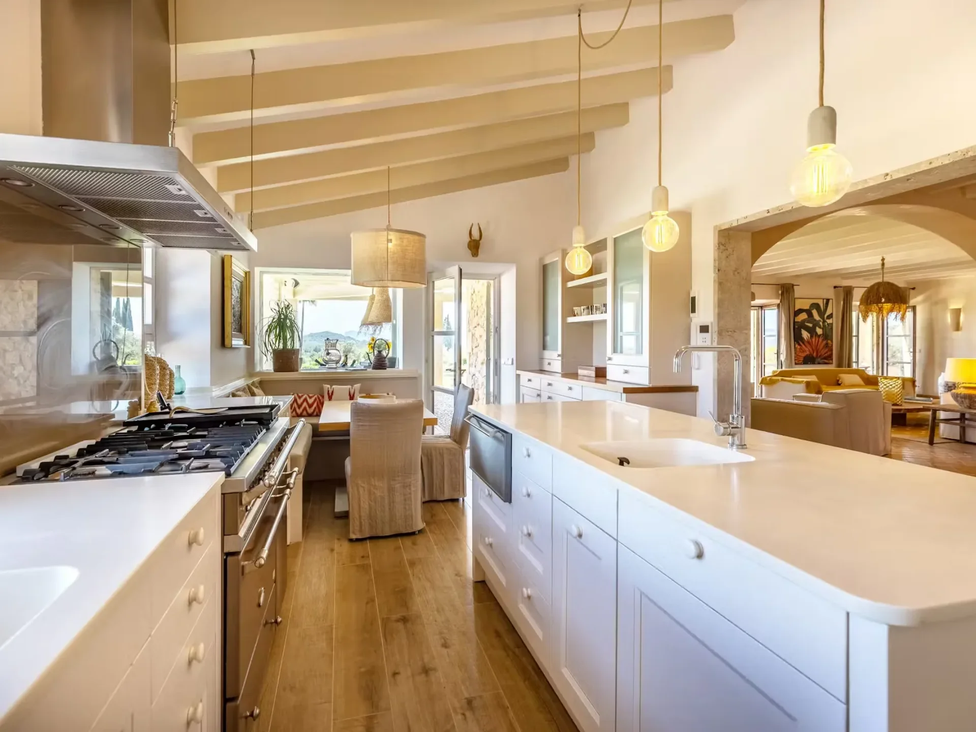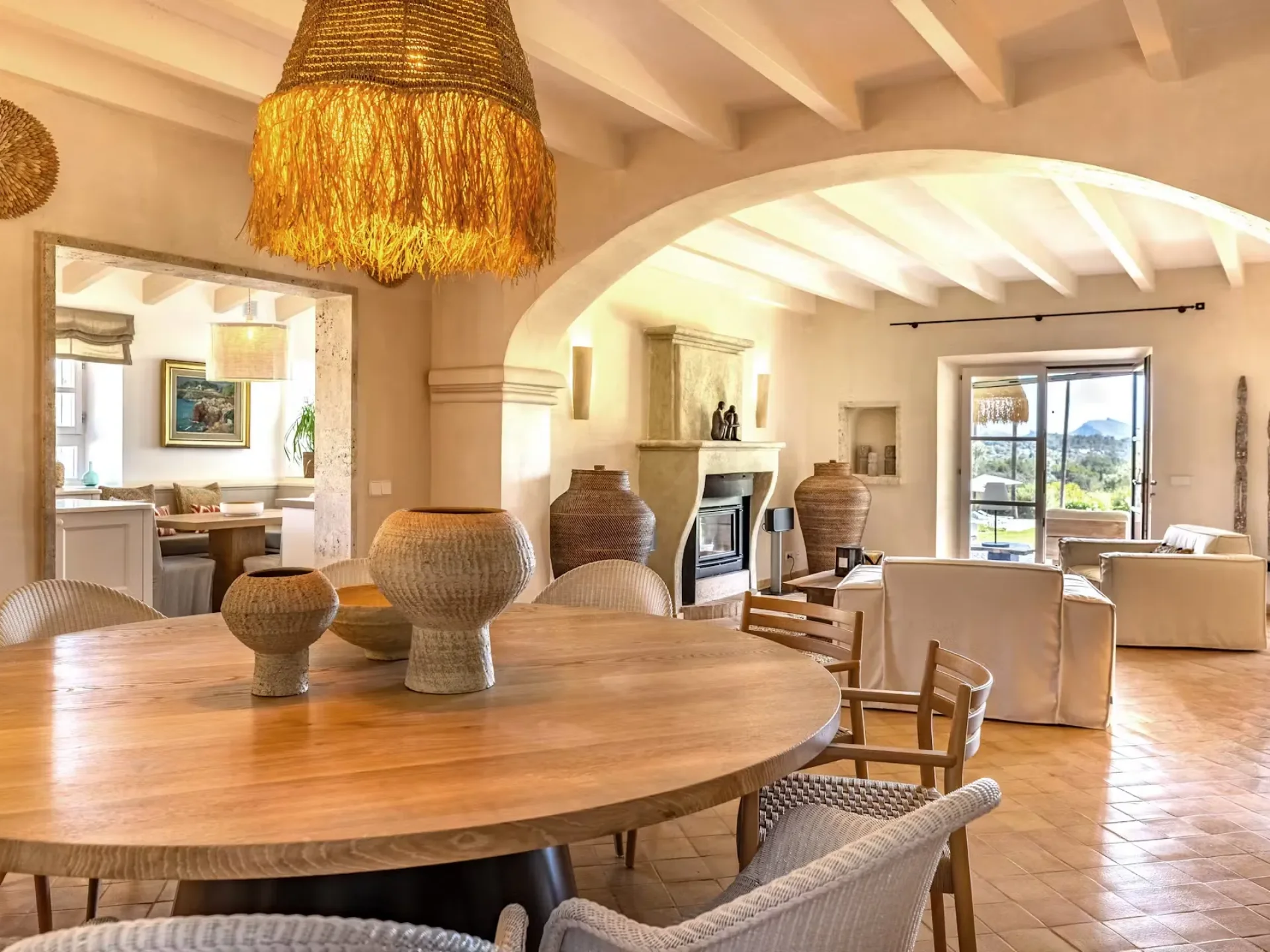 Inside, the finca reveals warm and inviting interiors characterised by impressive wooden ceiling beams, natural materials, and carefully selected furnishings that reflect the charm of classic Mallorcan style. The villa accommodates up to ten guests across five spacious bedrooms, each complemented by its own bathroom, creating a comfortable and private setting for families or groups of friends. The living spaces are designed for relaxed countryside living, with elegant lounges, a fully equipped kitchen, and inviting communal areas that open naturally onto the surrounding terraces and gardens. High ceilings and traditional architectural details enhance the sense of space and authenticity throughout the home.