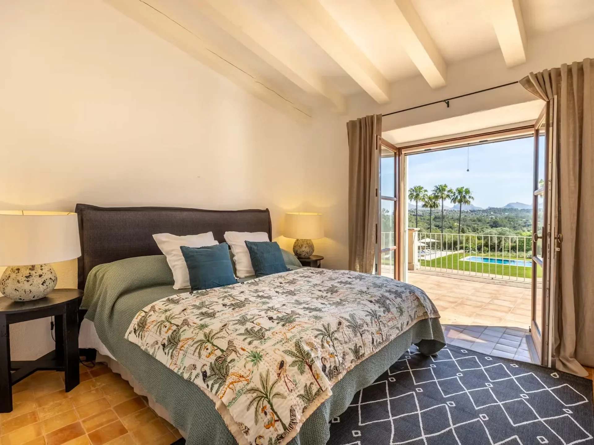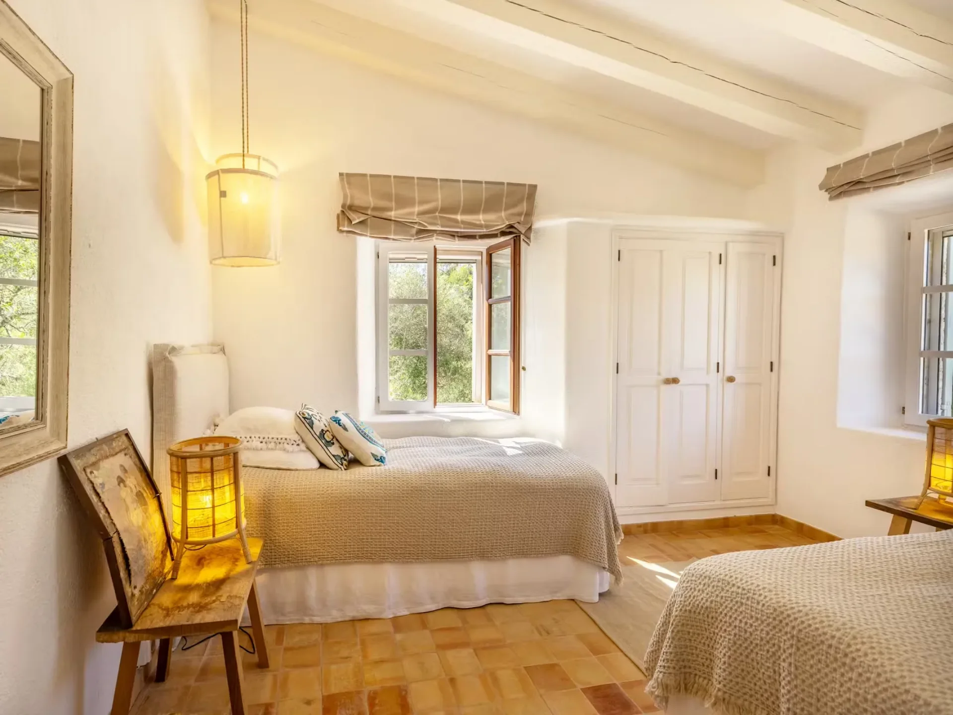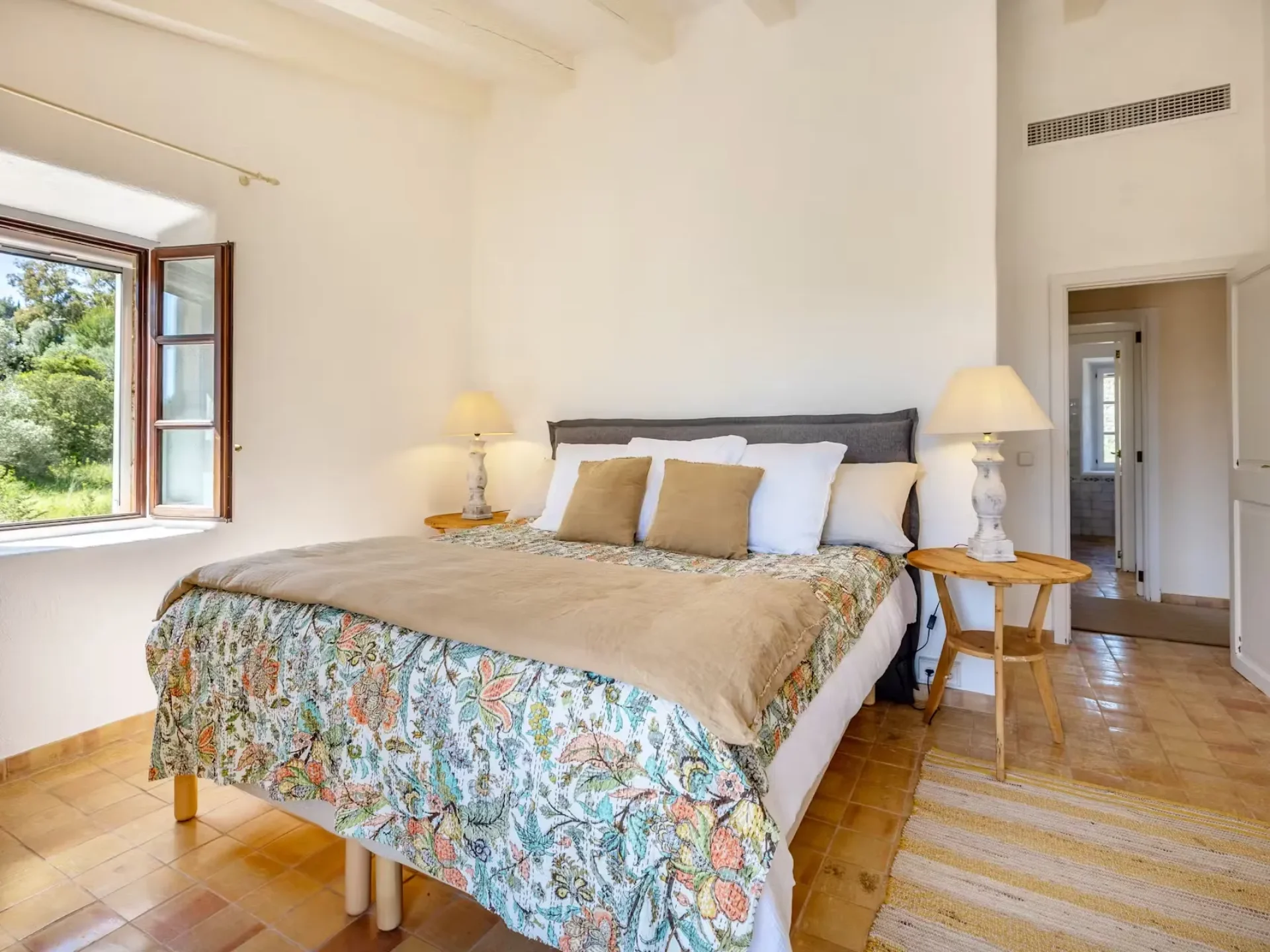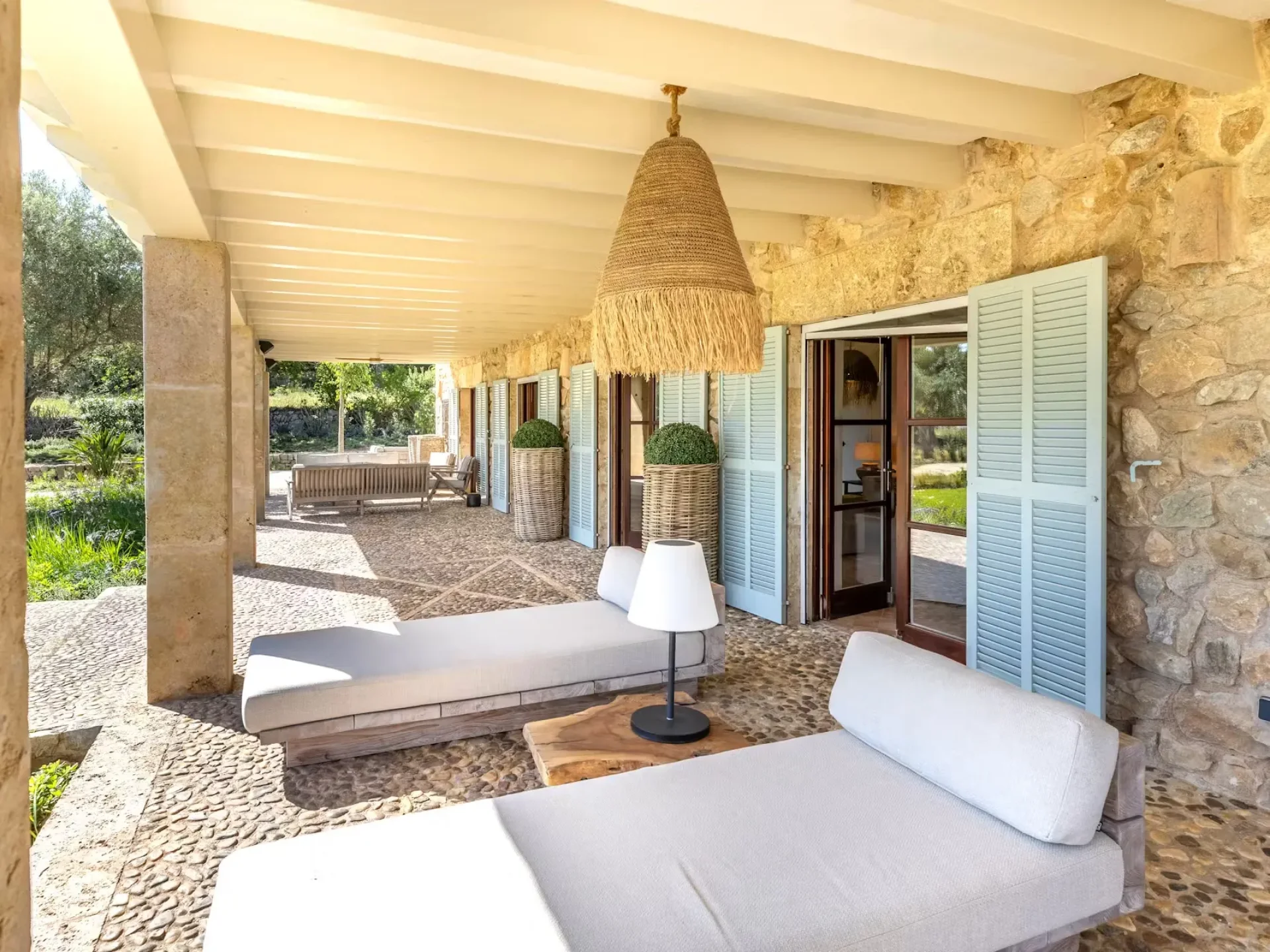 Inside, the finca reveals warm and inviting interiors characterised by impressive wooden ceiling beams, natural materials, and carefully selected furnishings that reflect the charm of classic Mallorcan style. The villa accommodates up to ten guests across five spacious bedrooms, each complemented by its own bathroom, creating a comfortable and private setting for families or groups of friends. The living spaces are designed for relaxed countryside living, with elegant lounges, a fully equipped kitchen, and inviting communal areas that open naturally onto the surrounding terraces and gardens. High ceilings and traditional architectural details enhance the sense of space and authenticity throughout the home.