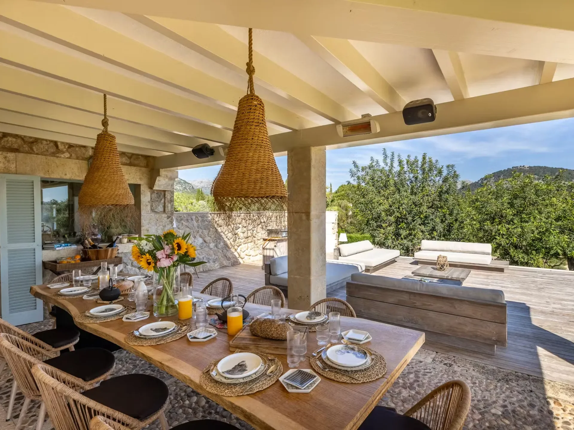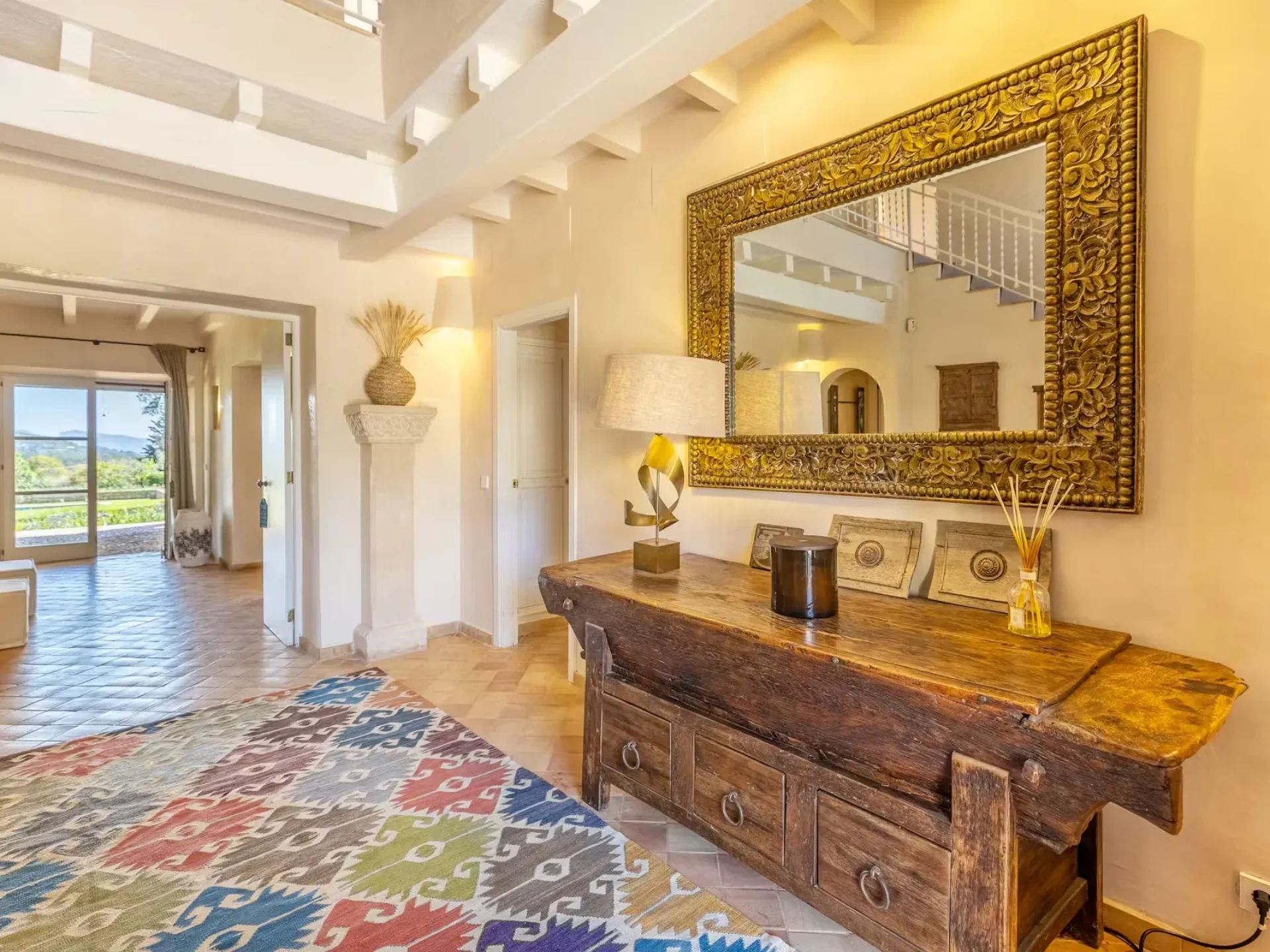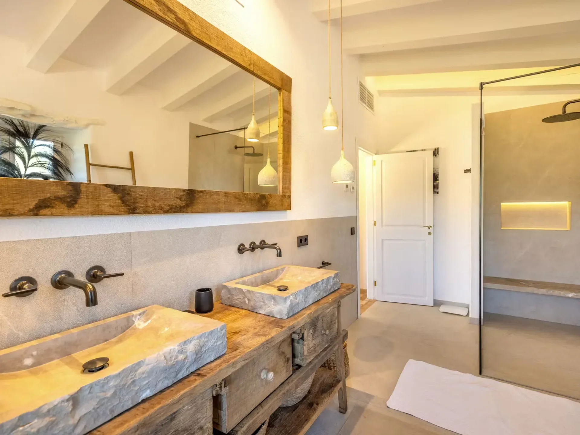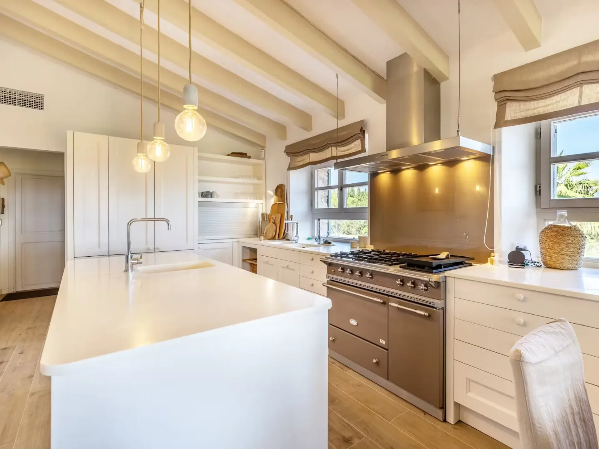 Inside, the finca reveals warm and inviting interiors characterised by impressive wooden ceiling beams, natural materials, and carefully selected furnishings that reflect the charm of classic Mallorcan style. The villa accommodates up to ten guests across five spacious bedrooms, each complemented by its own bathroom, creating a comfortable and private setting for families or groups of friends. The living spaces are designed for relaxed countryside living, with elegant lounges, a fully equipped kitchen, and inviting communal areas that open naturally onto the surrounding terraces and gardens. High ceilings and traditional architectural details enhance the sense of space and authenticity throughout the home.