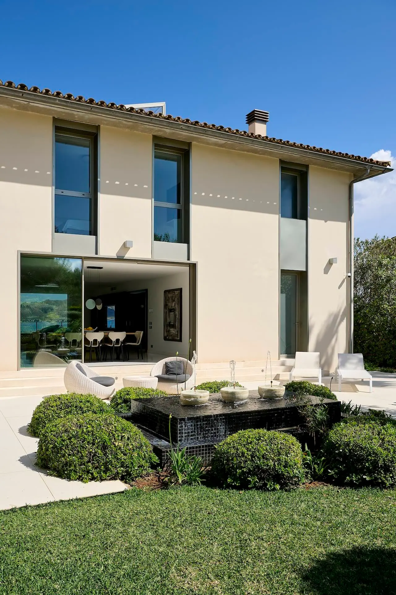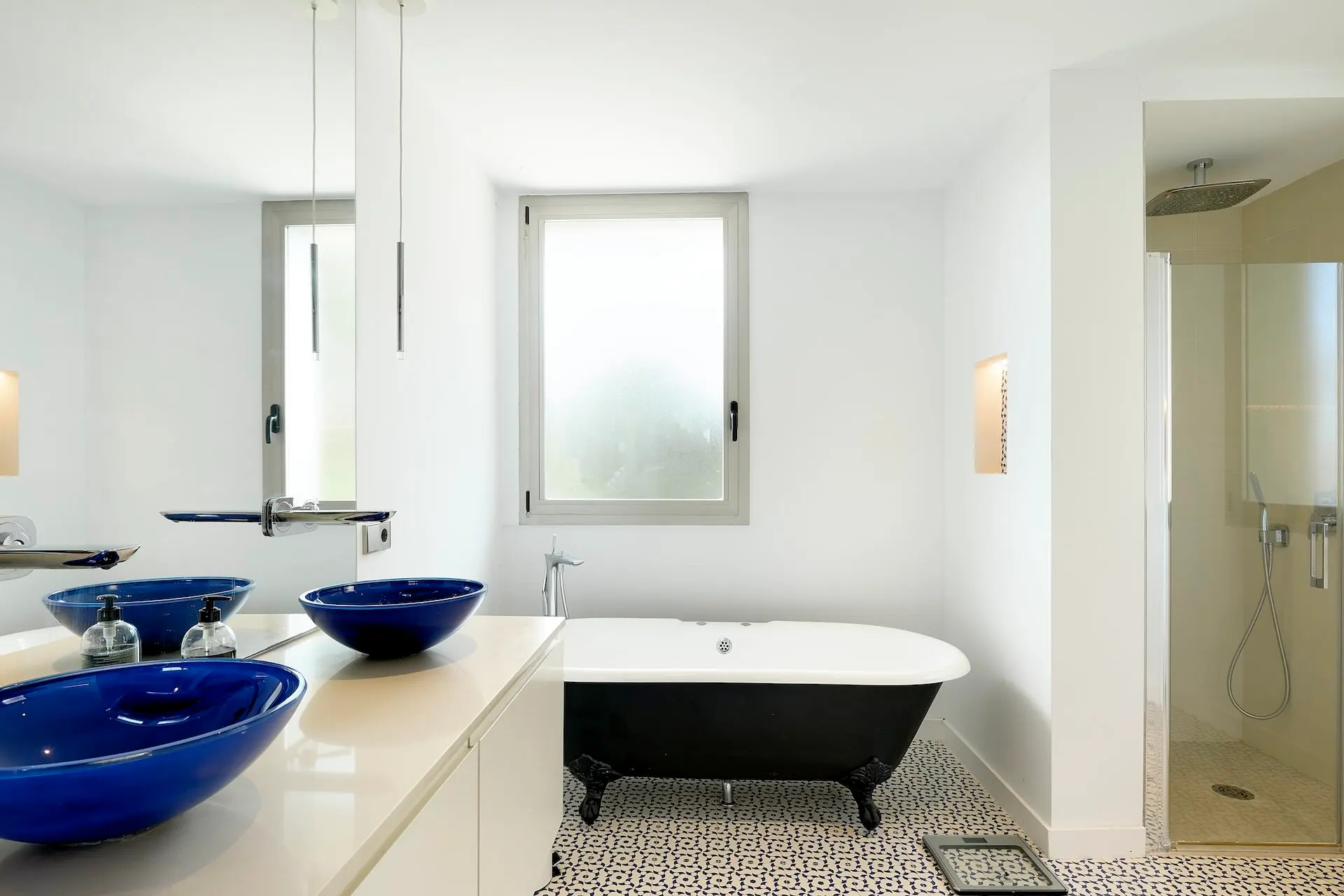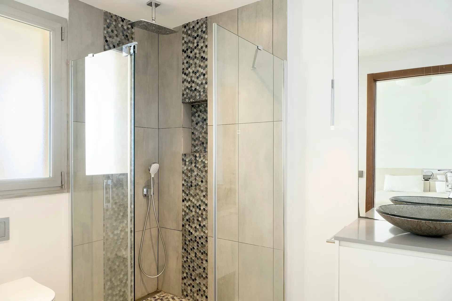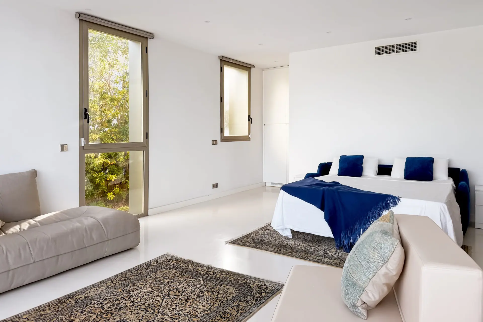 The villa’s interior is bright, modern, and designed to make the most of its spectacular sea views. Large floor-to-ceiling windows flood the open-plan living and dining spaces with natural light while seamlessly connecting the indoor areas with the terraces outside. A fully equipped contemporary kitchen provides everything needed for relaxed holiday living. The property features five comfortable bedrooms, each with its own bathroom, offering both privacy and comfort. Upstairs bedrooms open onto a large panoramic terrace overlooking the bay, while an additional flexible room on the ground floor can serve as a guest bedroom, wellness area, or quiet reading space.