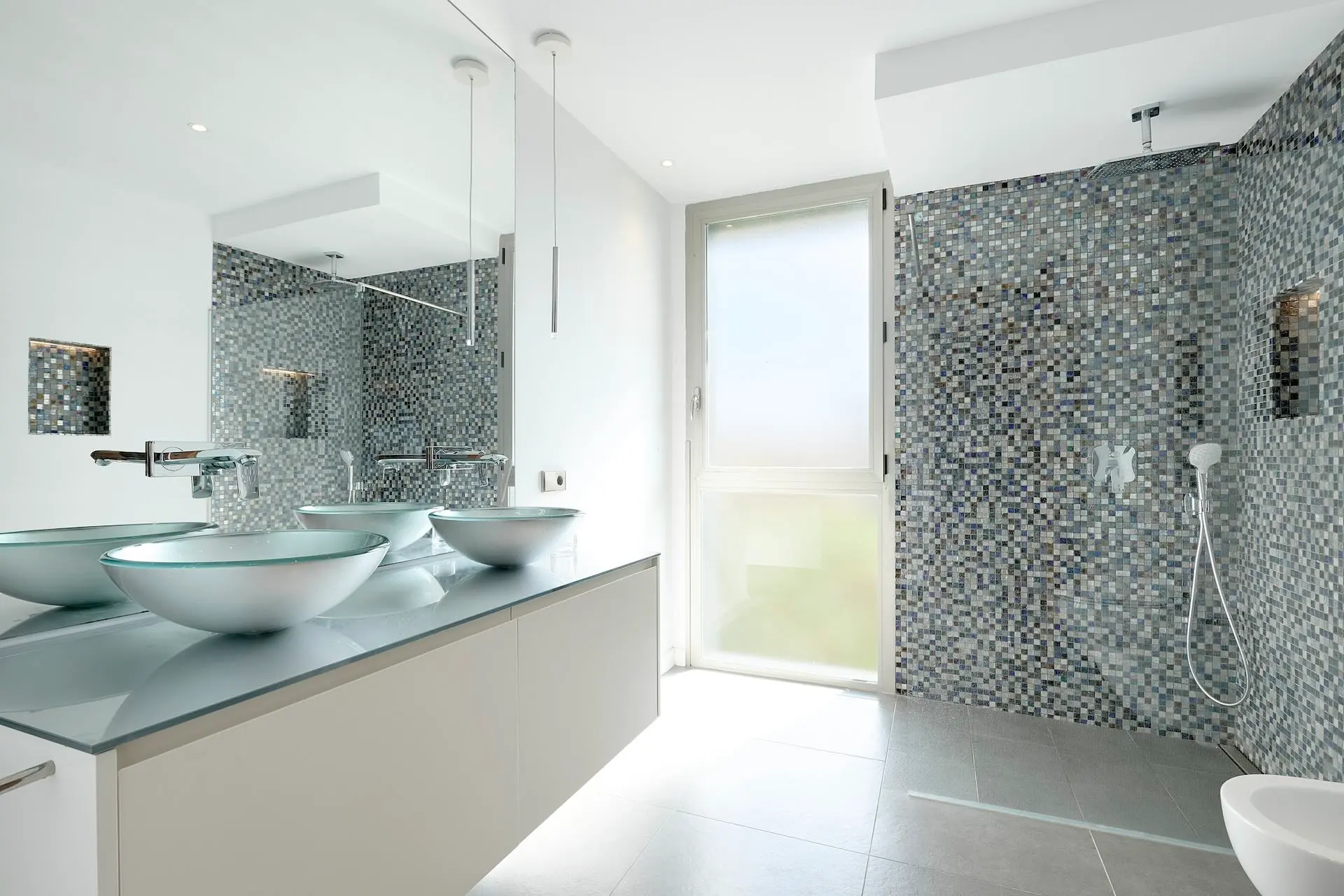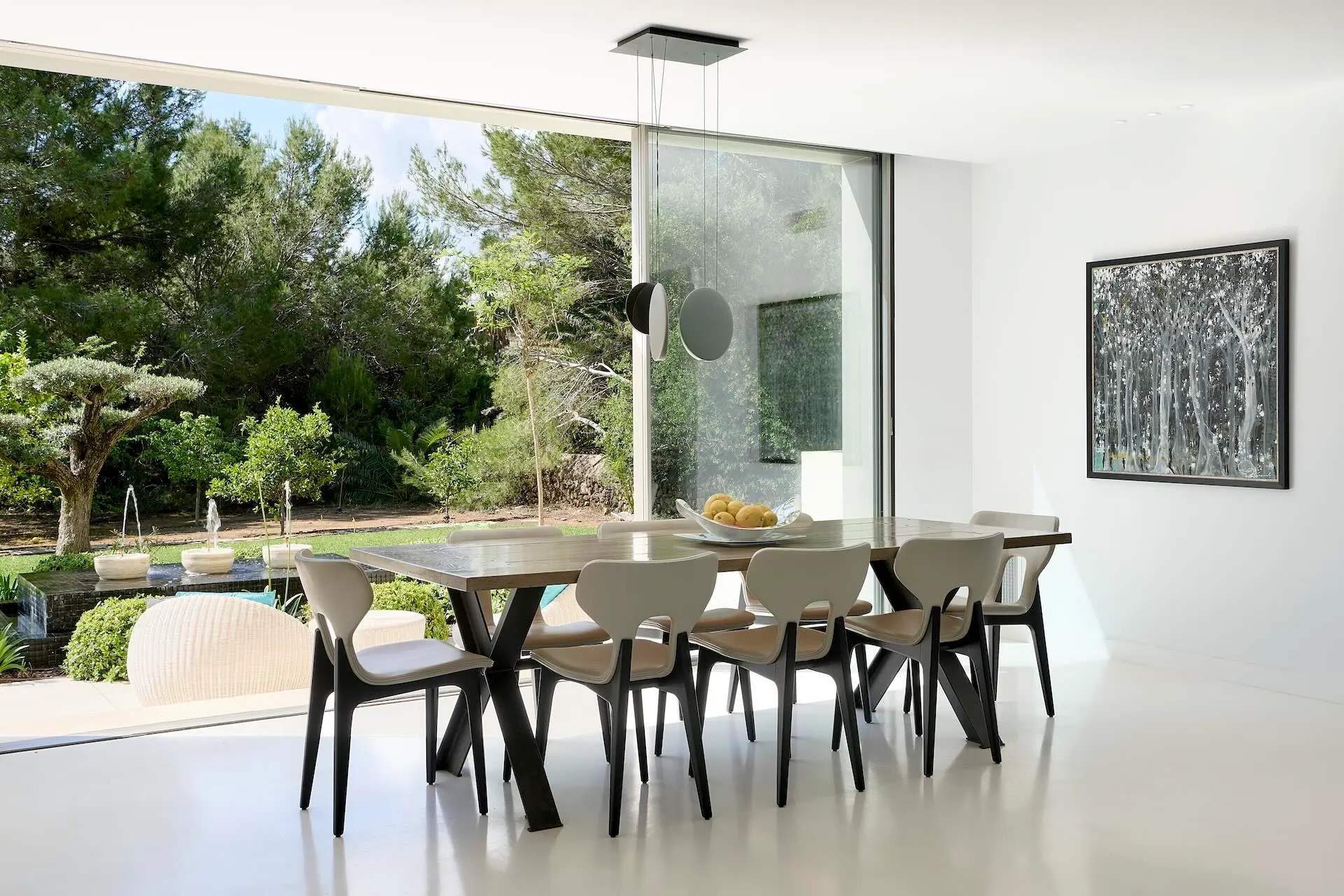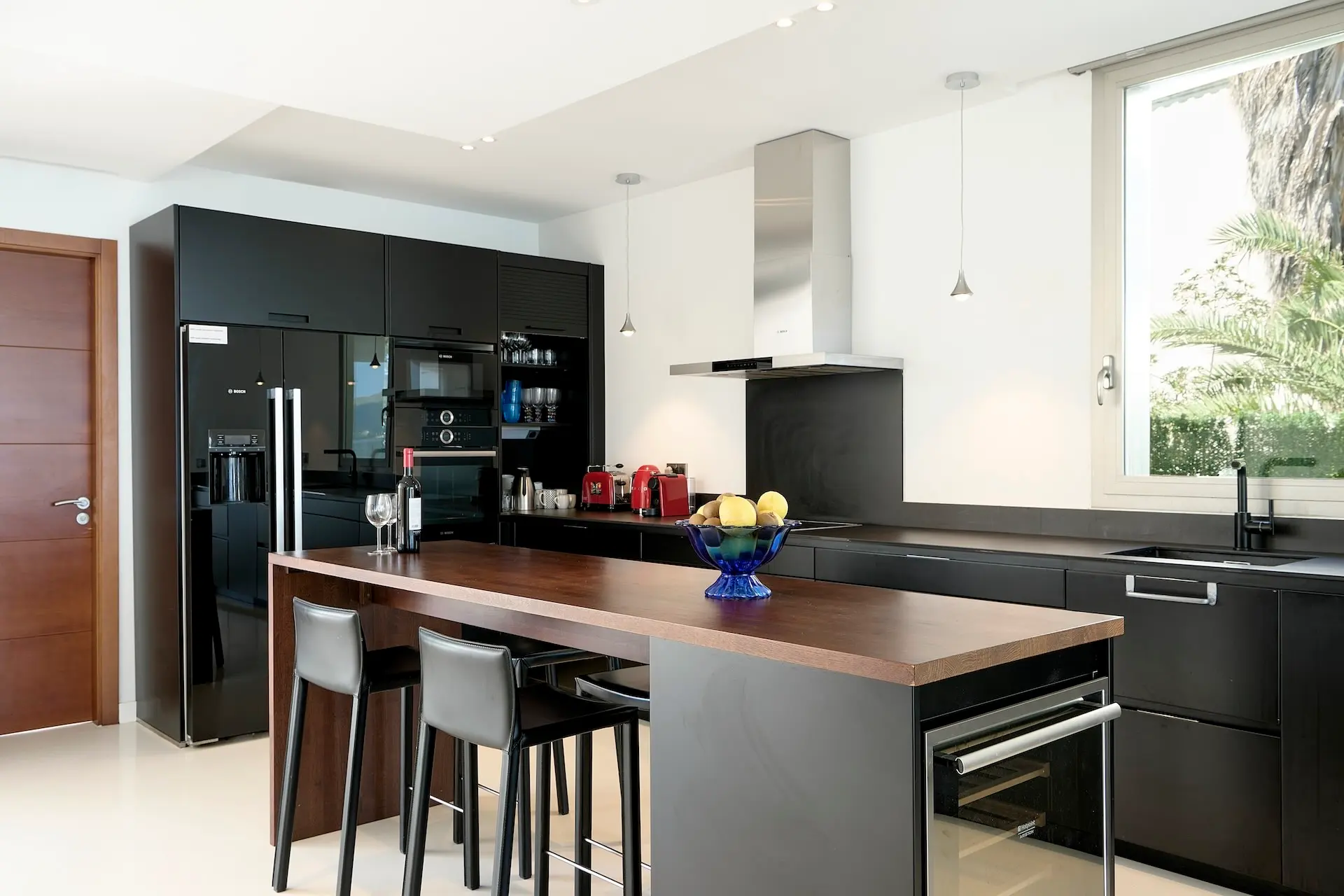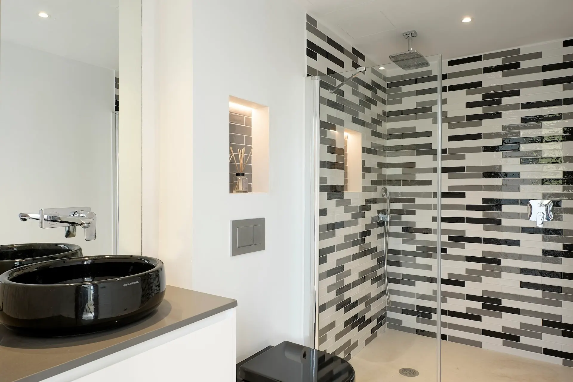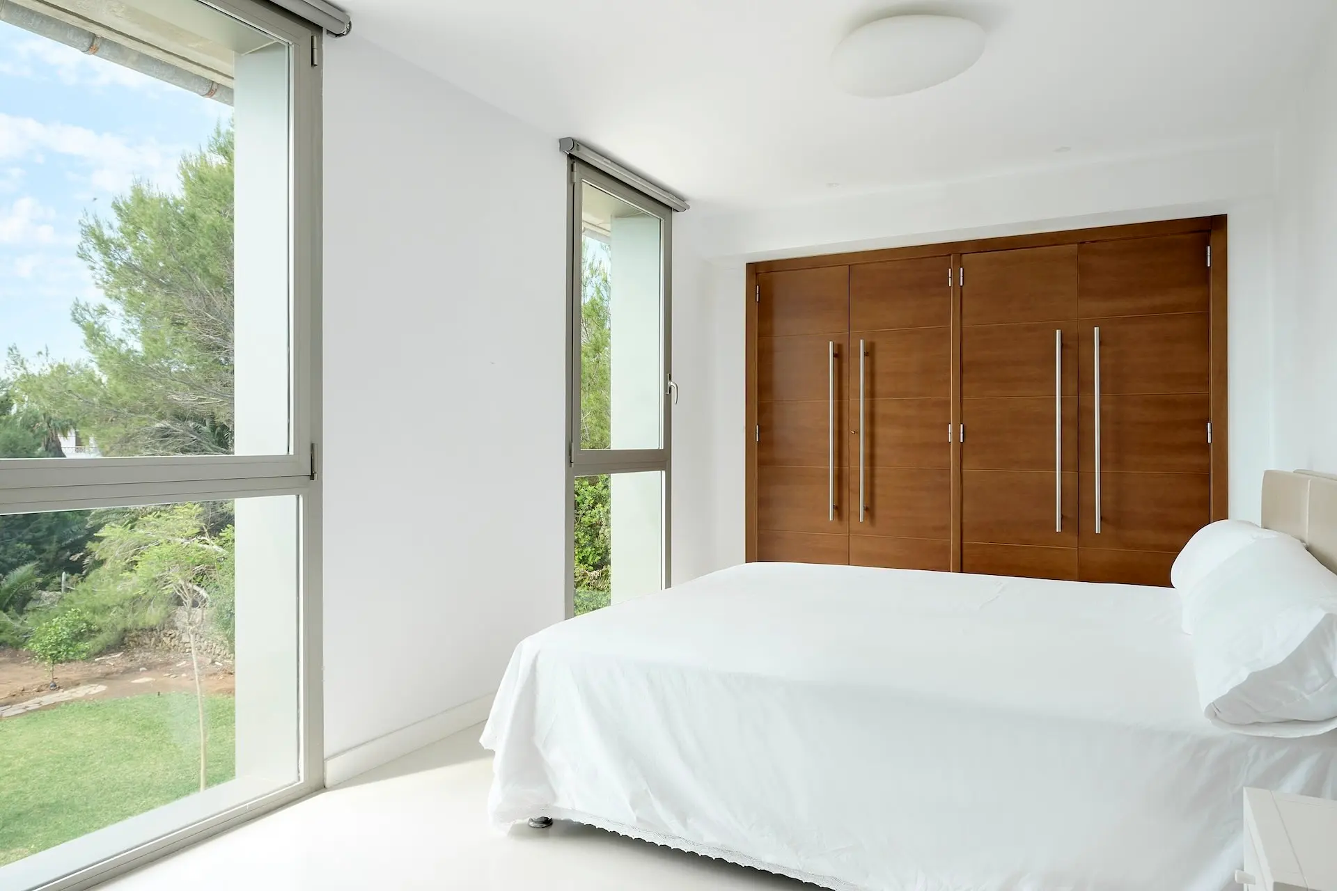 The villa’s interior is bright, modern, and designed to make the most of its spectacular sea views. Large floor-to-ceiling windows flood the open-plan living and dining spaces with natural light while seamlessly connecting the indoor areas with the terraces outside. A fully equipped contemporary kitchen provides everything needed for relaxed holiday living. The property features five comfortable bedrooms, each with its own bathroom, offering both privacy and comfort. Upstairs bedrooms open onto a large panoramic terrace overlooking the bay, while an additional flexible room on the ground floor can serve as a guest bedroom, wellness area, or quiet reading space.