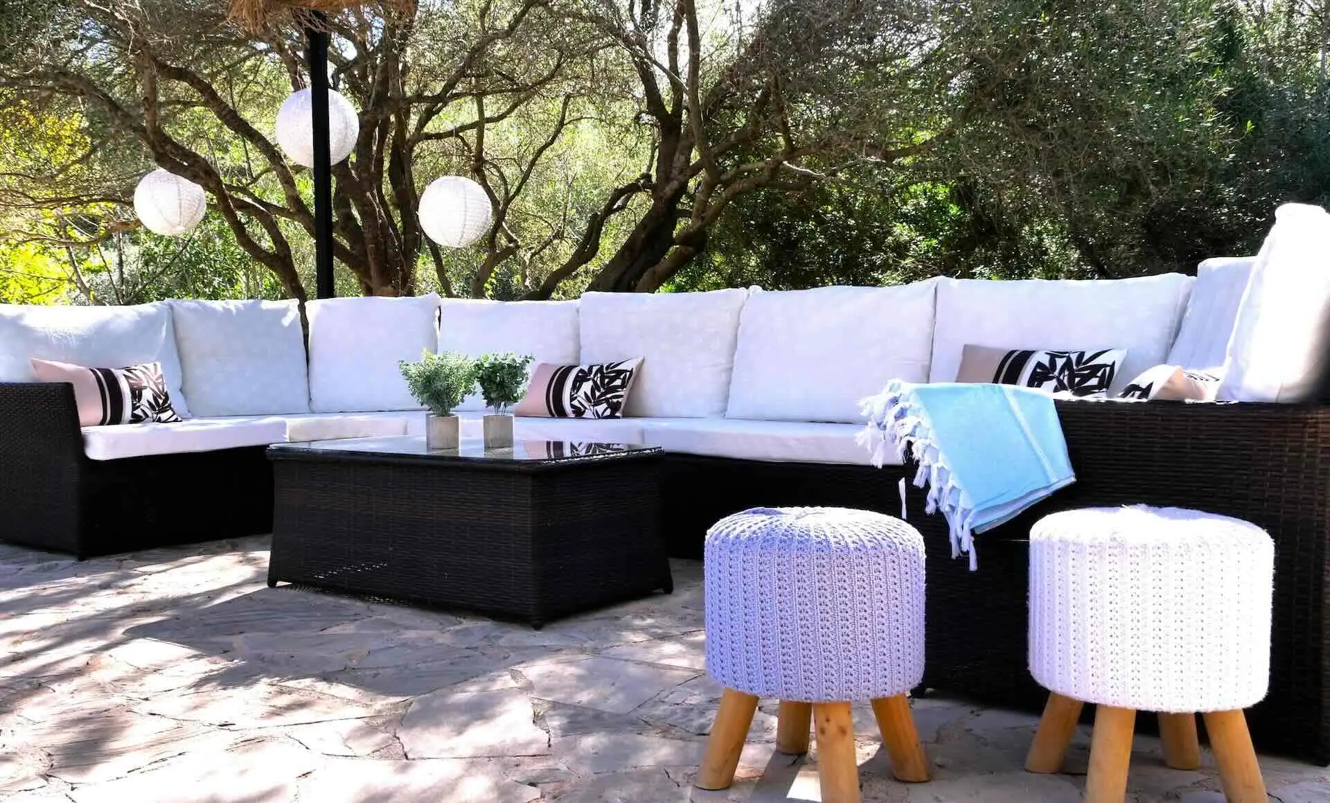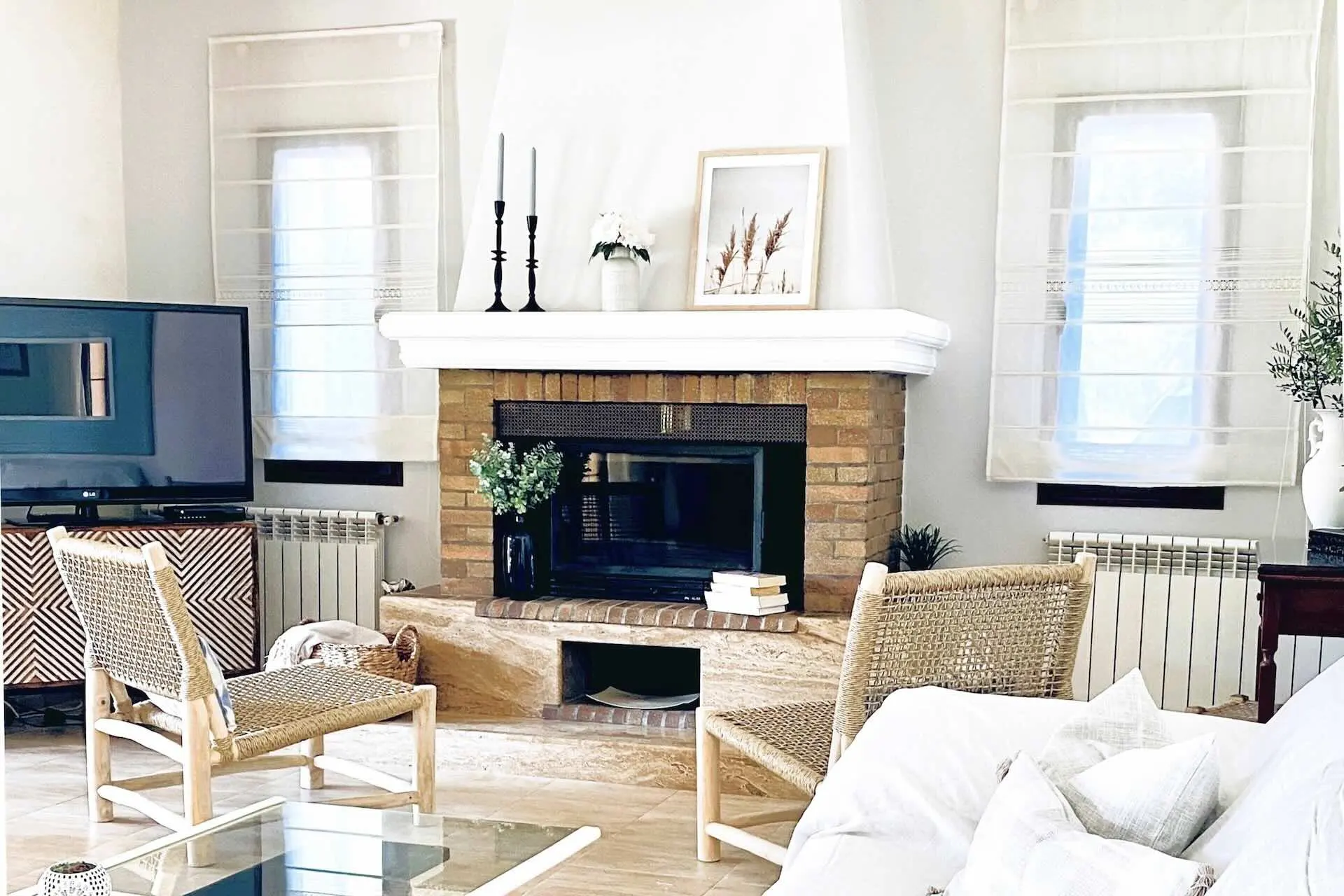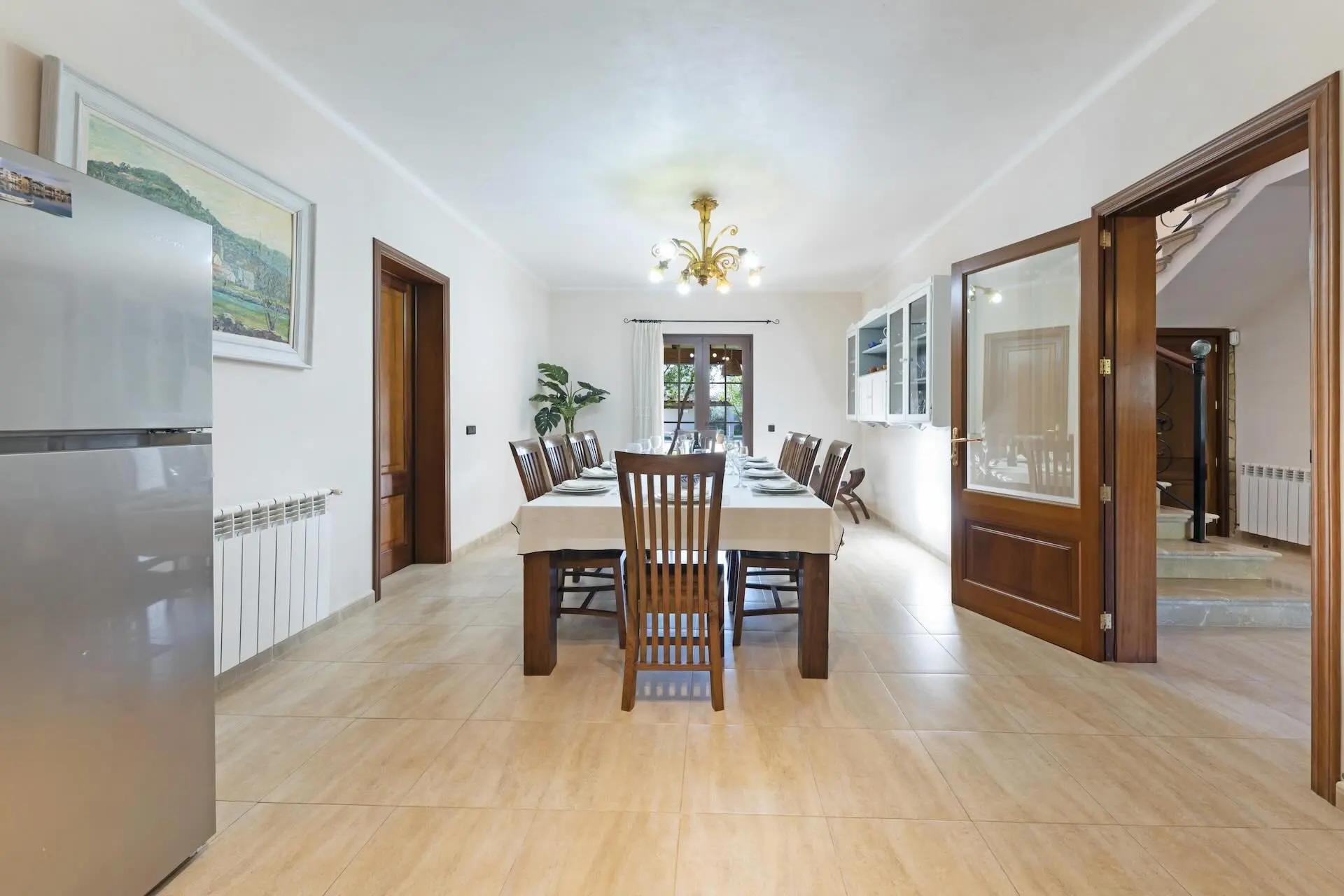 The interiors are designed to create a calm and welcoming atmosphere, where rustic architectural elements meet contemporary finishes. At the centre of the house is a generous living room featuring a cosy fireplace area that provides a perfect space for relaxing evenings. The fully equipped kitchen includes high-quality appliances, a breakfast bar, and a dining area comfortably seating twelve guests, making it ideal for shared meals and gatherings. The main house offers five carefully designed bedrooms, four of which are double rooms with en-suite bathrooms. One of the suites includes a luxurious Jacuzzi bathtub for an added touch of comfort. A twin bedroom with a private bathroom located in the hallway provides additional flexibility for families or groups. For even greater privacy, a sixth suite is located in a separate garden extension, featuring its own bathroom, television, and private terrace.
