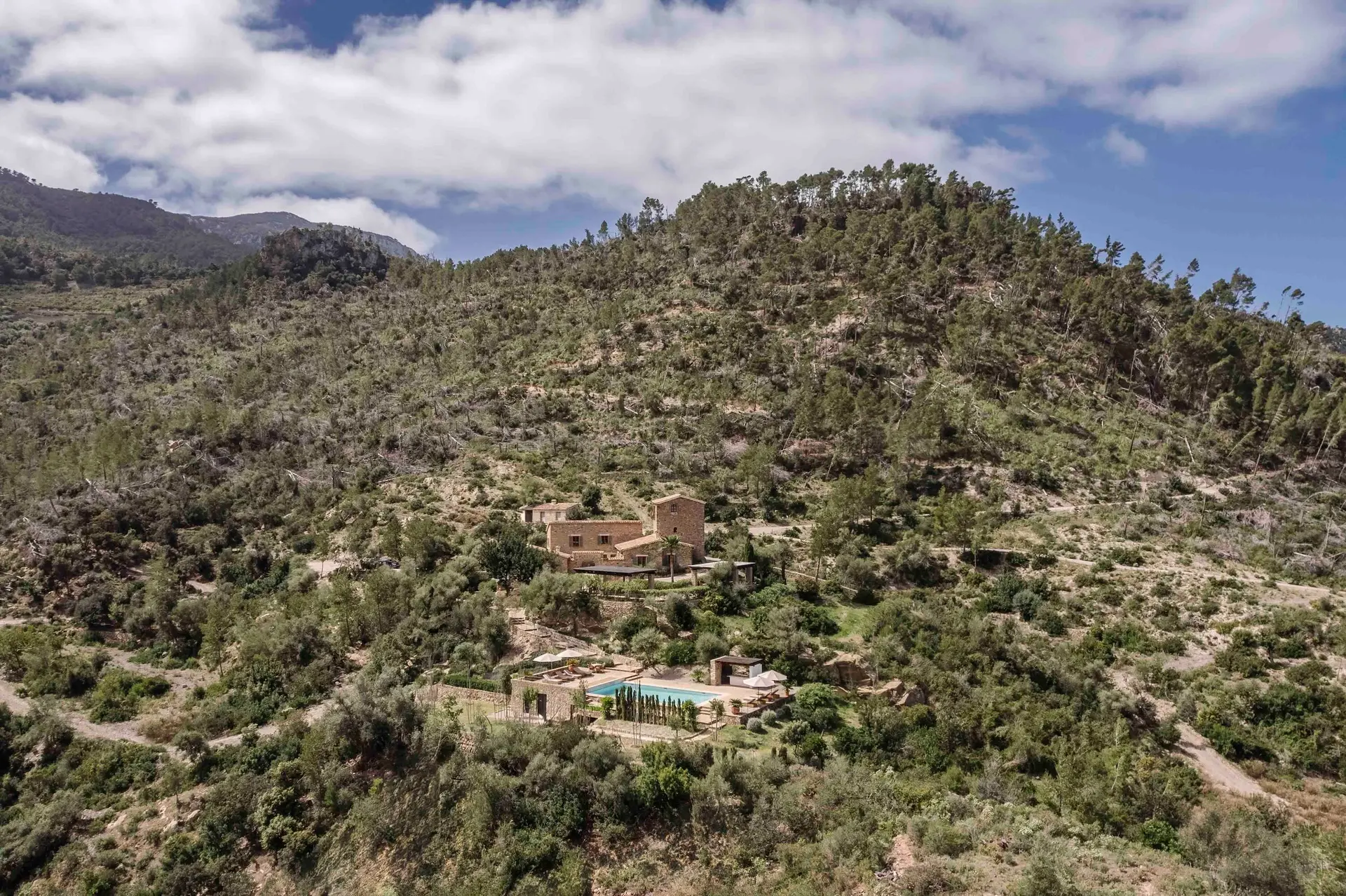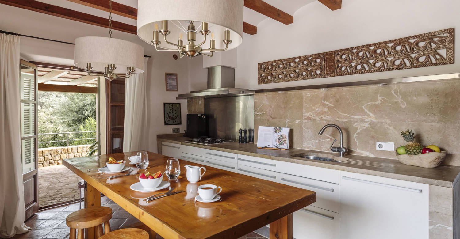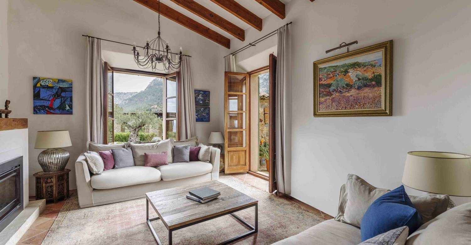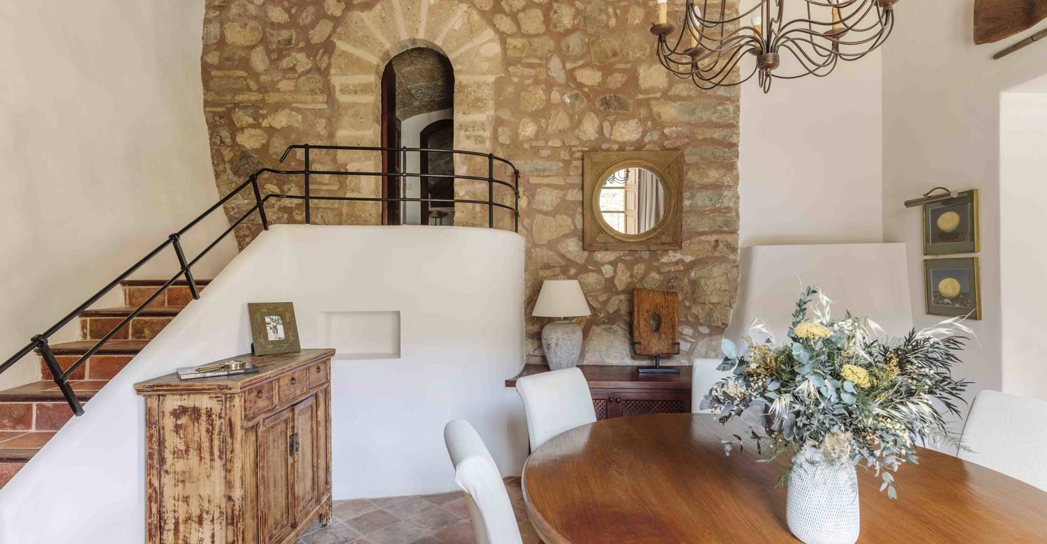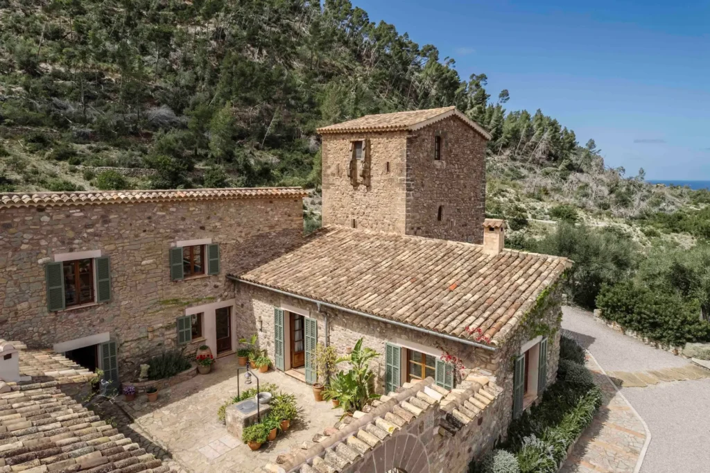Located within the prestigious Son Bunyola Estate on Mallorca’s dramatic northwest coast, Son Balagueret is a beautifully restored traditional villa that combines centuries-old heritage with contemporary comfort. Surrounded by vineyards, olive groves, citrus orchards, and almond trees, the property enjoys an elevated hillside setting with sweeping views across the Mediterranean landscape. One of the villa’s most distinctive features is its original 13th-century turret, once used as a lookout tower and now transformed into a unique bedroom suite. This historic element gives the property a remarkable sense of character while blending seamlessly with the refined interiors and modern amenities throughout the villa.