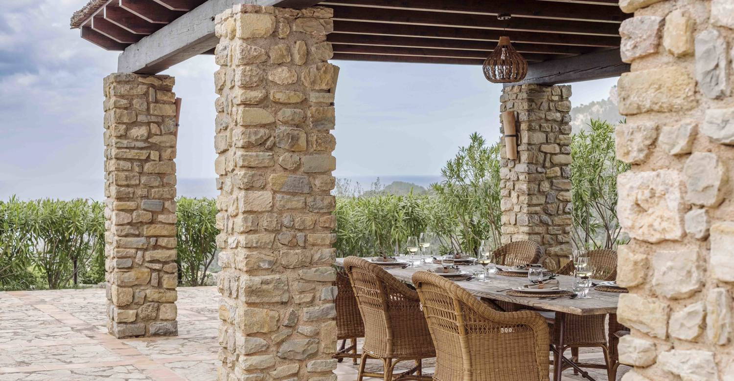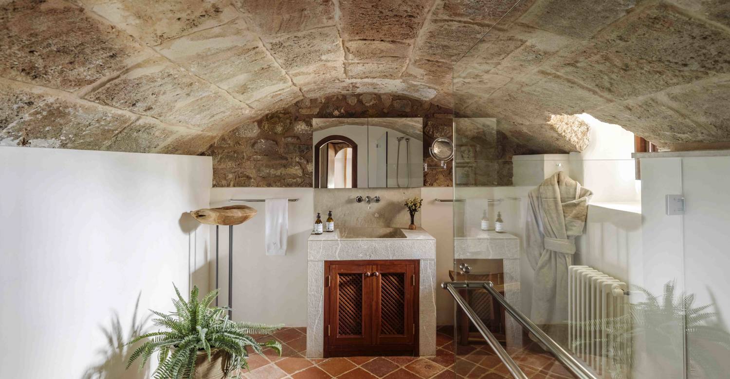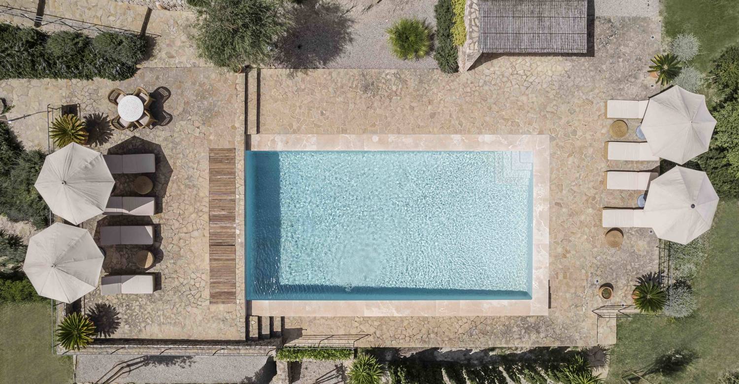 Outdoor living is central to the Son Balagueret experience. A tranquil courtyard provides a peaceful space for reading or relaxing, while expansive terraces invite long alfresco meals overlooking the estate’s vineyards and the coastline beyond. A short stroll from the villa leads to the private heated swimming pool, set within the estate’s natural landscape and offering a serene setting to unwind under the Mediterranean sun.