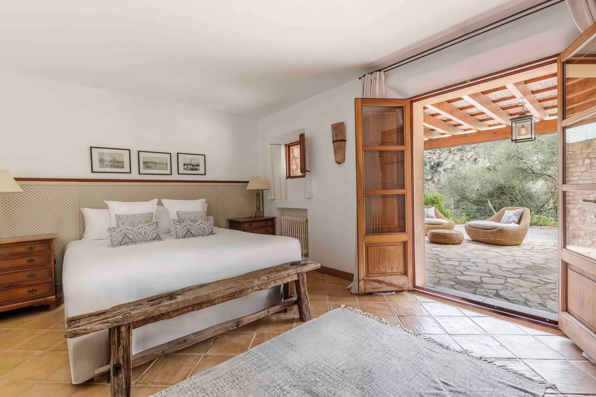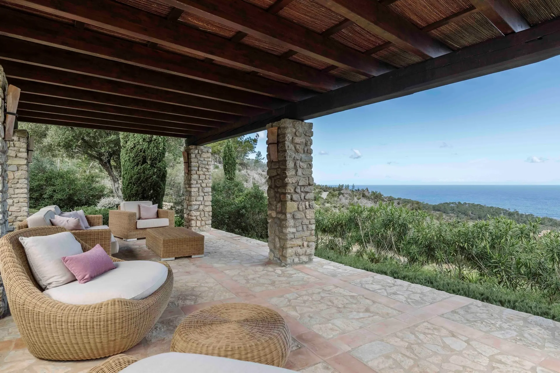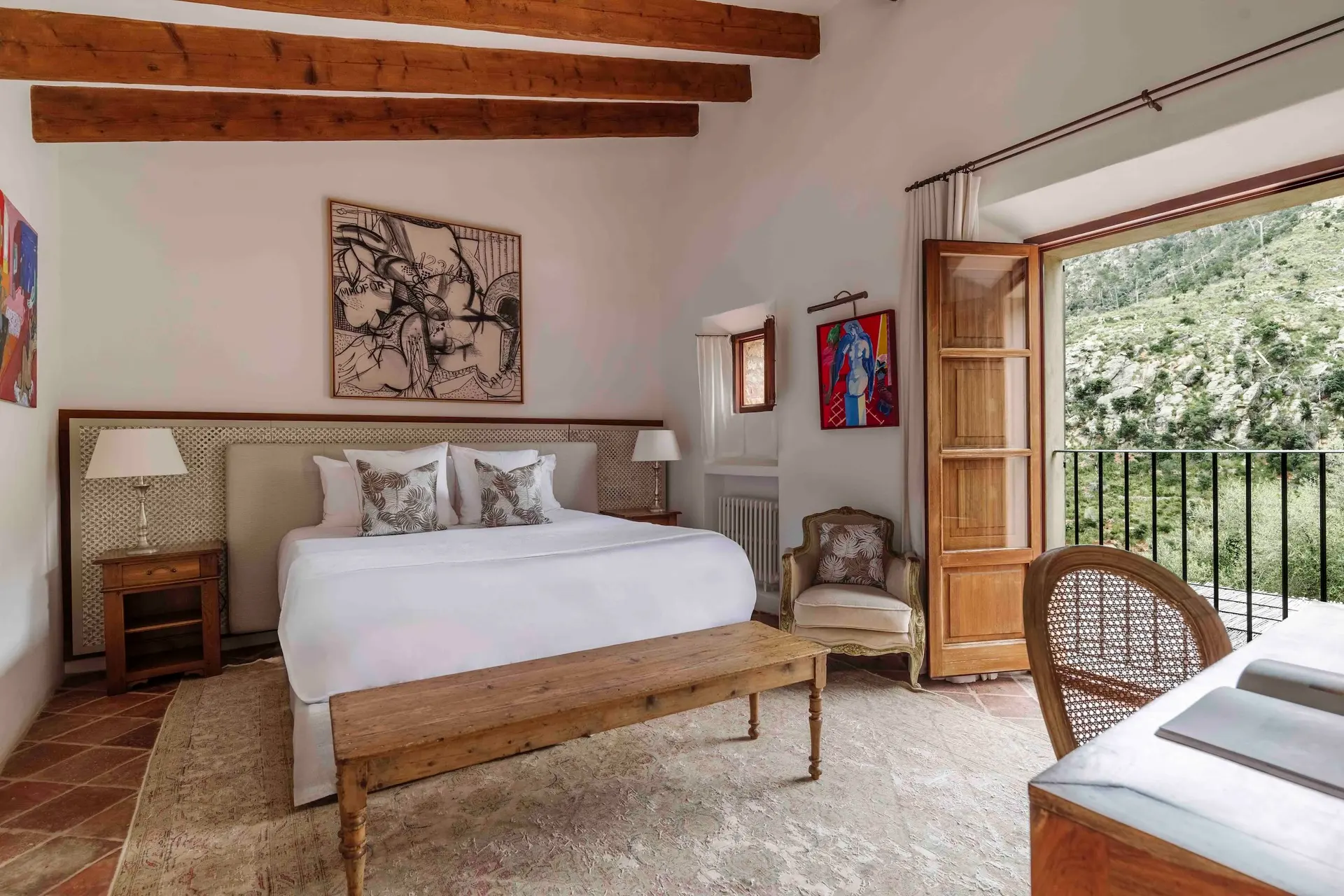 Outdoor living is central to the Son Balagueret experience. A tranquil courtyard provides a peaceful space for reading or relaxing, while expansive terraces invite long alfresco meals overlooking the estate’s vineyards and the coastline beyond. A short stroll from the villa leads to the private heated swimming pool, set within the estate’s natural landscape and offering a serene setting to unwind under the Mediterranean sun.