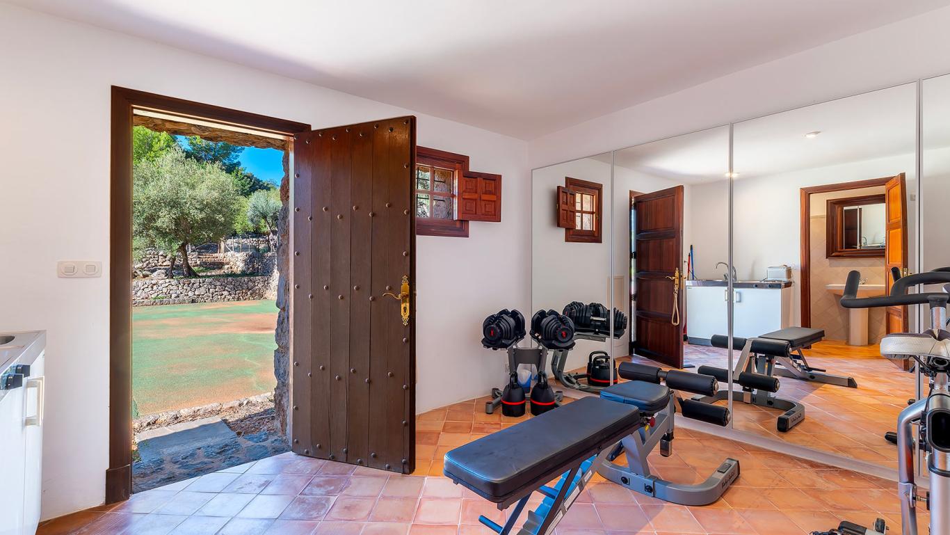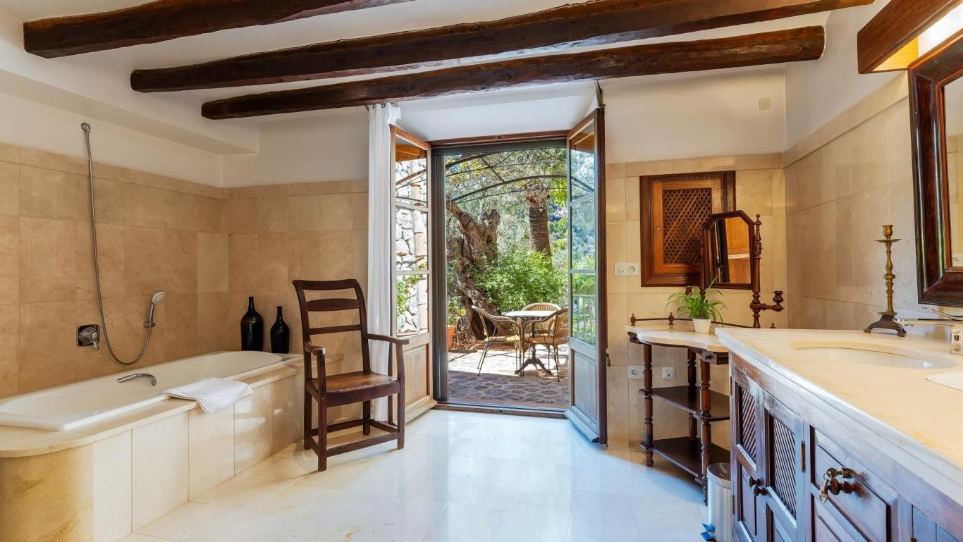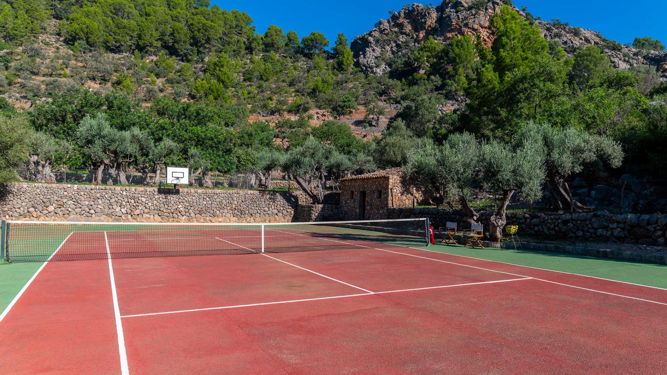 Outdoor living is central to the Son Salas experience. A 16 × 6.5 metre saltwater swimming pool sits among ancient olive trees, surrounded by sun terraces and shaded lounge areas that invite long afternoons in the Mediterranean sun. A nearby pool suite with barbecue, shower, and WC offers additional convenience for poolside gatherings. Multiple terraces, a tranquil inner courtyard, and a private tennis court set among olive groves create abundant space for relaxation, recreation, and entertaining, all framed by the dramatic scenery of the Sóller Valley and the nearby Serra de Tramuntana.