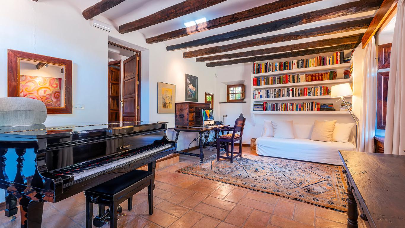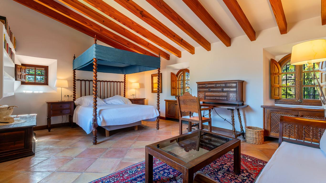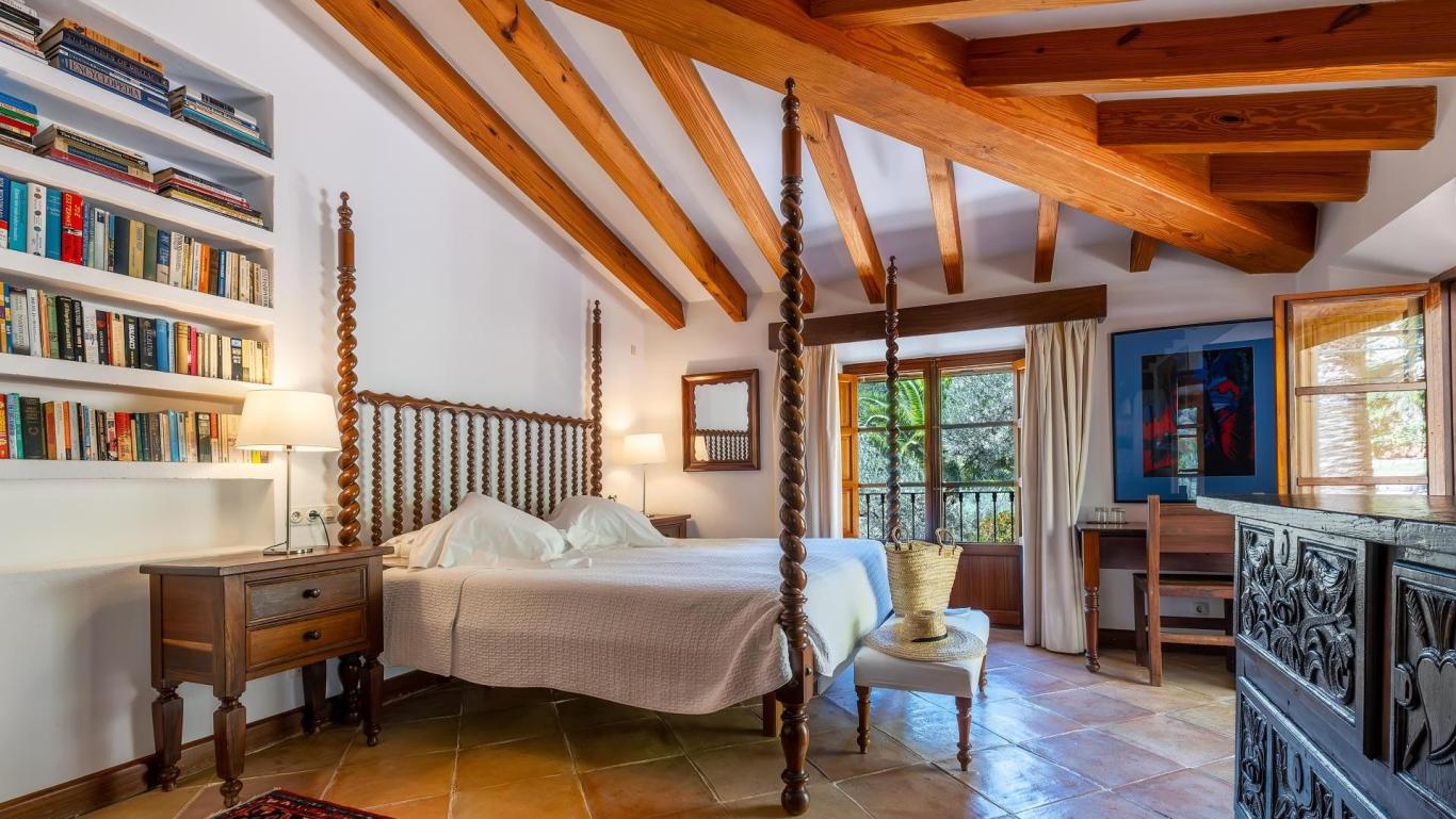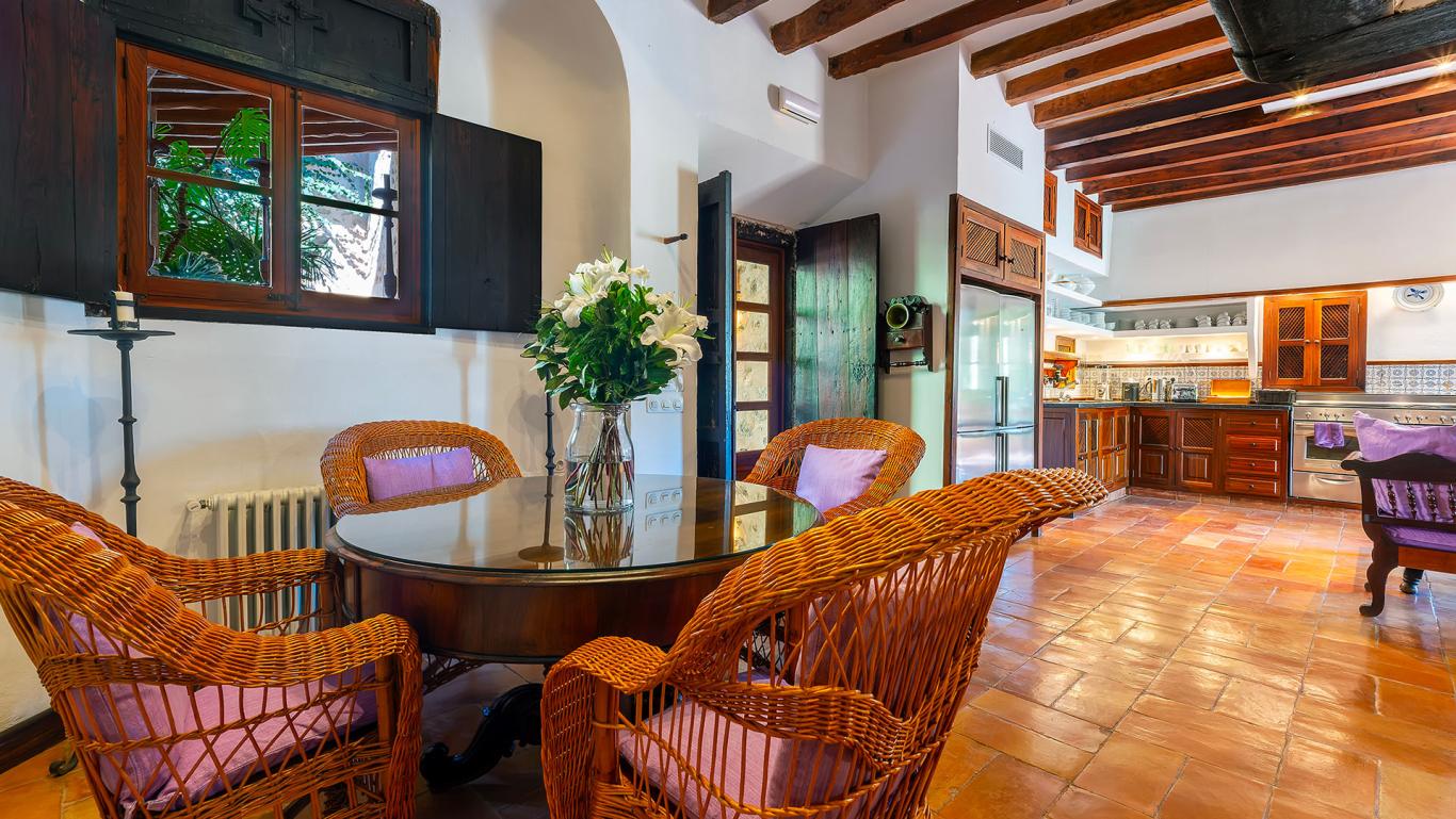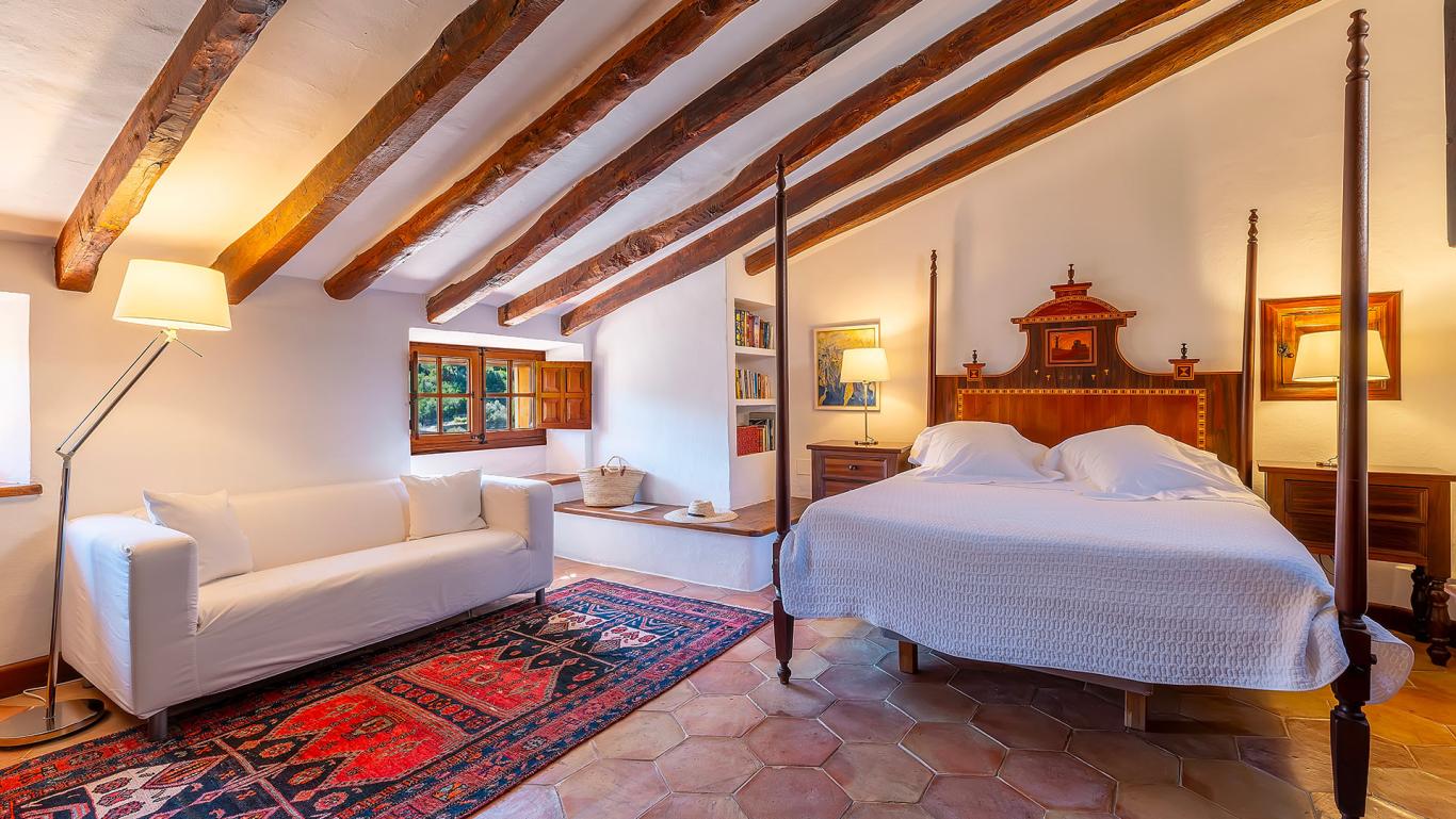 The estate accommodates up to eighteen guests and features seven elegant en-suite bedrooms in the main residence, complemented by a separate apartment and an additional pool suite available upon request. Interiors are spacious and filled with natural light, where exposed beams, stone walls, and traditional architectural details are paired with modern comforts including cozy fireplaces and a private home cinema with an extensive film library. At the heart of the home, the traditional kitchen retains its rustic charm with a central fireplace and opens directly onto a picturesque terrace designed for relaxed alfresco dining.