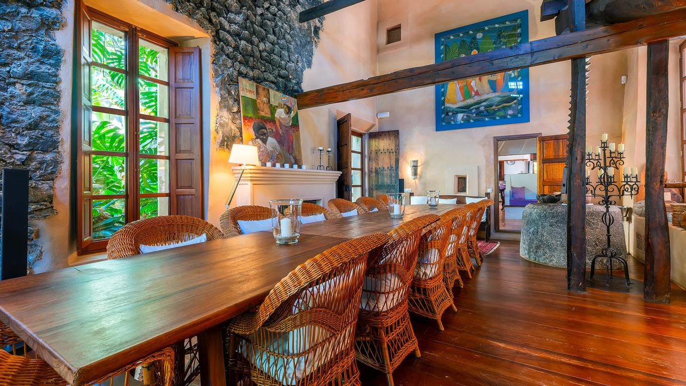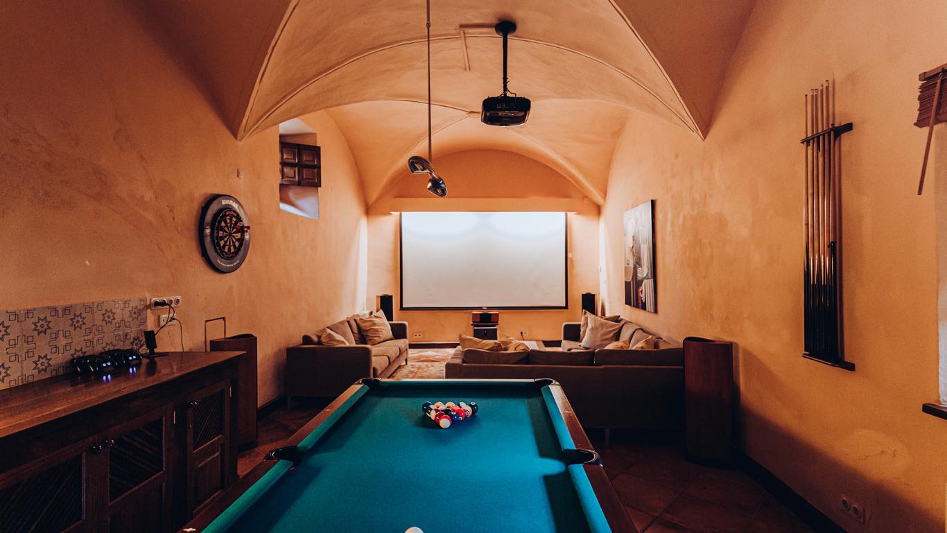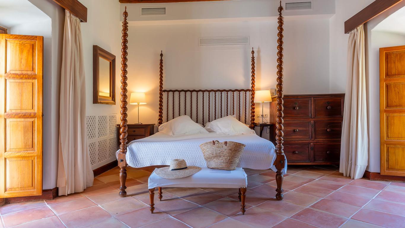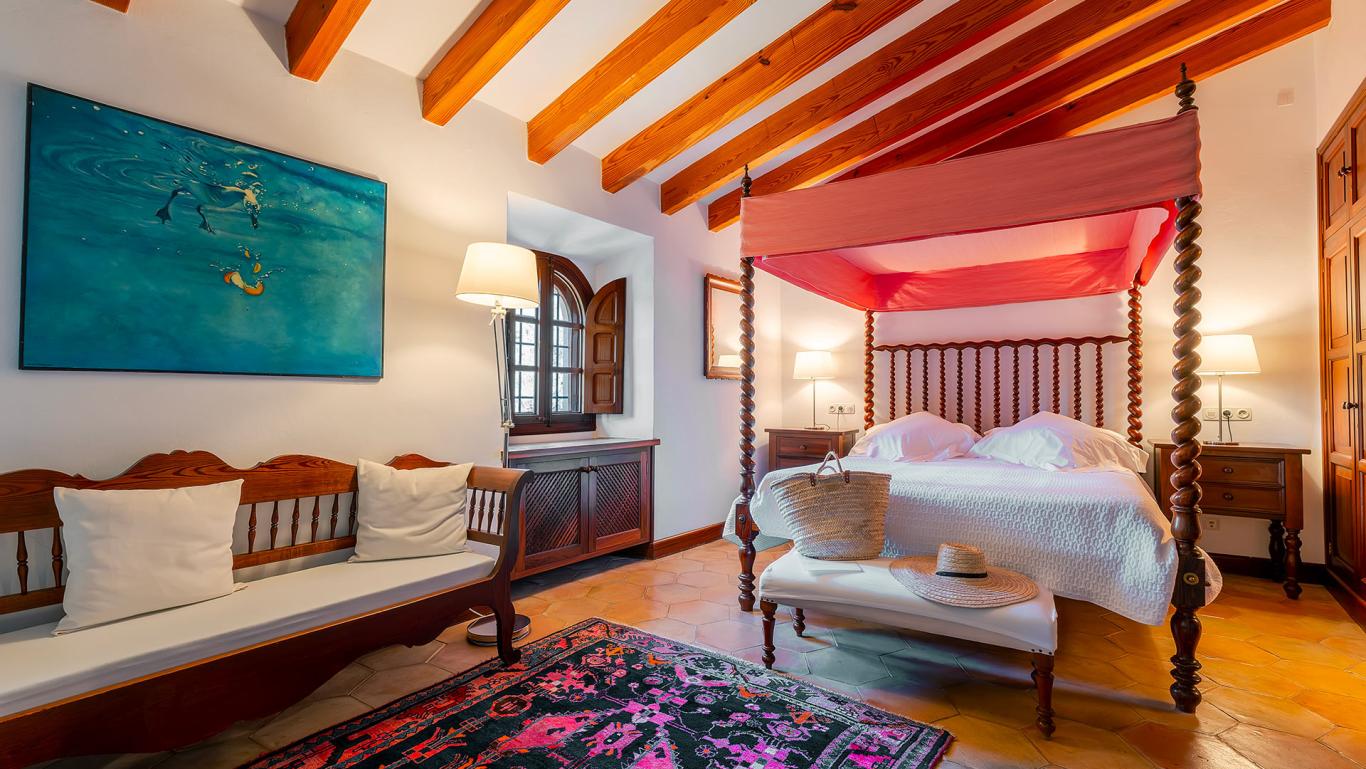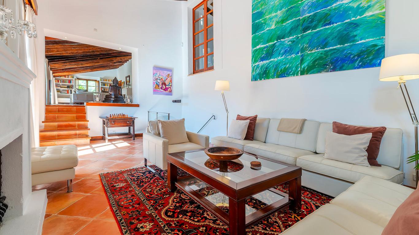 The estate accommodates up to eighteen guests and features seven elegant en-suite bedrooms in the main residence, complemented by a separate apartment and an additional pool suite available upon request. Interiors are spacious and filled with natural light, where exposed beams, stone walls, and traditional architectural details are paired with modern comforts including cozy fireplaces and a private home cinema with an extensive film library. At the heart of the home, the traditional kitchen retains its rustic charm with a central fireplace and opens directly onto a picturesque terrace designed for relaxed alfresco dining.