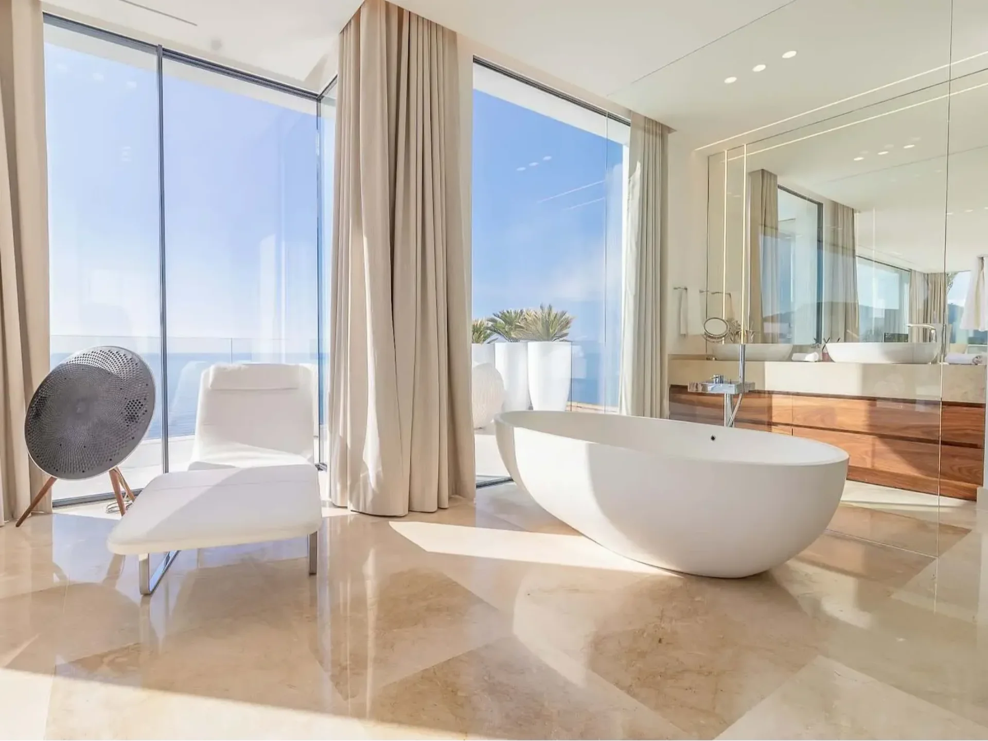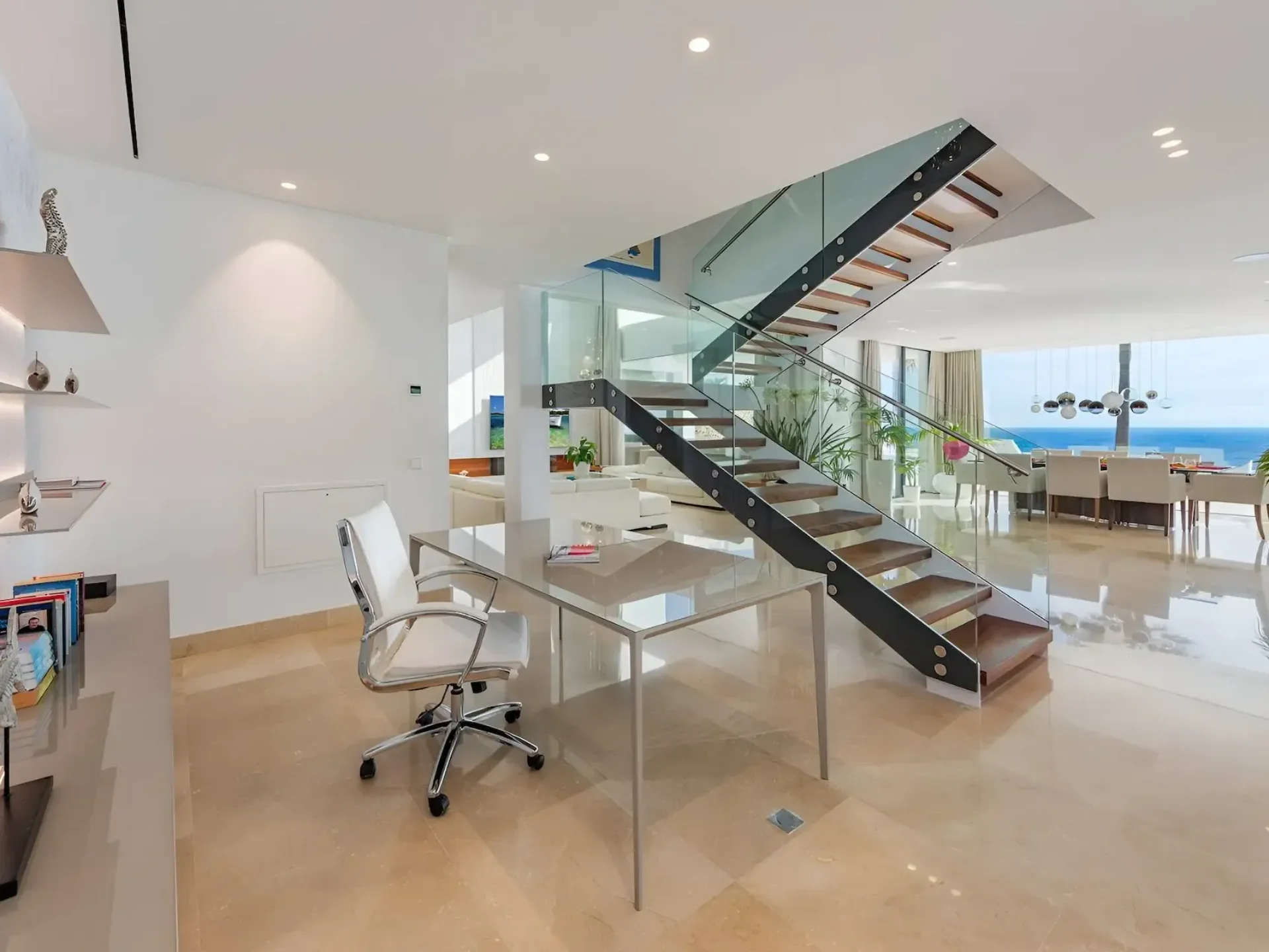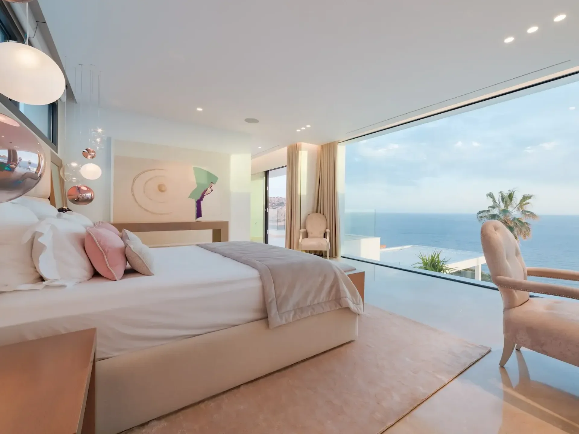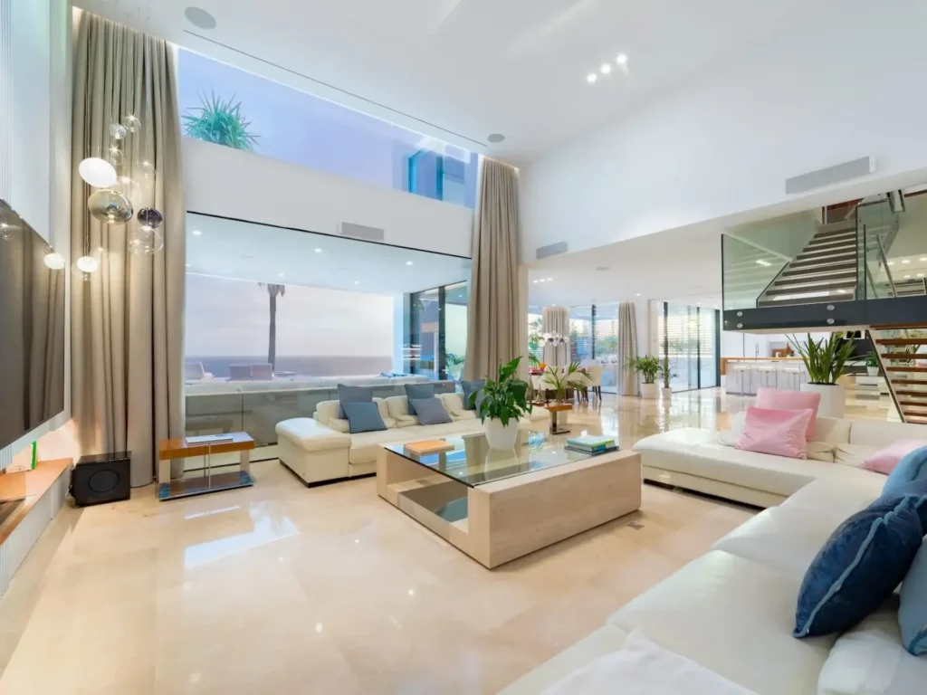 Floor-to-ceiling glass windows and expansive terraces frame the horizon from nearly every angle, creating seamless indoor–outdoor living. The villa features five stylish double bedrooms, each with sea views and its own bathroom, plus additional guest facilities.