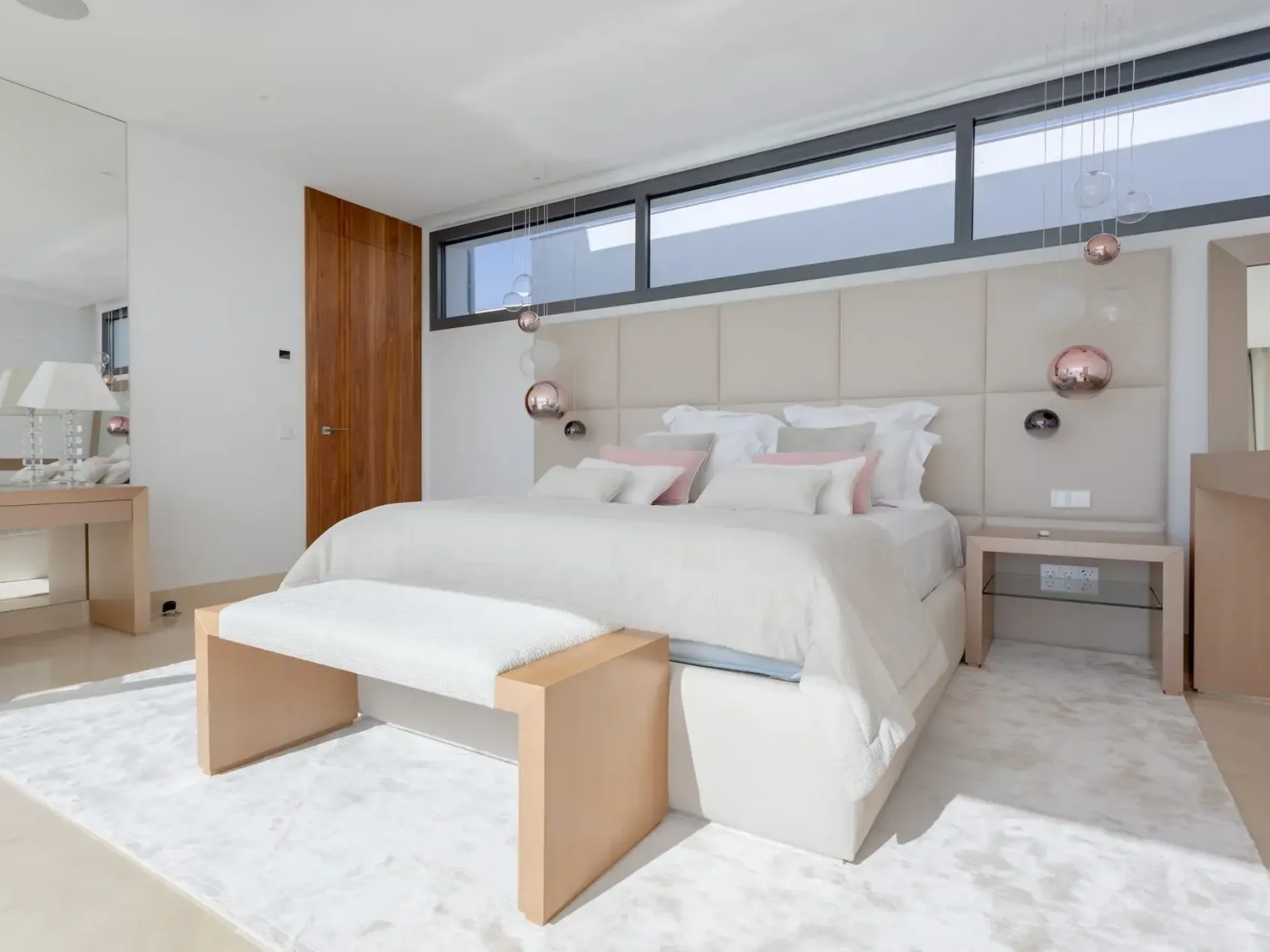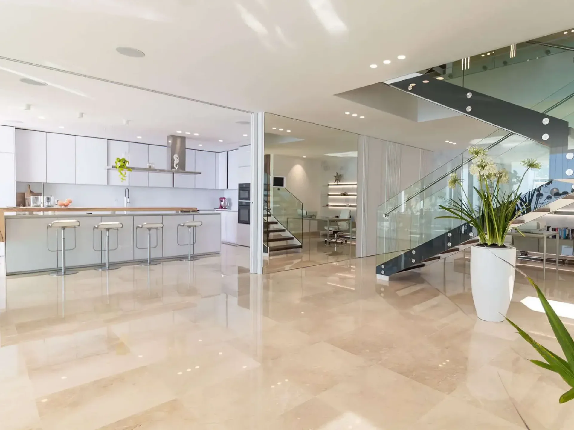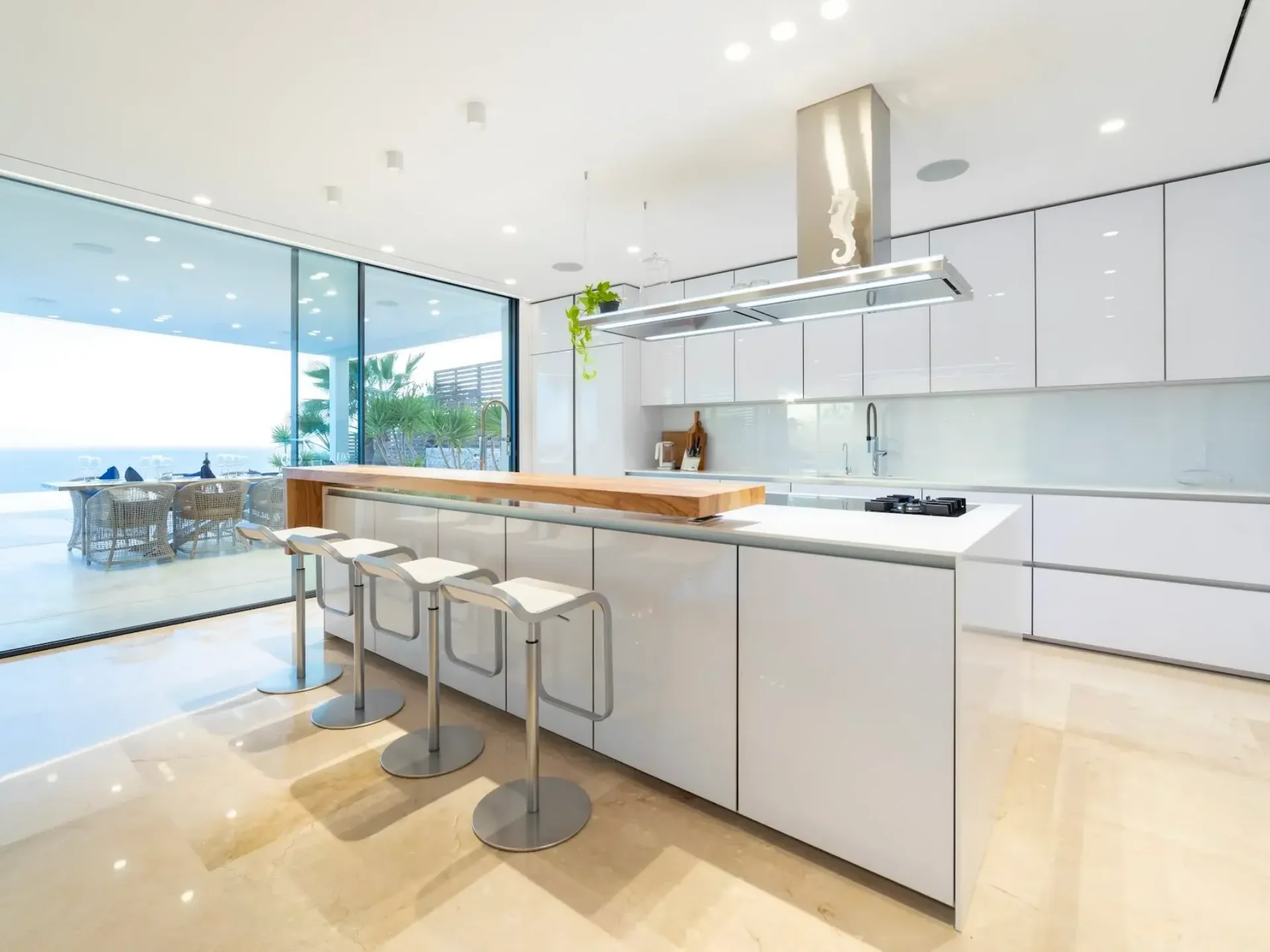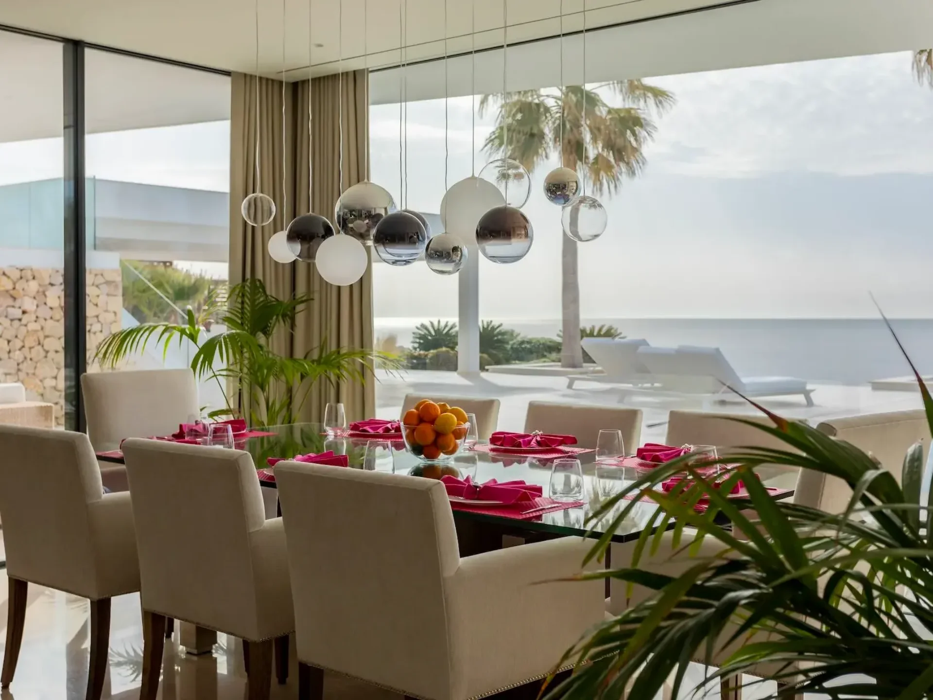 Floor-to-ceiling glass windows and expansive terraces frame the horizon from nearly every angle, creating seamless indoor–outdoor living. The villa features five stylish double bedrooms, each with sea views and its own bathroom, plus additional guest facilities.