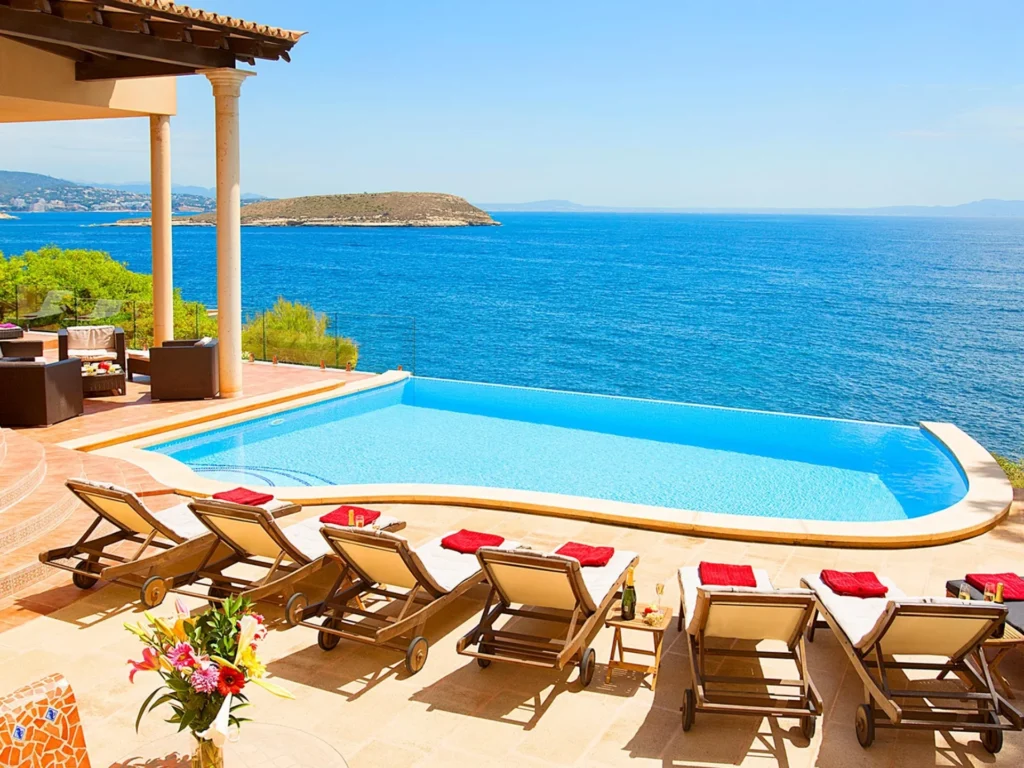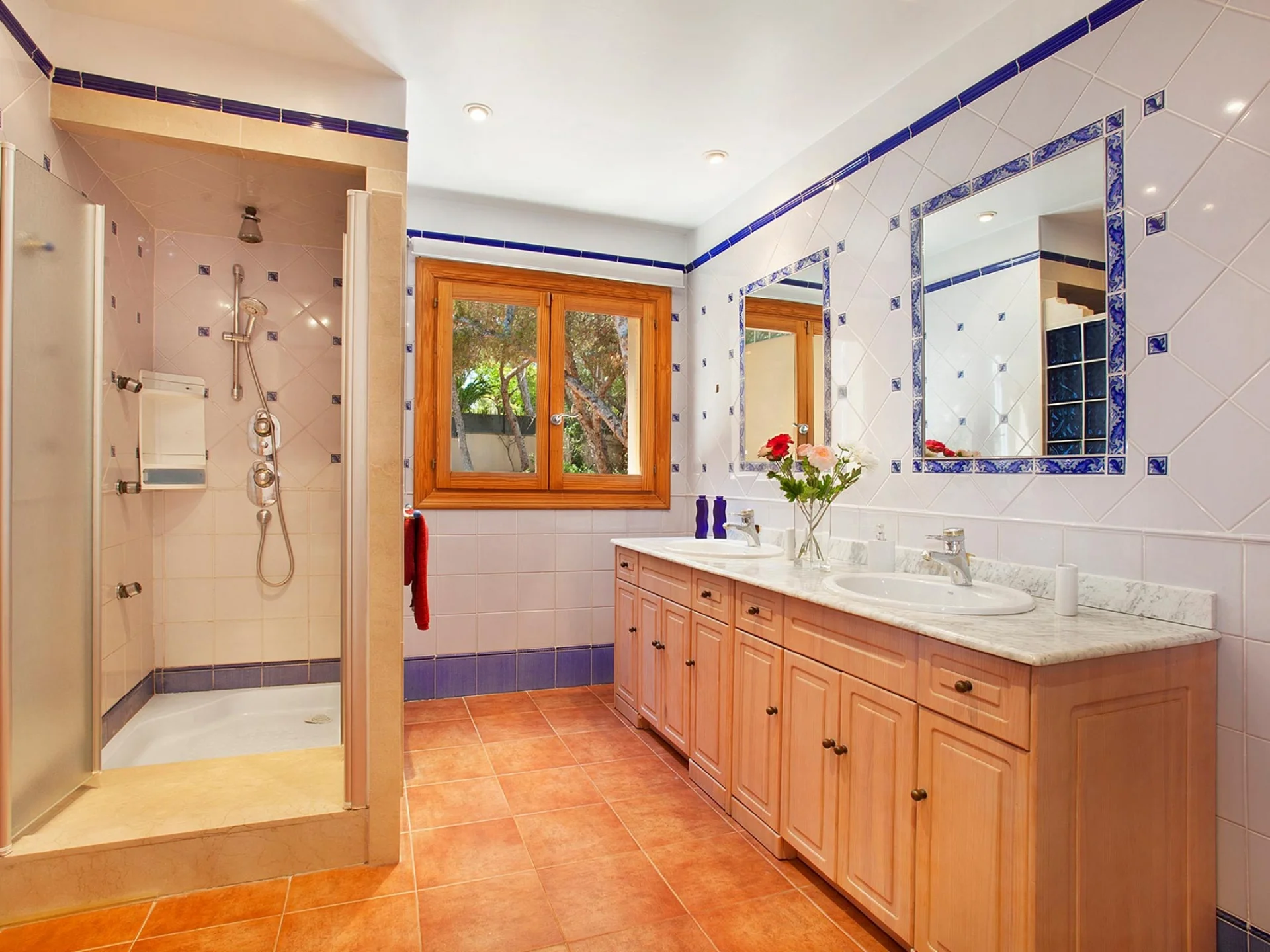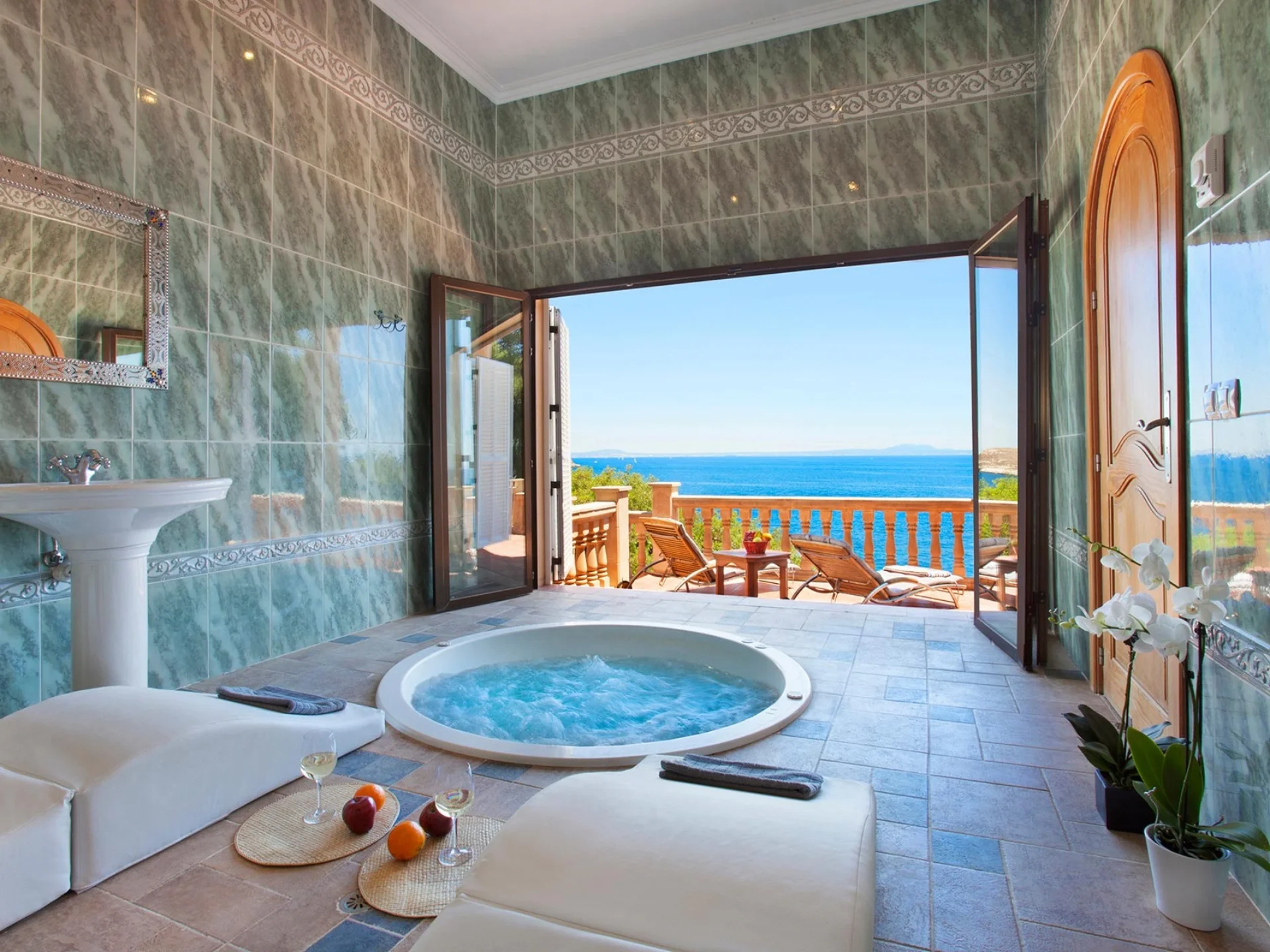 Outdoor living is at the heart of the property. A private heated swimming pool overlooks the sea, surrounded by sun terraces and shaded lounge areas designed for relaxation and entertaining. A Jacuzzi and dedicated wellness-style spaces provide tranquil corners to unwind, whether enjoying sunrise reflections or Mallorca’s famous southwest sunsets.