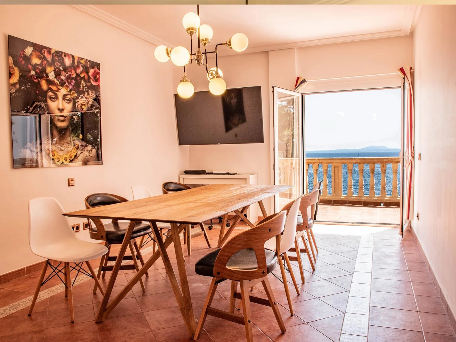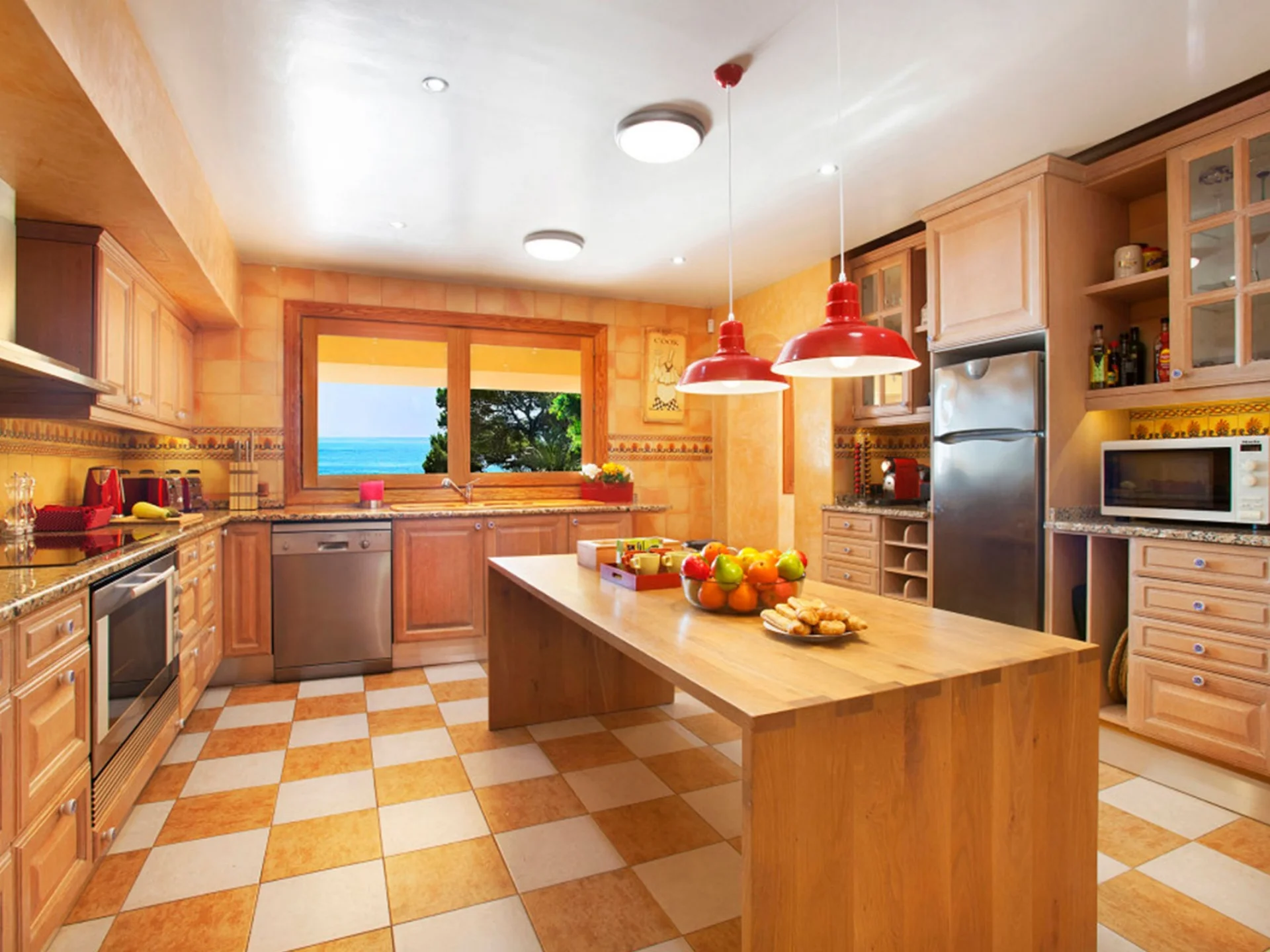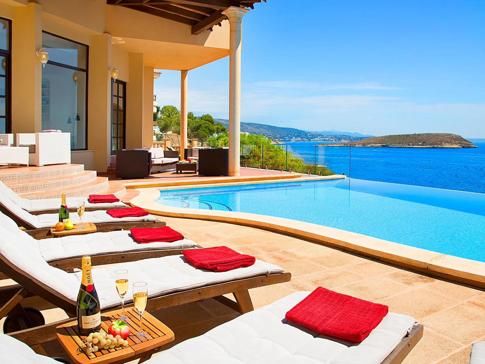 Outdoor living is at the heart of the property. A private heated swimming pool overlooks the sea, surrounded by sun terraces and shaded lounge areas designed for relaxation and entertaining. A Jacuzzi and dedicated wellness-style spaces provide tranquil corners to unwind, whether enjoying sunrise reflections or Mallorca’s famous southwest sunsets.