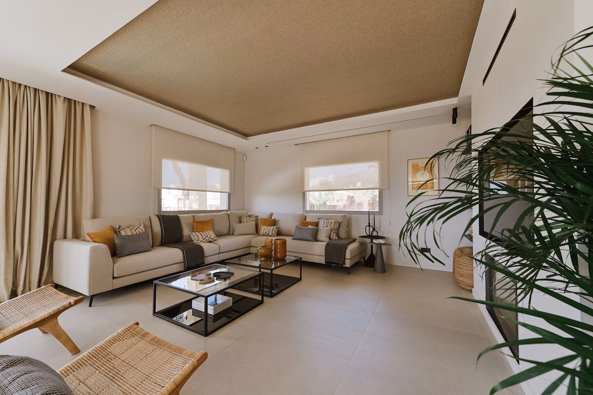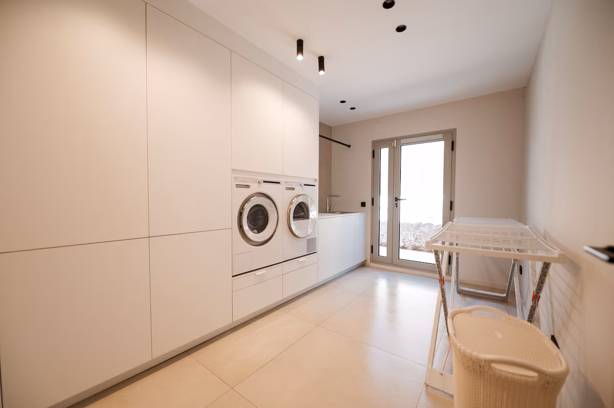 Inside, the villa showcases bright, open-plan living areas designed to maximize natural light and connection to the outdoors. A spacious lounge and dining area form the heart of the home, complemented by contemporary furnishings, high-end finishes, and floor-to-ceiling glass doors that open onto the terraces. The fully equipped modern kitchen features sleek appliances and a central island, ideal for both casual breakfasts and entertaining. The villa offers six beautifully styled bedrooms, each with its own en-suite bathroom, ensuring privacy and comfort for every guest. Thoughtfully curated interiors combine modern Mediterranean design with soft textures and neutral tones, creating a calm and inviting atmosphere throughout.