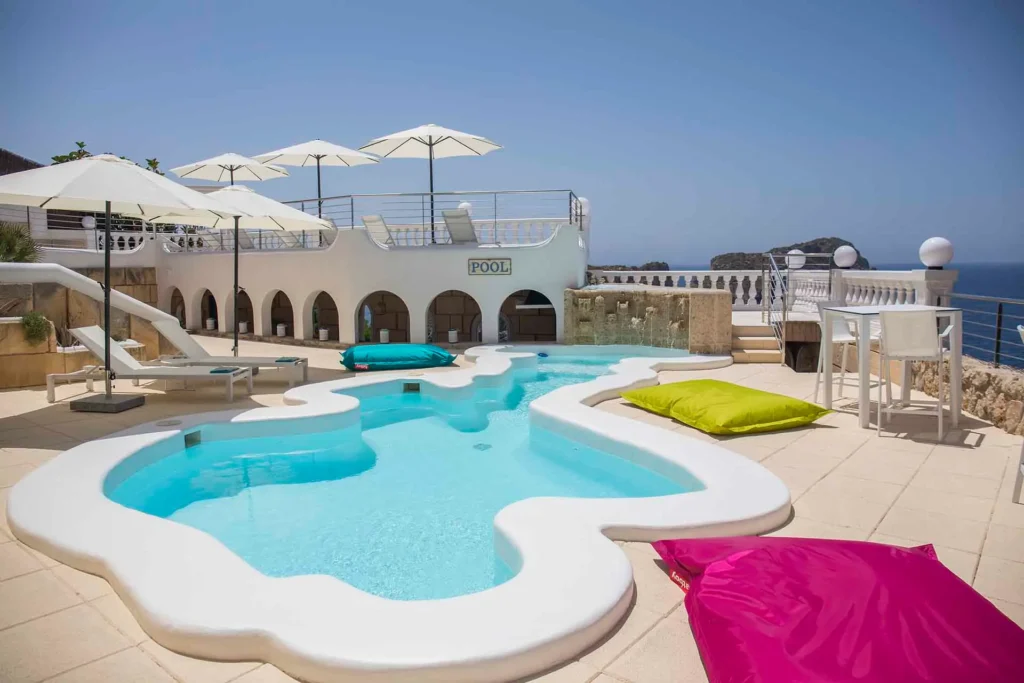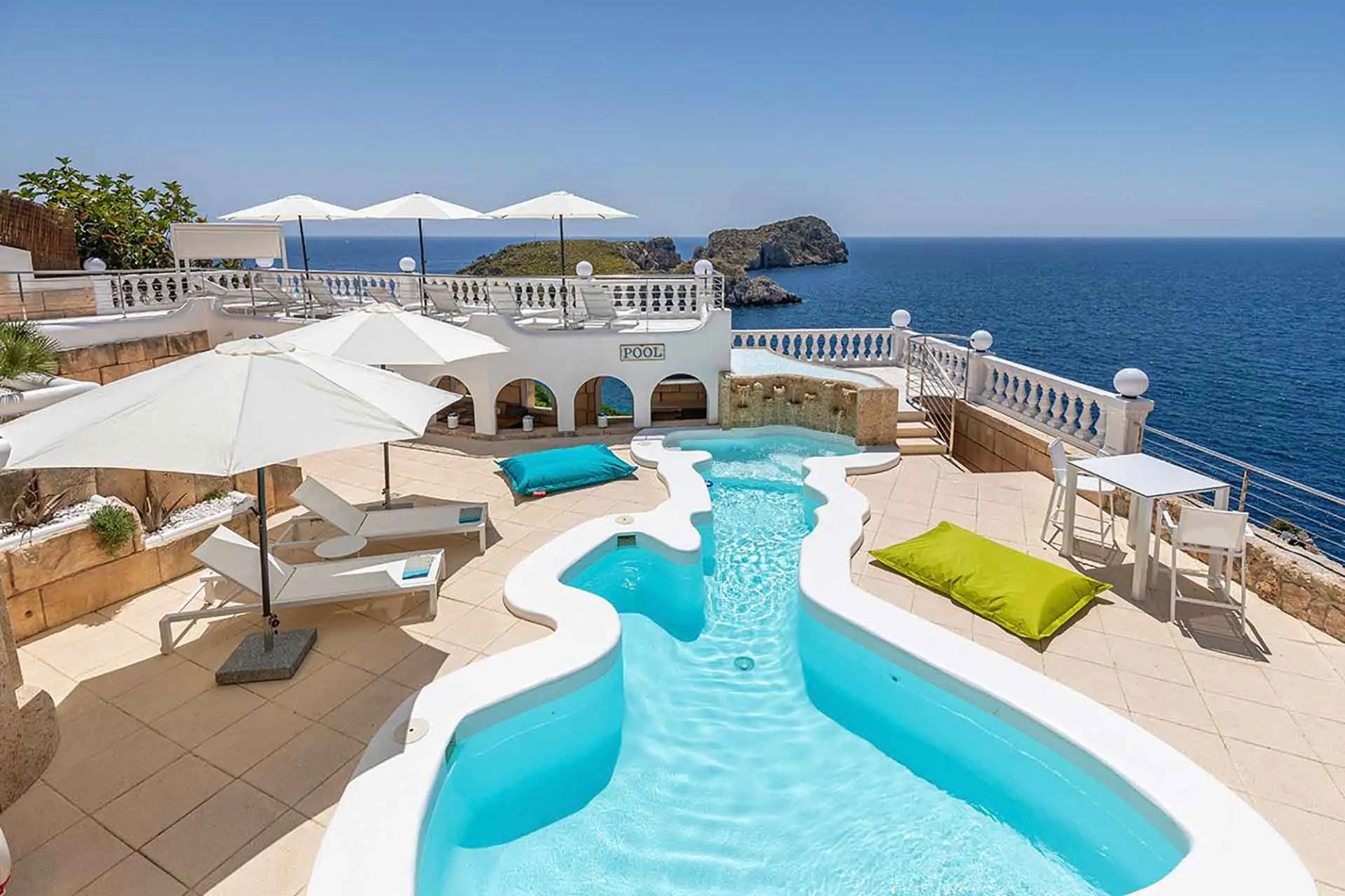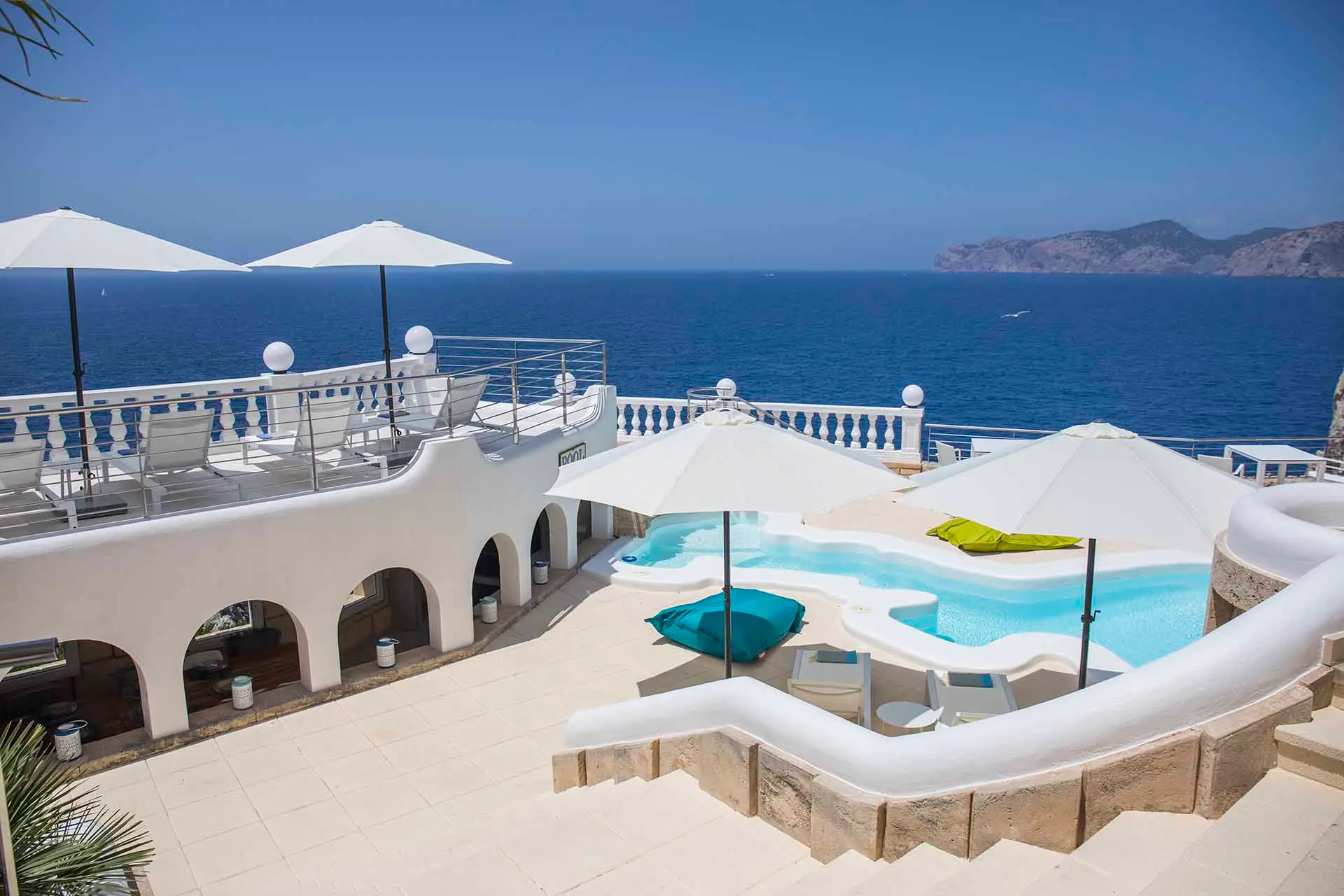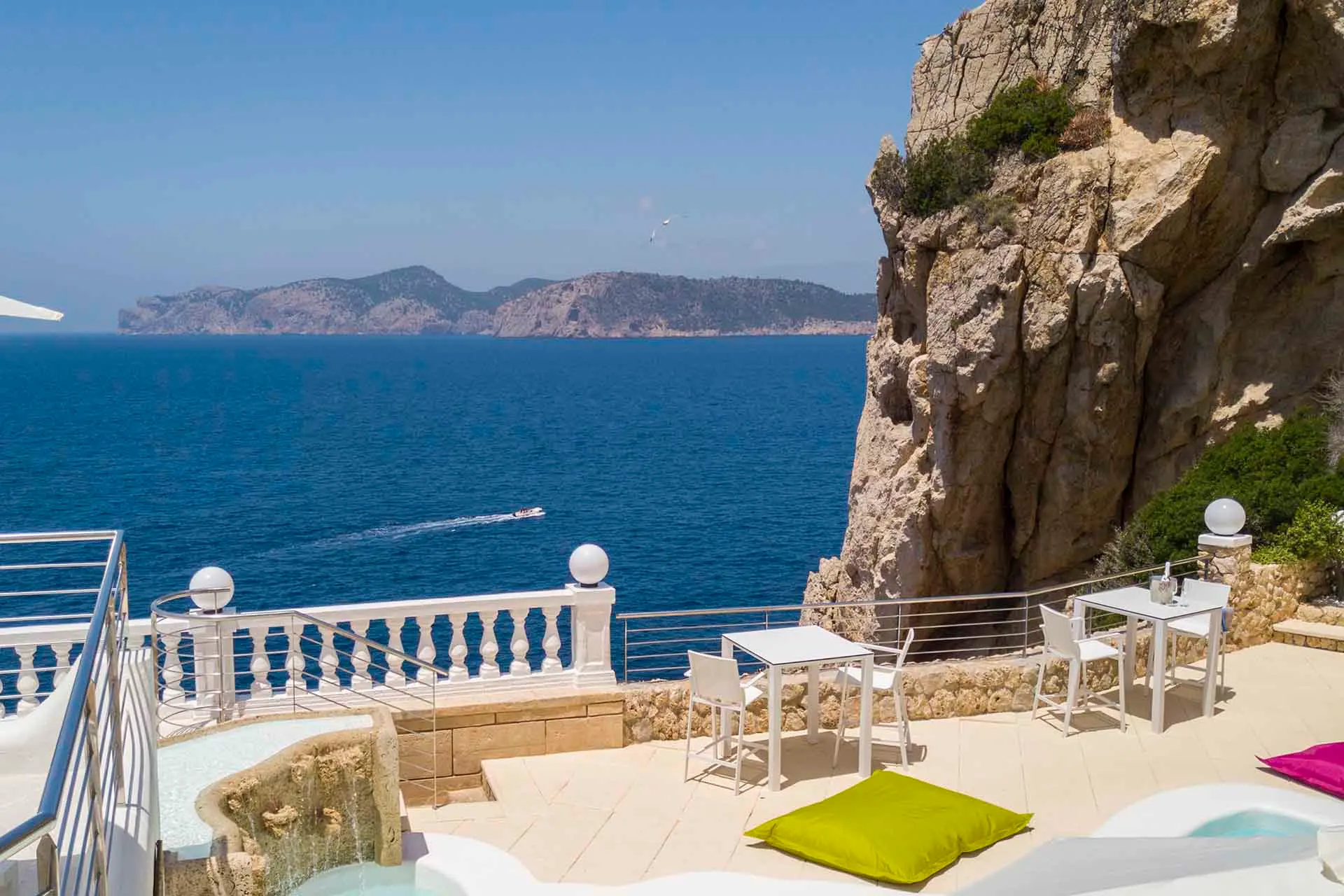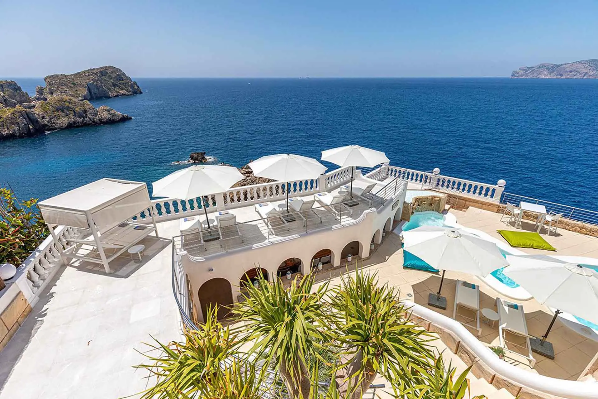 Discover its various hidden viewpoints around the cliff where you can relax with music, or find a shaded spot on the arched porch. For your events, guests can have different loungers, comfy chairs or floor cushions to chill out on. In addition, a bar counter lights up at night. And if that wasn’t enough, come nightfall the entire villa can be illuminated in different colours. Its staggered interior is minimalist and is finished to the highest technical and architectural standards. You will find different spaces, all well lit and with sea views. There is a spacious living room, too, with a fireplace attached to a game room and bar.