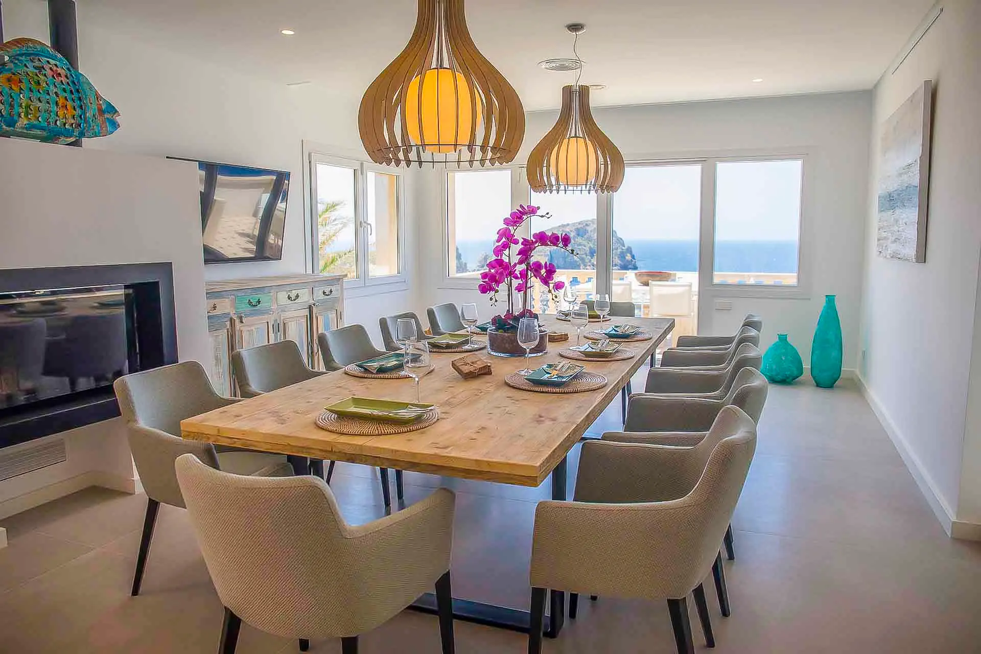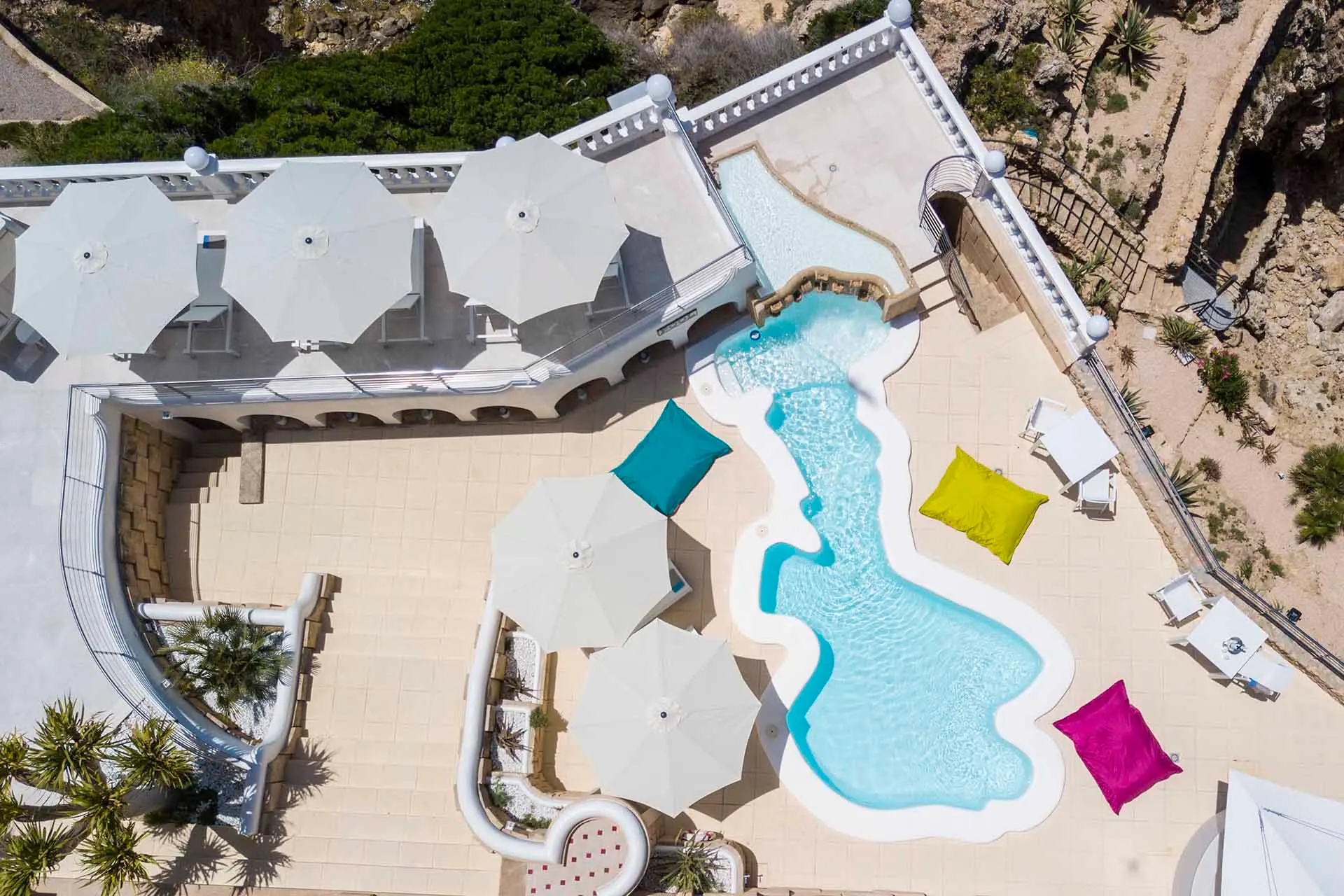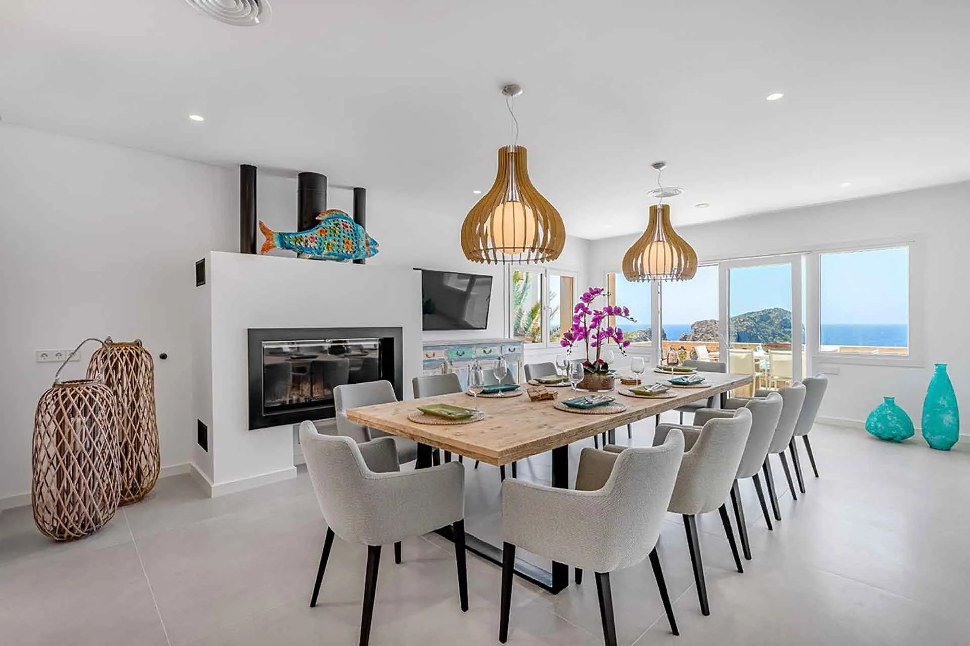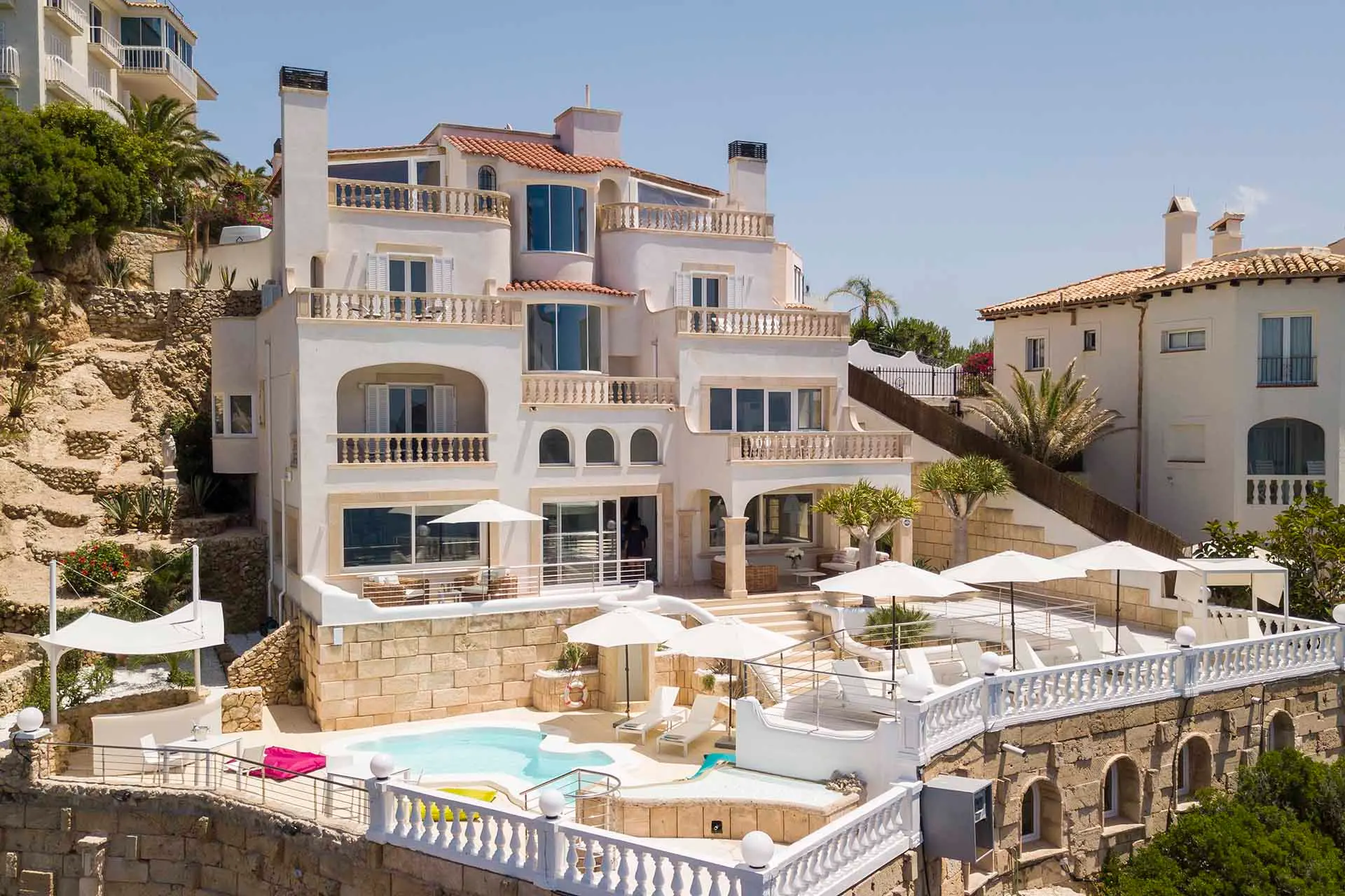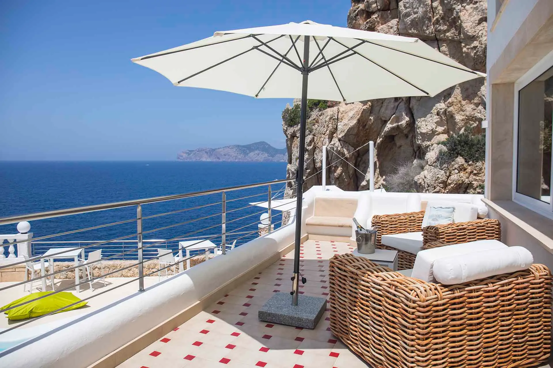 Discover its various hidden viewpoints around the cliff where you can relax with music, or find a shaded spot on the arched porch. For your events, guests can have different loungers, comfy chairs or floor cushions to chill out on. In addition, a bar counter lights up at night. And if that wasn’t enough, come nightfall the entire villa can be illuminated in different colours. Its staggered interior is minimalist and is finished to the highest technical and architectural standards. You will find different spaces, all well lit and with sea views. There is a spacious living room, too, with a fireplace attached to a game room and bar.