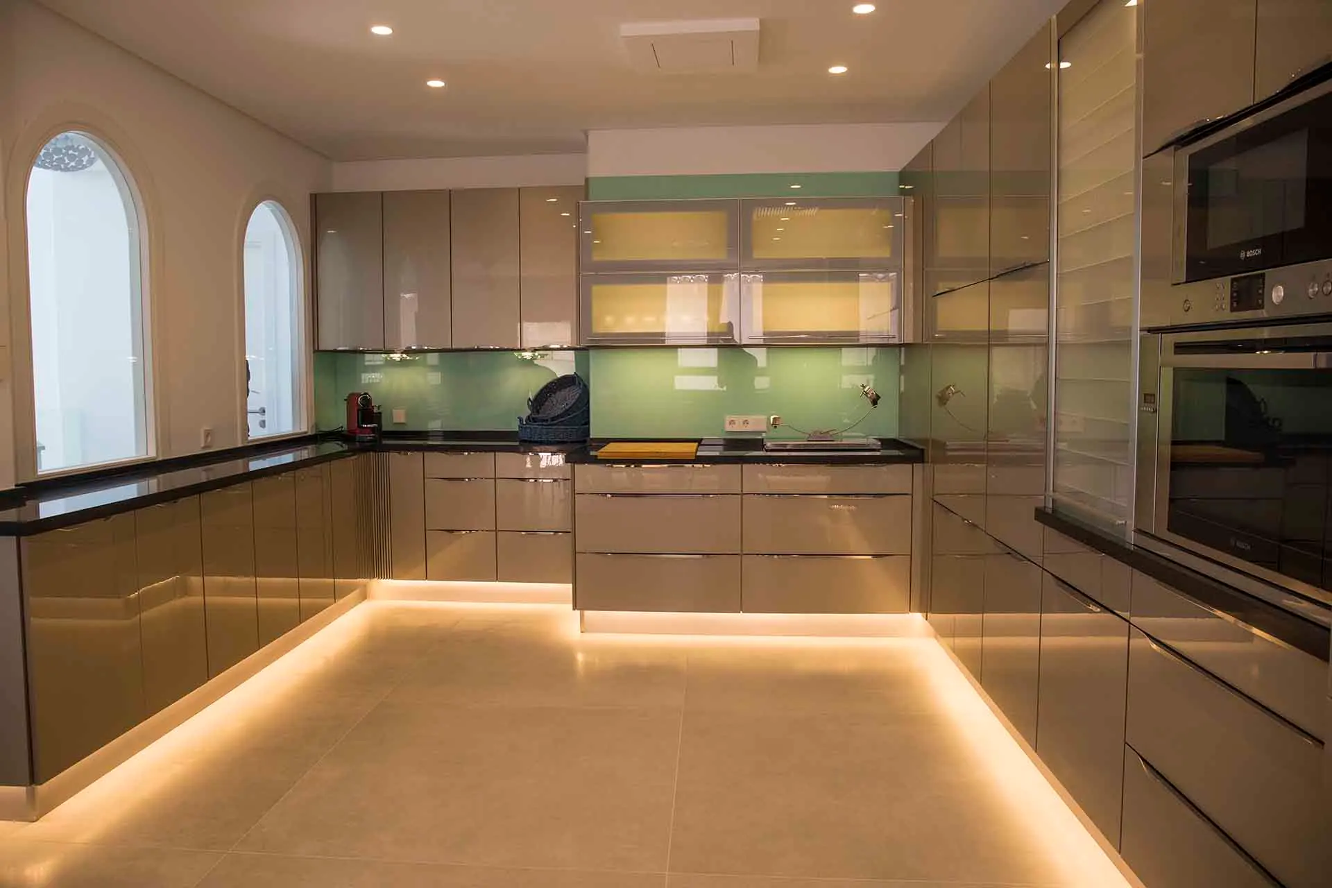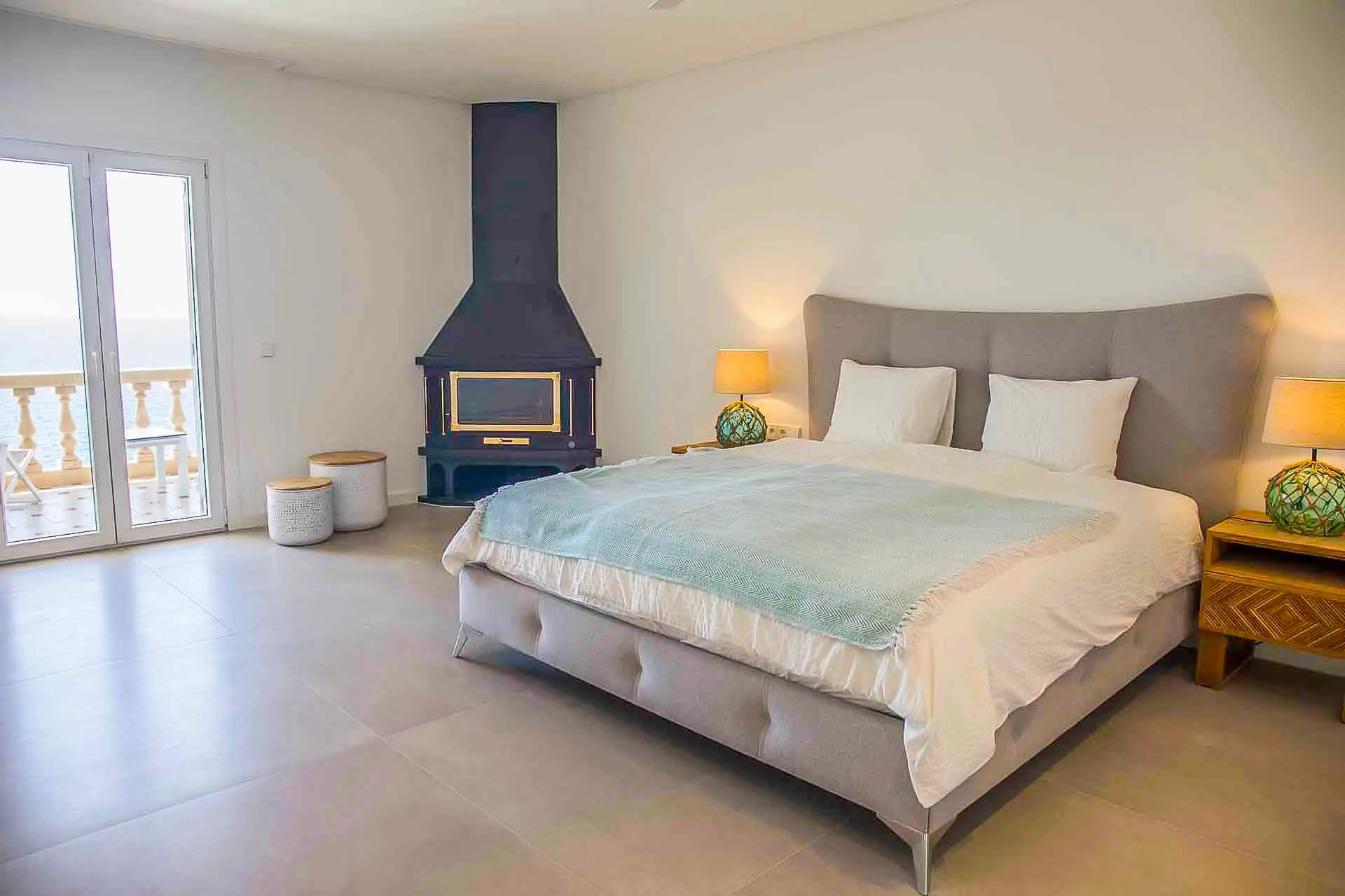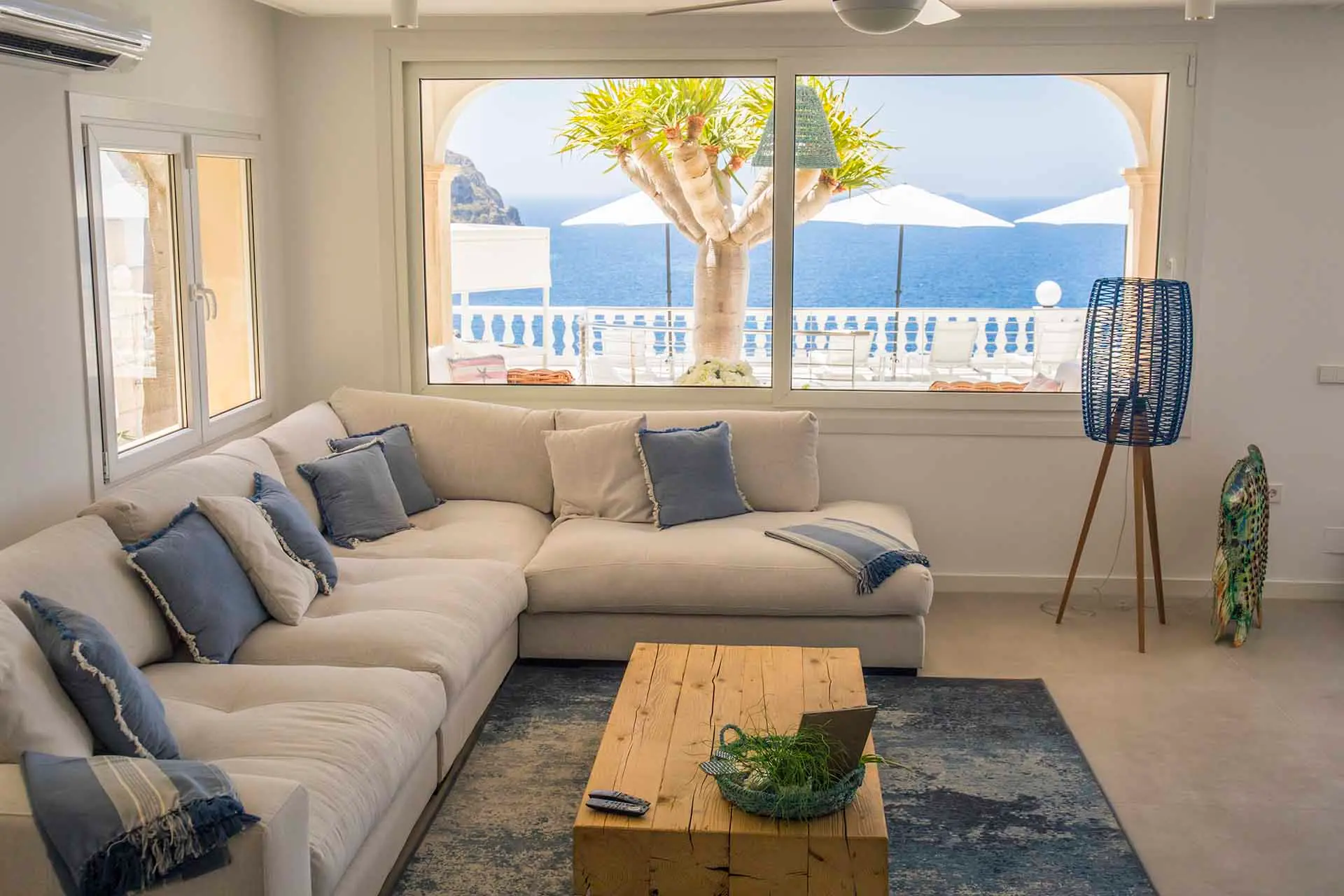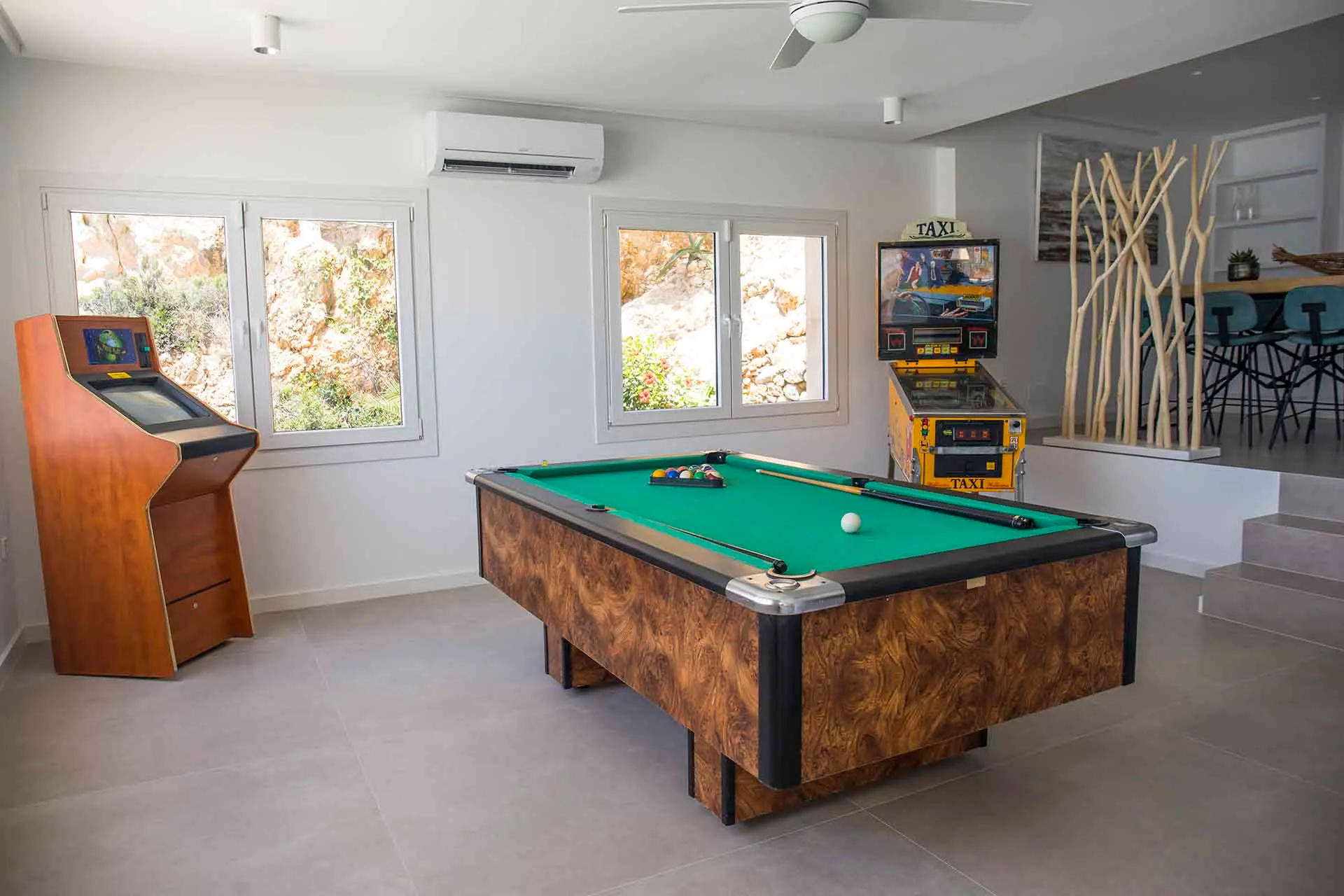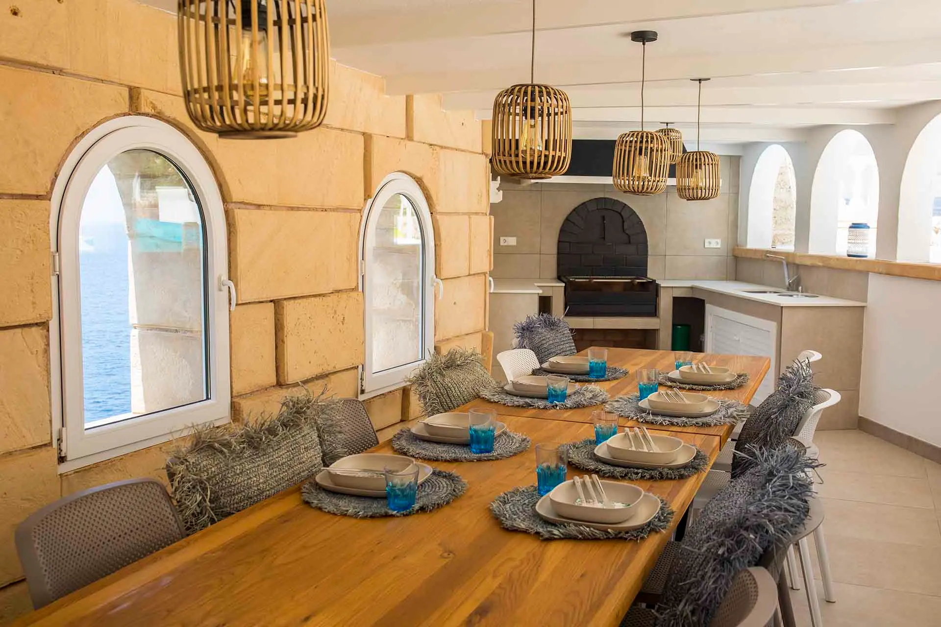 Discover its various hidden viewpoints around the cliff where you can relax with music, or find a shaded spot on the arched porch. For your events, guests can have different loungers, comfy chairs or floor cushions to chill out on. In addition, a bar counter lights up at night. And if that wasn’t enough, come nightfall the entire villa can be illuminated in different colours. Its staggered interior is minimalist and is finished to the highest technical and architectural standards. You will find different spaces, all well lit and with sea views. There is a spacious living room, too, with a fireplace attached to a game room and bar.