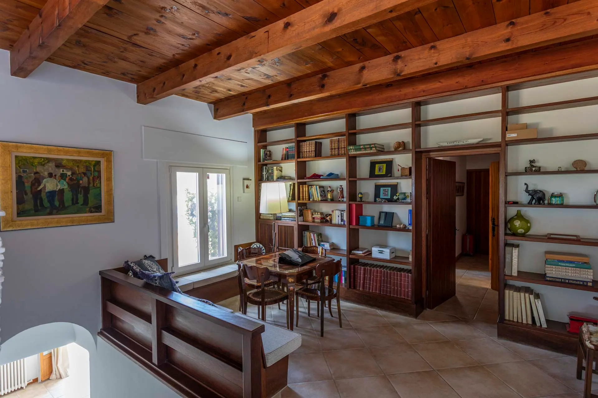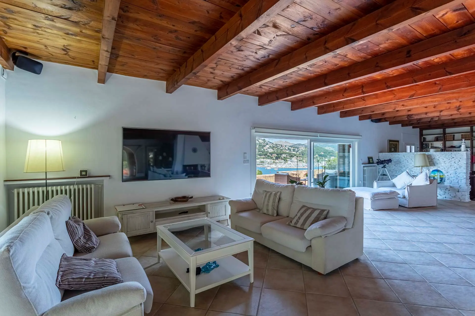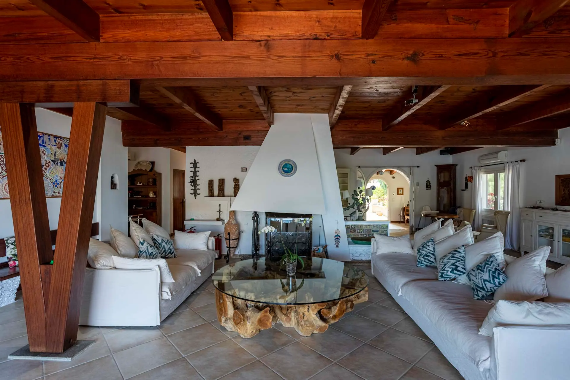 Inside, the villa combines elegance with comfort. The main living room is spacious yet welcoming, featuring plush sofas and a fireplace that creates a warm atmosphere on cooler evenings. The modern kitchen has been tastefully renovated and comes fully equipped with high-end appliances, a central island and ample storage. The property comfortably accommodates up to 12 guests across six bright and contemporary bedrooms, all equipped with individual air conditioning. Several bedrooms offer sea views, including the luxurious master suite, which features an en-suite bathroom and a large flat-screen TV.