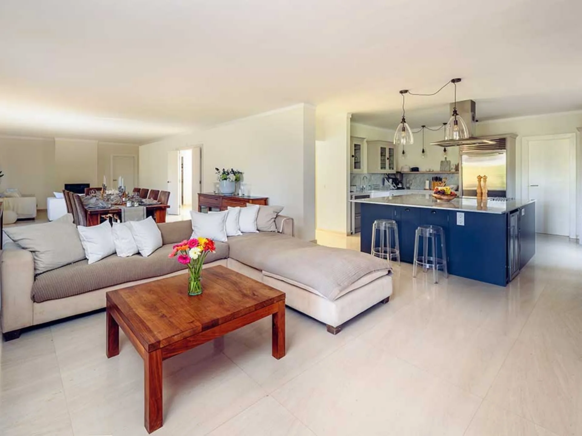 A dramatic double-height entrance hall introduces the sense of scale and light that defines the home. The generous lounge extends seamlessly into a sleek, fully equipped kitchen, creating an effortless setting for entertaining. Throughout the villa, air conditioning, underfloor heating, and fireplaces ensure year-round comfort, while neutral tones enhance the serene atmosphere. The villa offers four en-suite bedrooms, including a spacious master suite with a private terrace overlooking the pool and tennis court. A separate TV lounge and a dedicated office allow for both relaxation and remote working. Daily maid service is included, with a private chef available on request for an elevated stay.