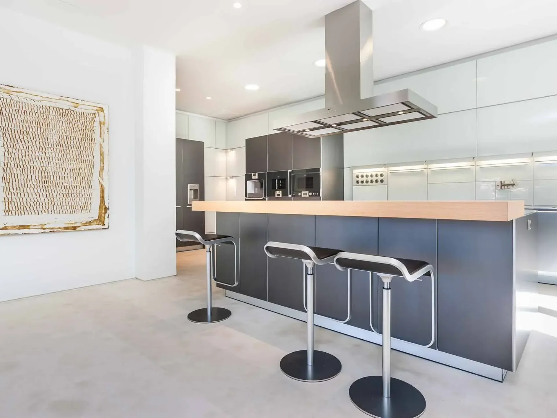 The main residence features four generously sized en-suite bedrooms and a bright open-concept living area anchored by a modern fireplace. A fully equipped high-end kitchen caters perfectly to gourmet dining and private chef experiences. A striking architectural glass staircase and private elevator provide smooth access to every level, including panoramic terraces and an impressive rooftop solarium offering sweeping 360-degree coastal views.