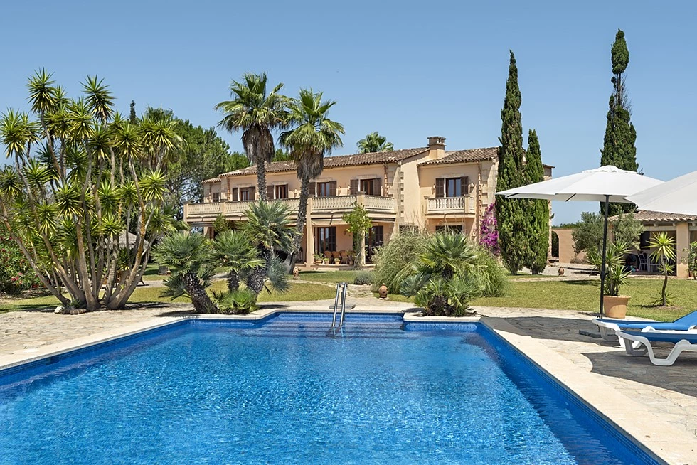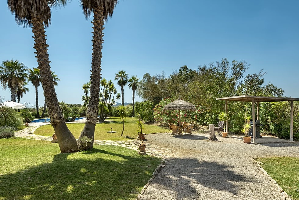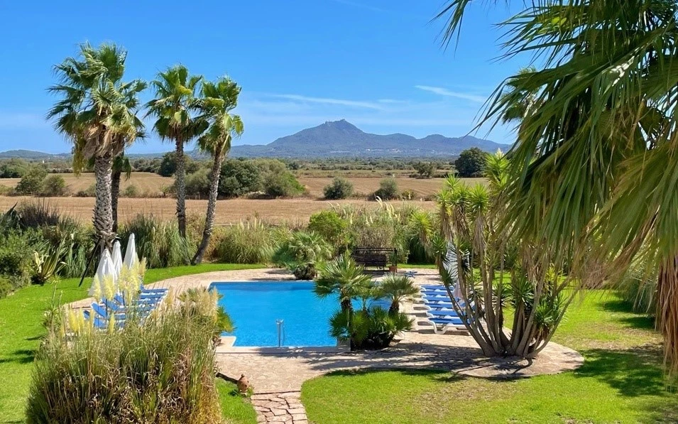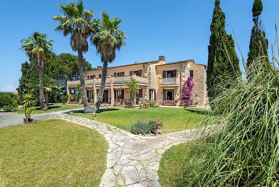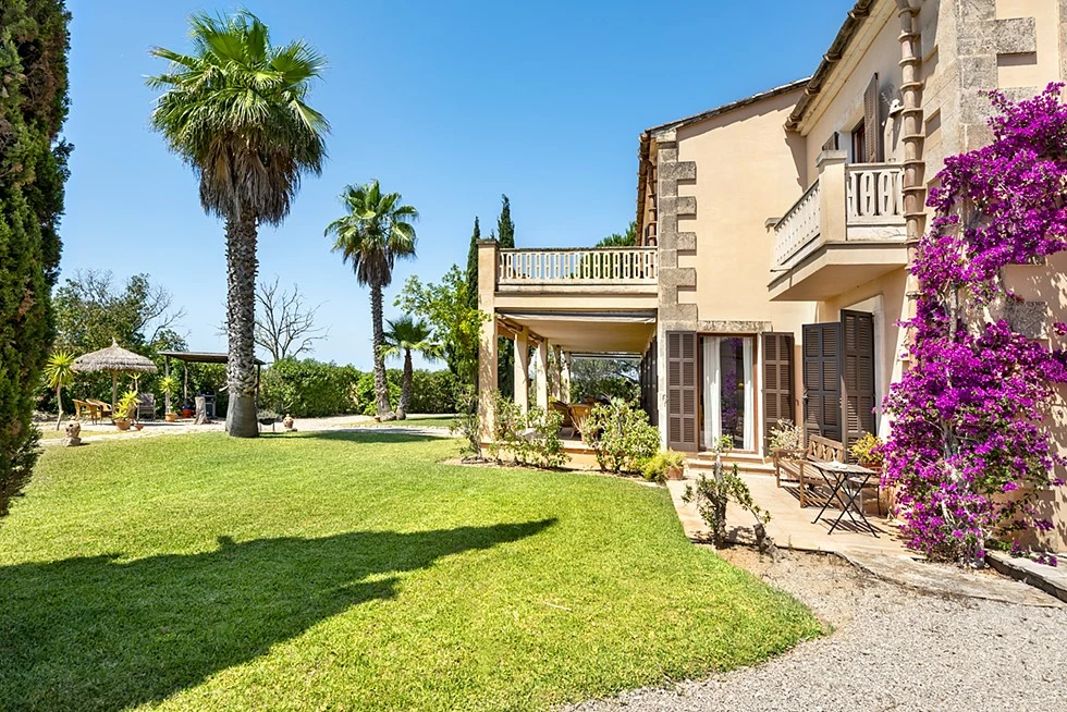 Outside, the property features a 6 x 12-meter pool framed by a natural stone terrace. The grounds are landscaped with lush lawns, mature trees, palms, and typical Mallorcan vegetation, creating a peaceful, park-like setting.