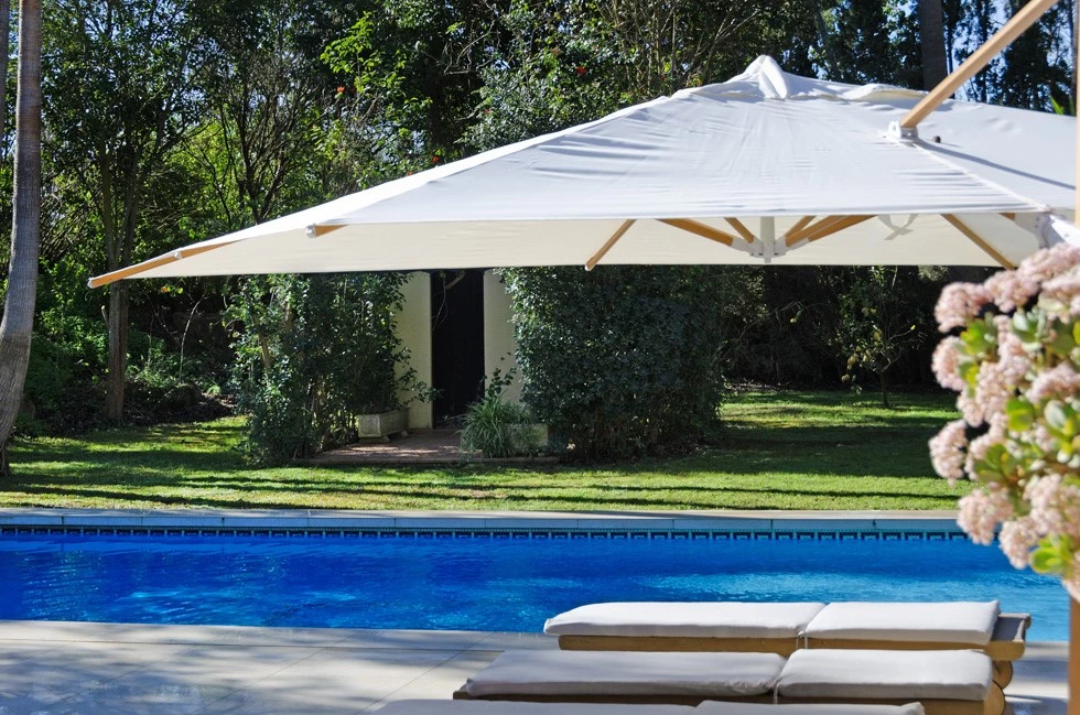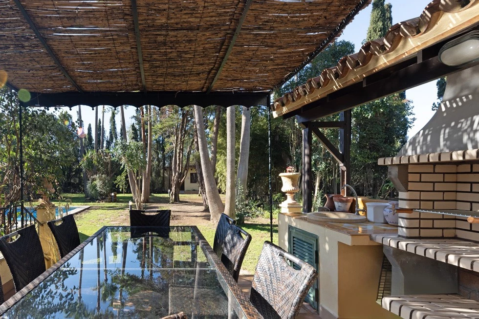 Outdoors, the property excels in entertainment and relaxation, with covered and open terraces, a BBQ with summer kitchen, and a beautifully landscaped garden filled with palm trees, lawns, water features, and a pond. A 5 x 10 m swimming pool enhances the setting, while a flat 5,000 m² section of land is ideal for horses, orchards, or vineyards.